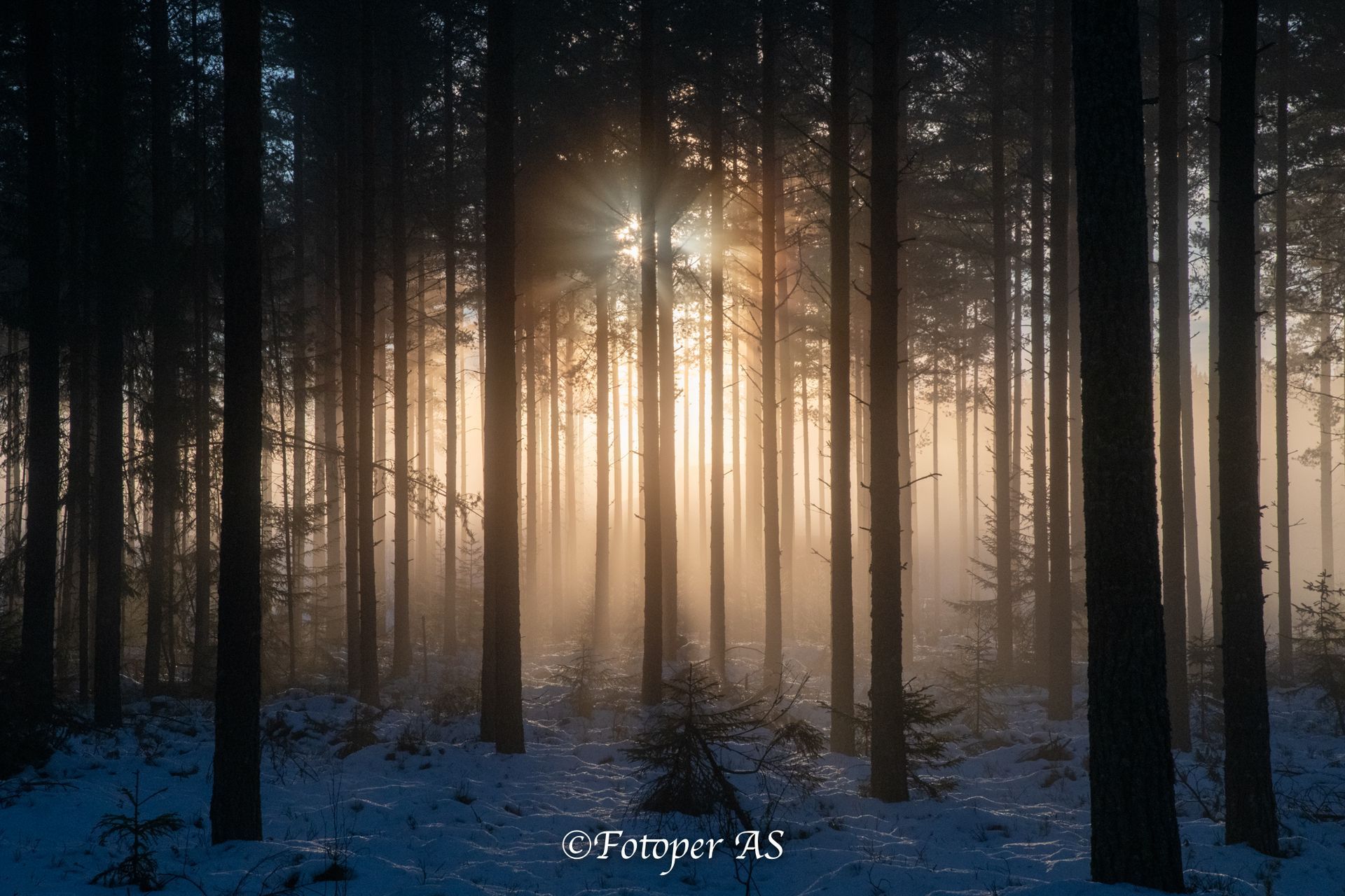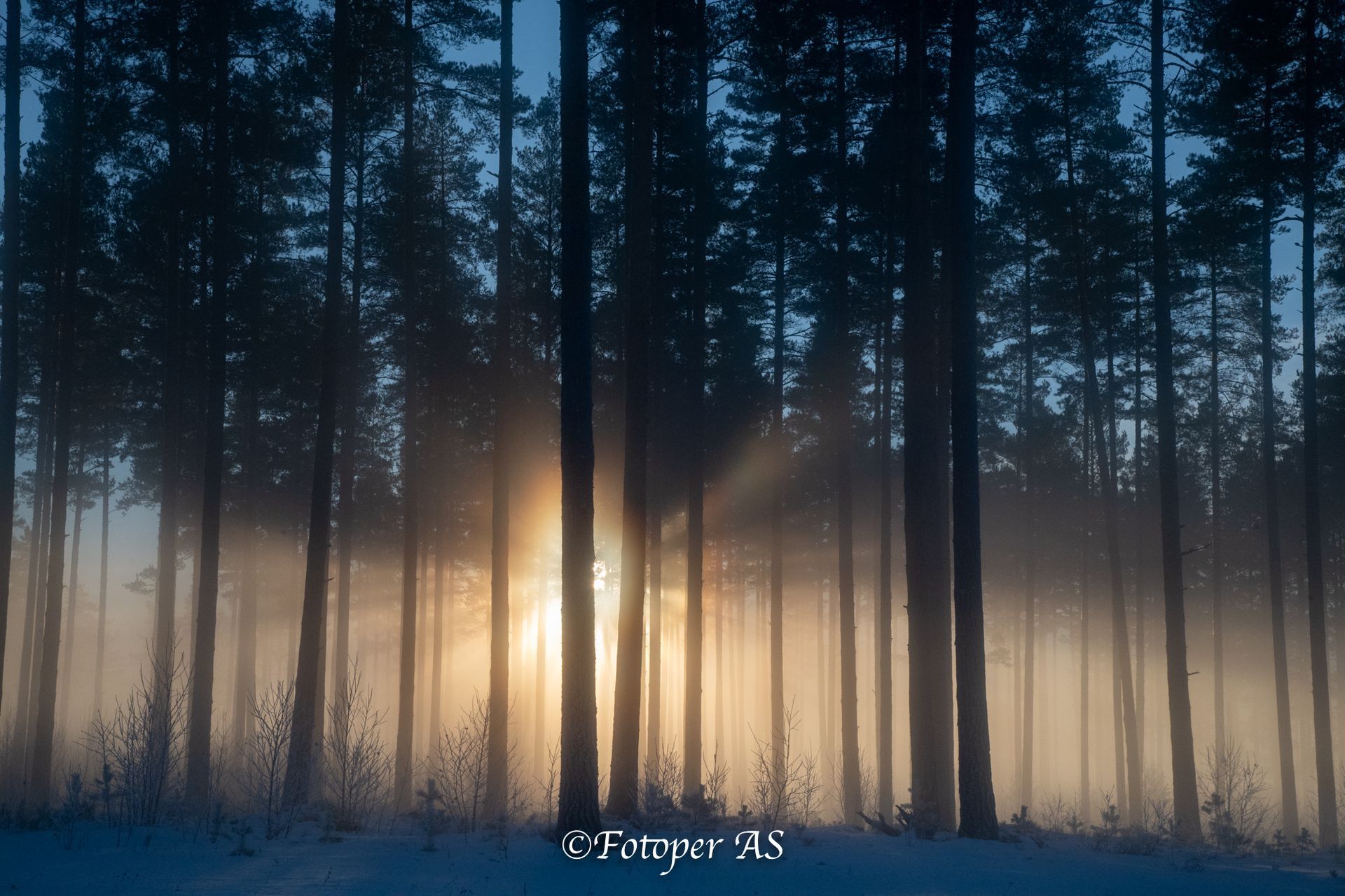Bare i løpet av noen dager har vi hatt mye skiftende vær. Forleden dag var det tåke på Eggemoen da jeg kjørte til Jevnaker på formiddagen. Da jeg kom tilbake et par timer senere hadde sola begynt å krangle med tåka. Sola stakk gjennom flere steder. Jeg fikk gjemt sola bak noen trær, og da ble det flotte forhold for sol-/tåkebilder.