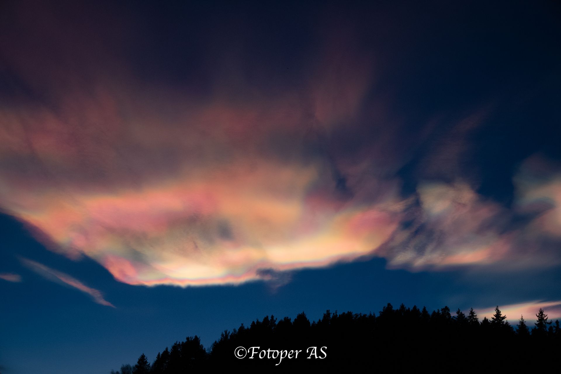Så - bare et par dager etter sol og tåke, ser jeg at det er noen skyer om morgenen som ligner på perlemorskyer. Men det er ikke noe farger å se i dem, de er bare hvite. På ettermiddagen skjer det. Det er flere perlemorskyer å se, nå med farge. De bretter seg ut og er så vakre.