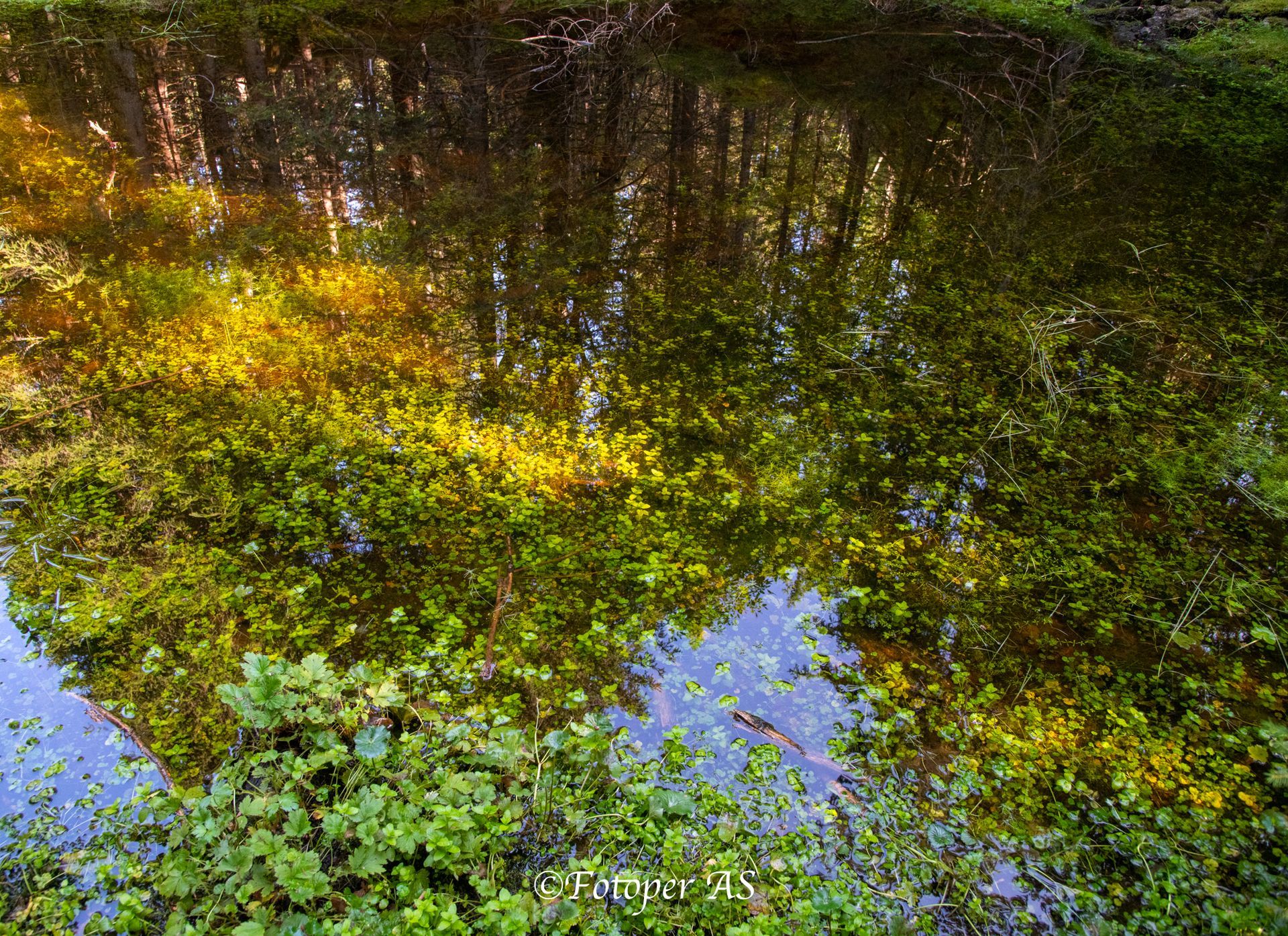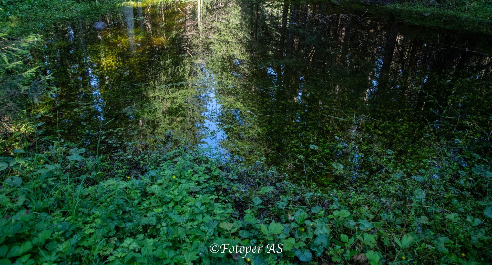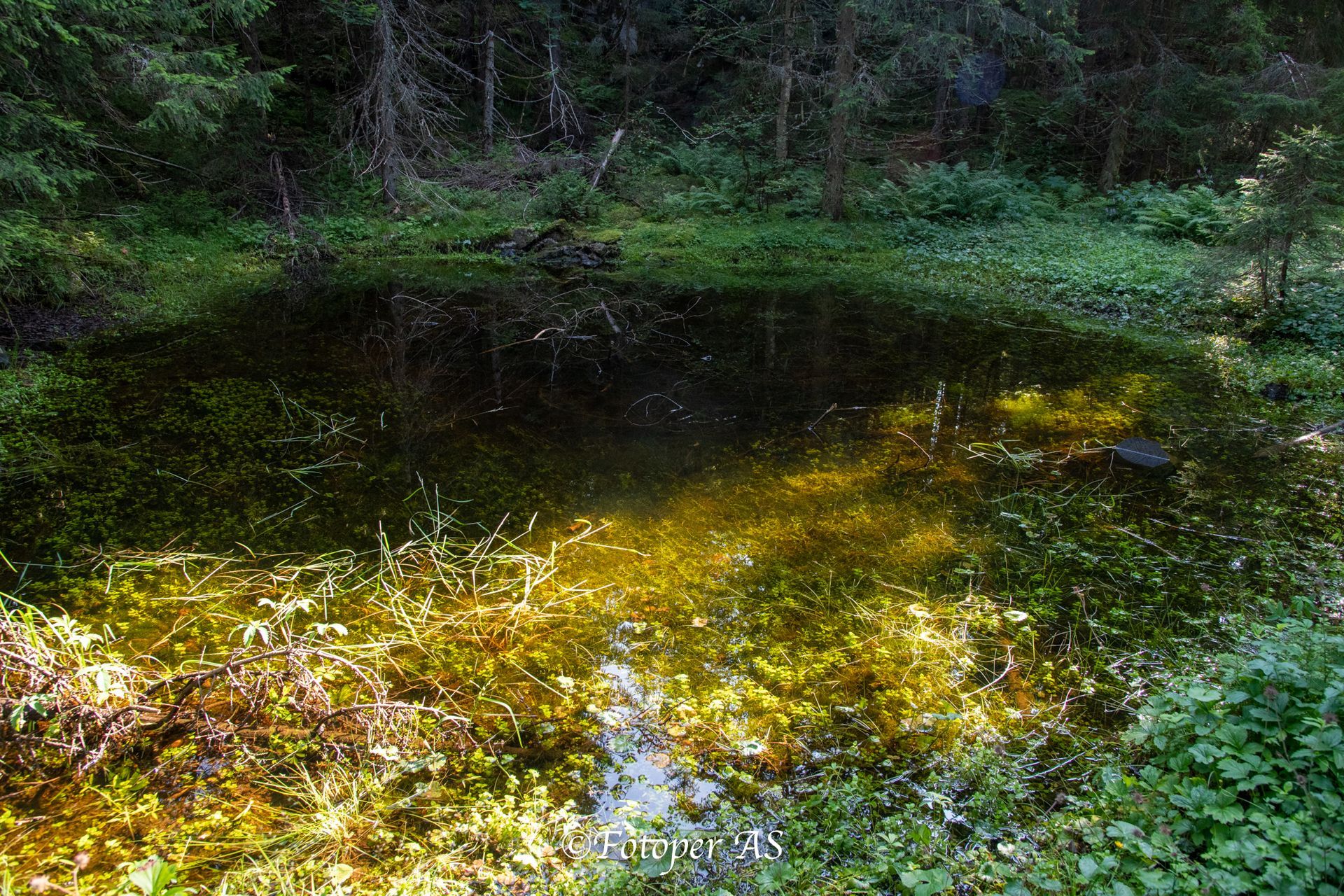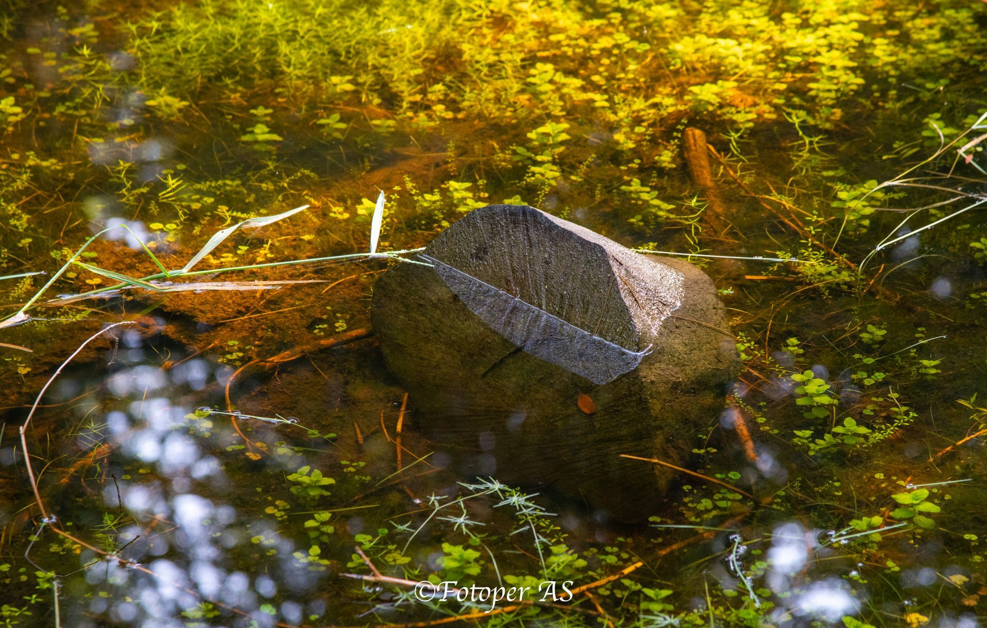 Ved utløpet av en liten bekk i ei myr ligger det et lite tjern eller hva det skal kalles når det er så lite. Det jeg liker er de spennende motivene som blir i bunnen av vannet når sola står på som en spotlight.