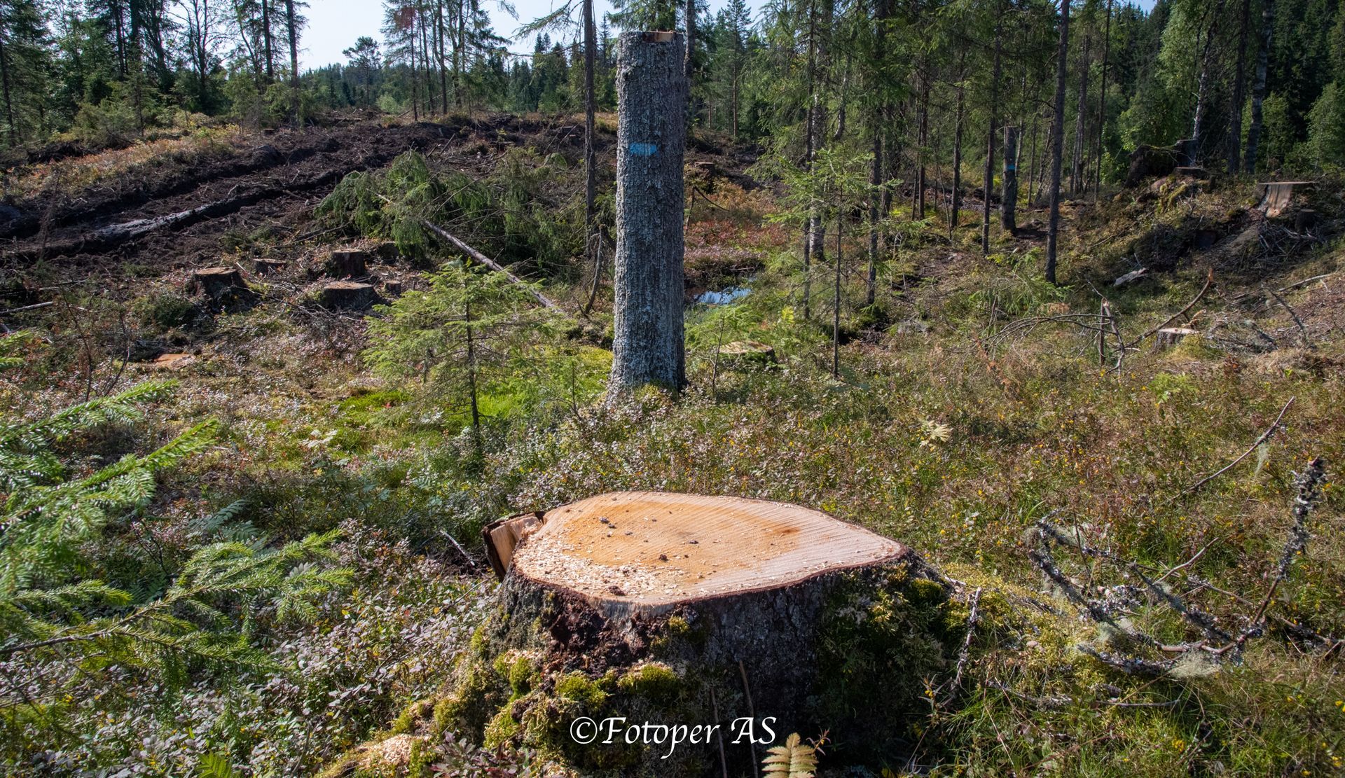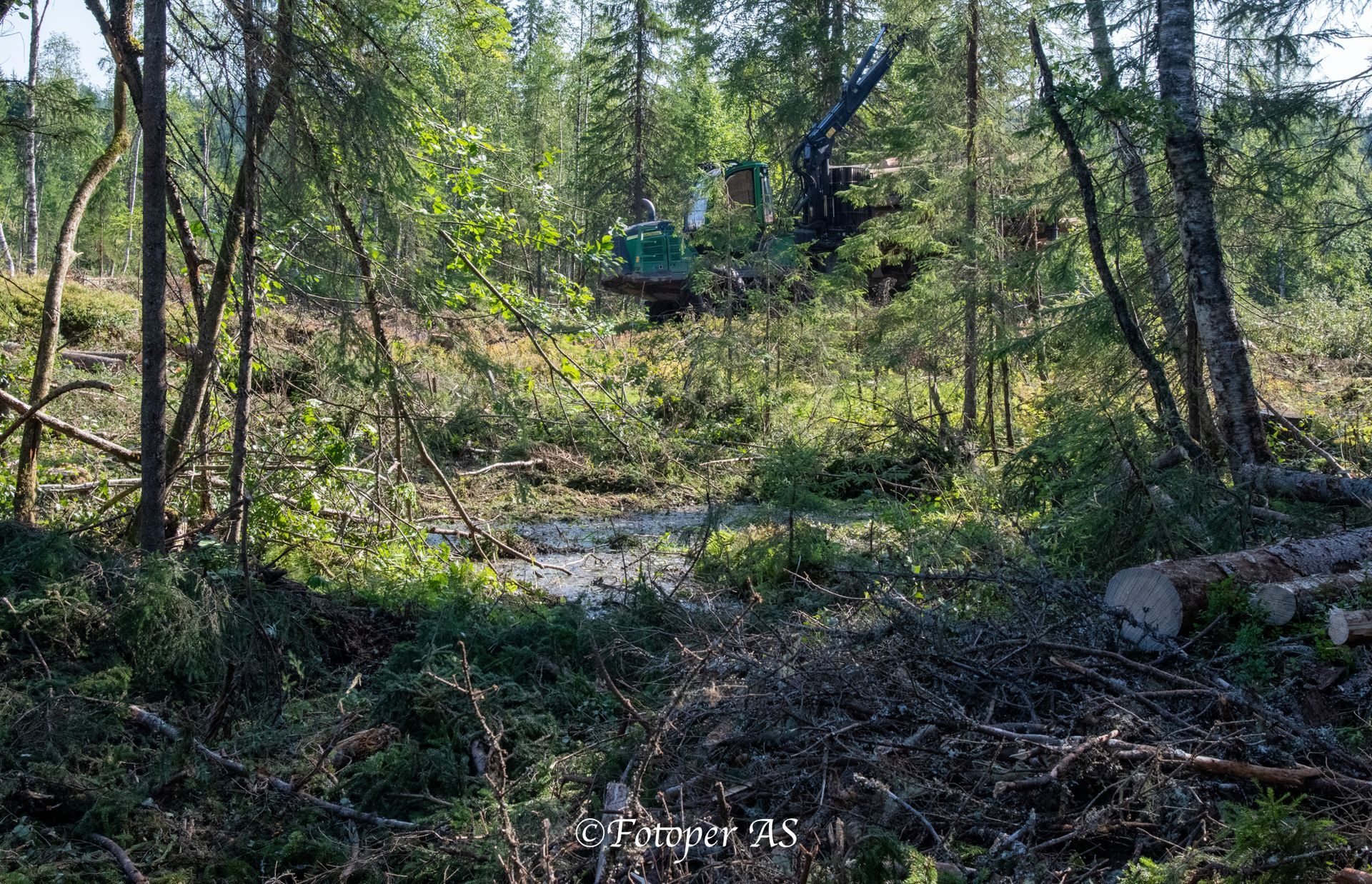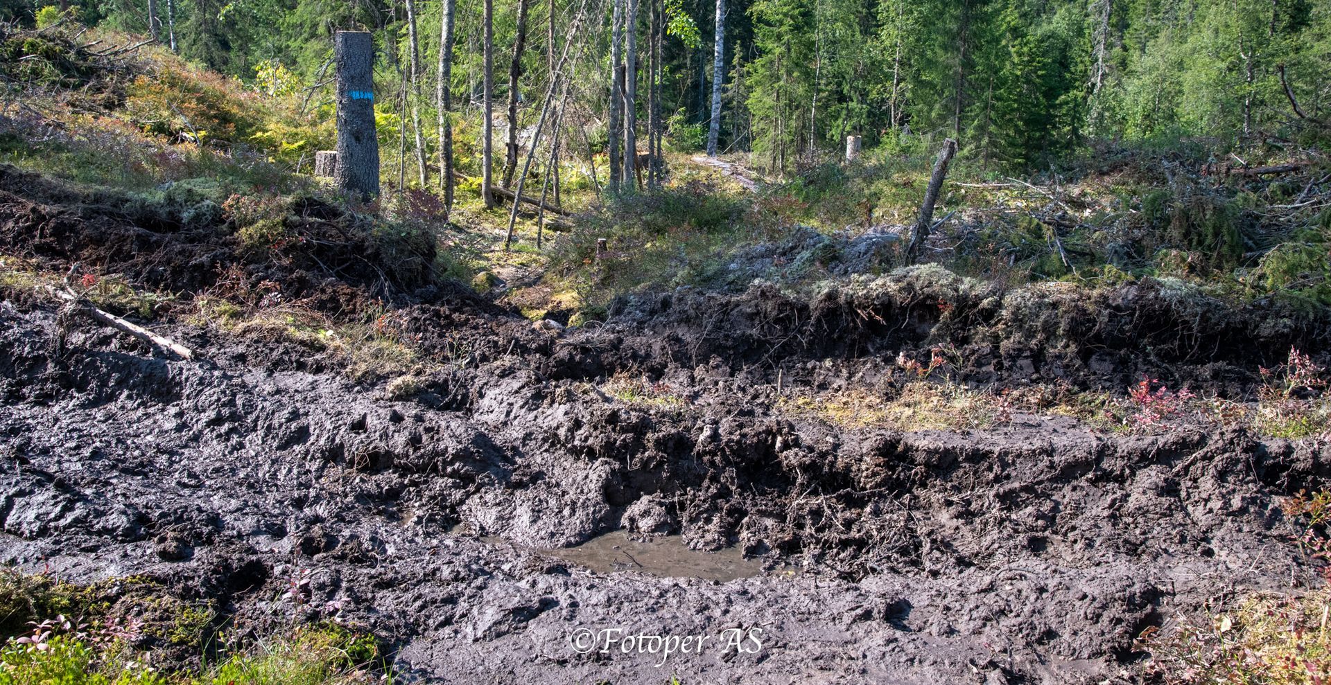 Etter en tid ser jeg en lysning mellom trærne og kommer til et hogstfelt. Ei stor tømmervelte ligger på en plass, klar for transport. Jeg går over brua over Auretjernbekken. Og det er ikke vanskelig å se hvor skogsmaskinene har kjørt. Skjønner at de må kjøre med maskiner, men det blir ikke særlig pent i terrenget. Trøsten er at noen fikser på det når alt er ferdig, og om litt tid er det akseptabelt igjen.