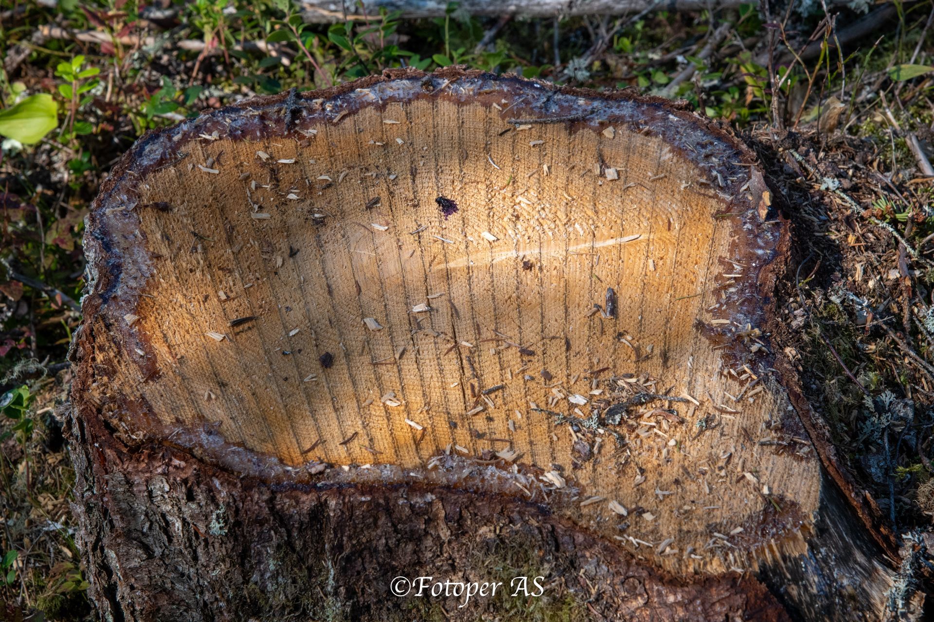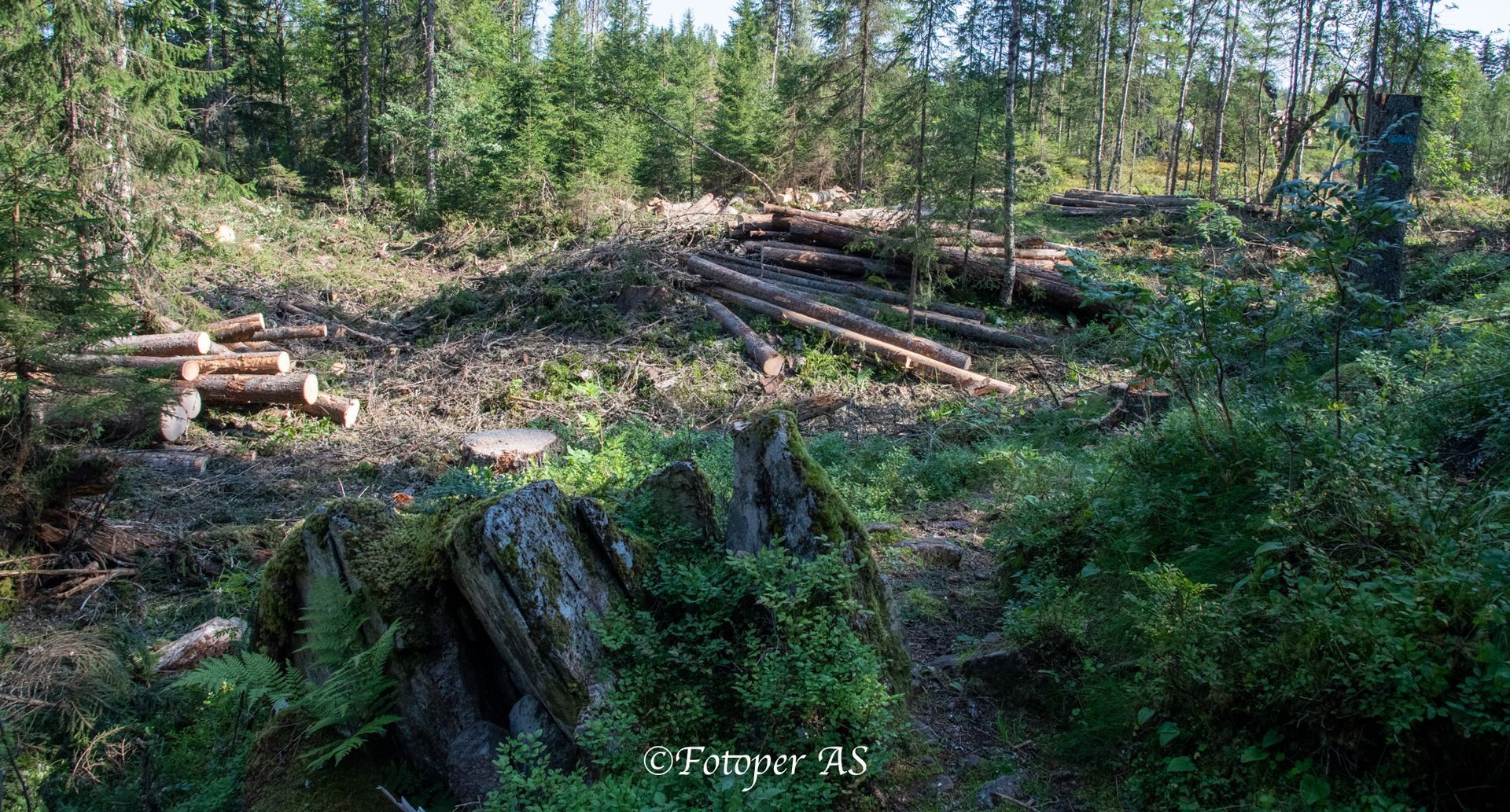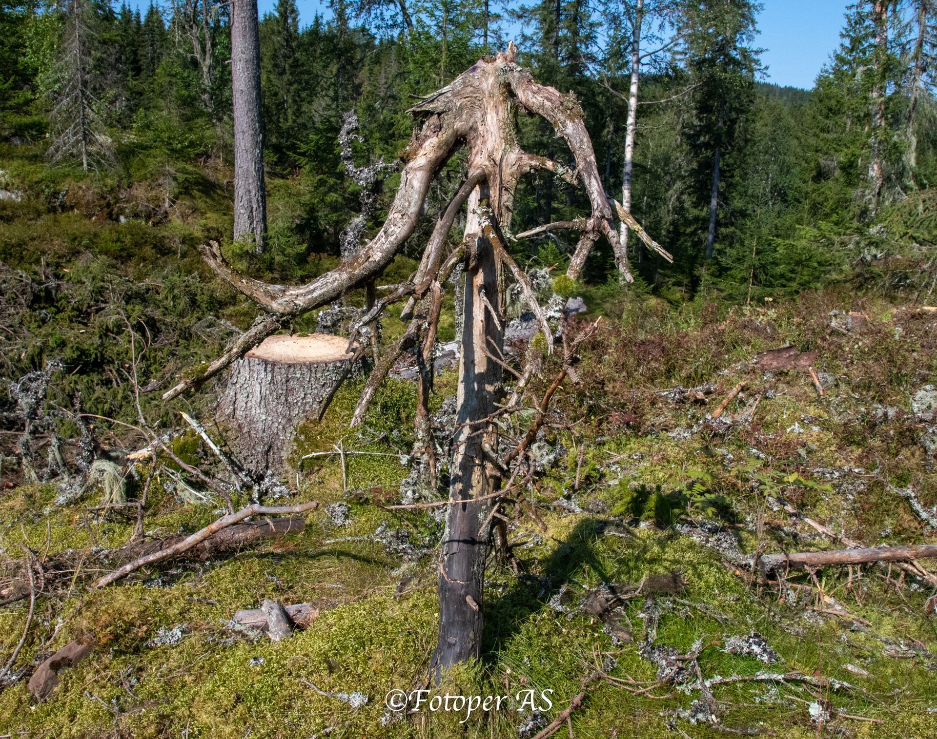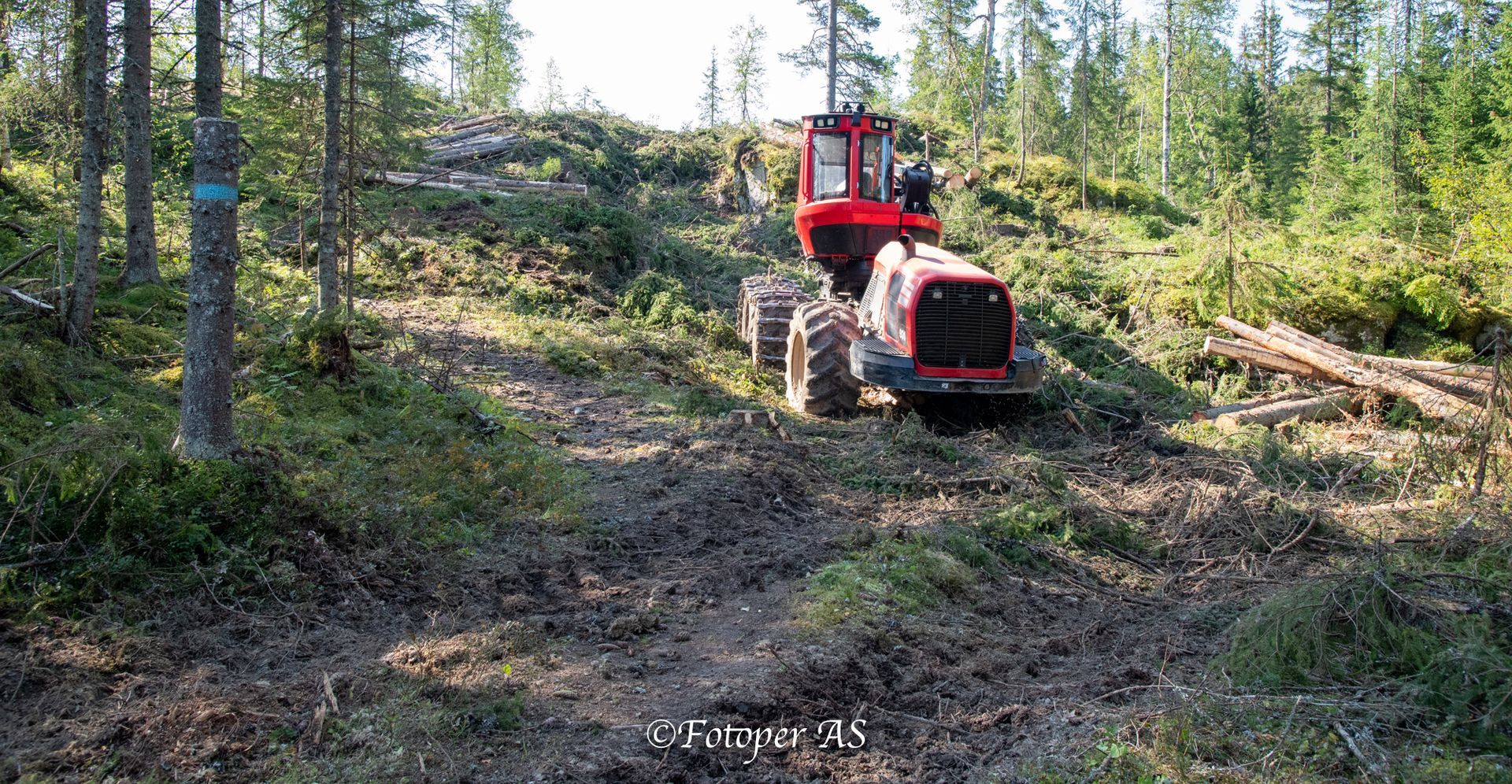 Etter en tid ser jeg en lysning mellom trærne og kommer til et hogstfelt. Ei stor tømmervelte ligger på en plass, klar for transport. Jeg går over brua over Auretjernbekken. Og det er ikke vanskelig å se hvor skogsmaskinene har kjørt. Skjønner at de må kjøre med maskiner, men det blir ikke særlig pent i terrenget. Trøsten er at noen fikser på det når alt er ferdig, og om litt tid er det akseptabelt igjen.