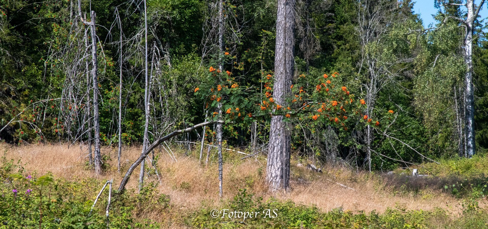 Kommer til Kneikasetra og går oppom den. Synd at hytta står og forfaller. Like ved er det et stort rognetre, tynget ned av rogn. Blir det mye snø til vinteren eller ikke?