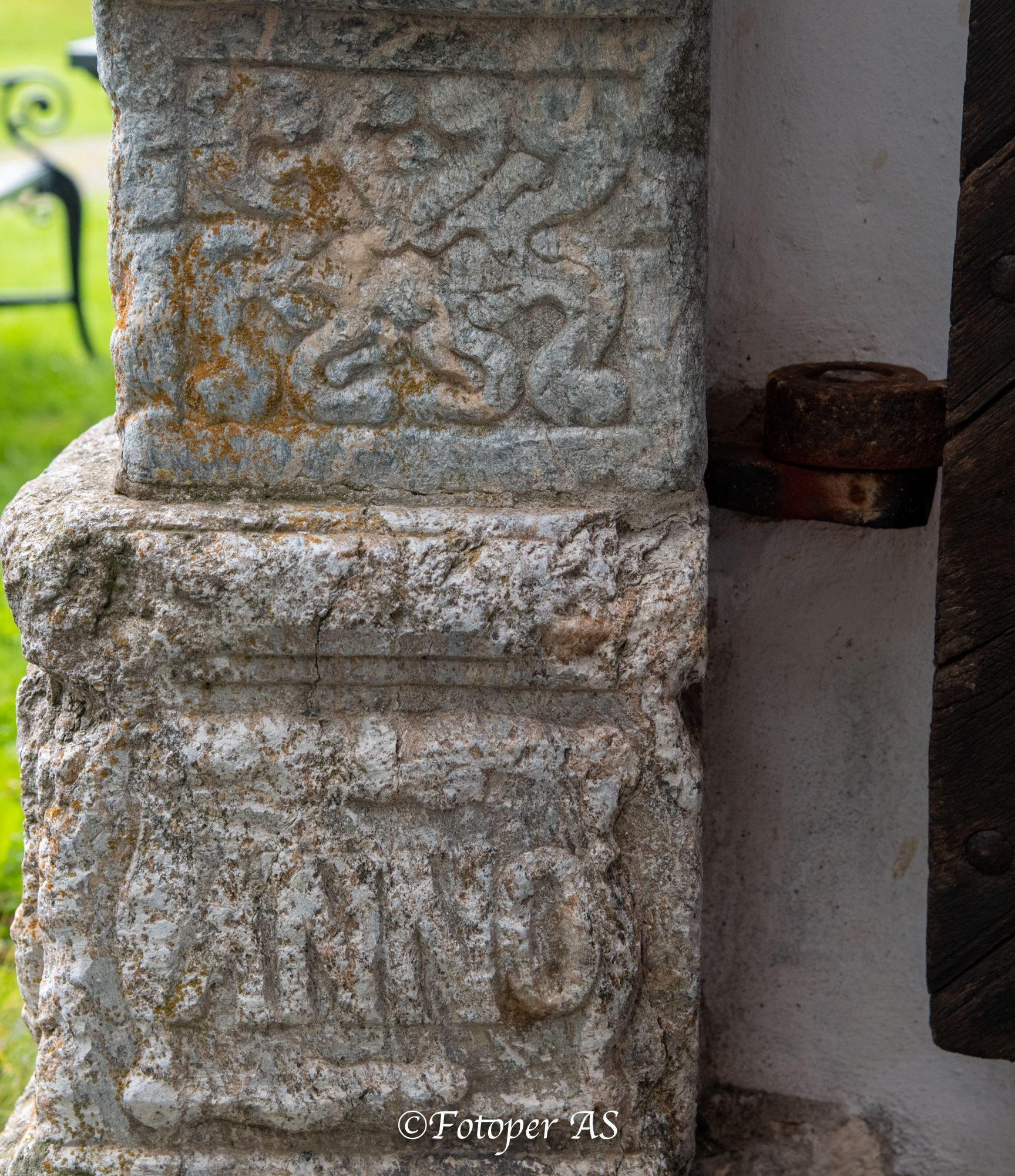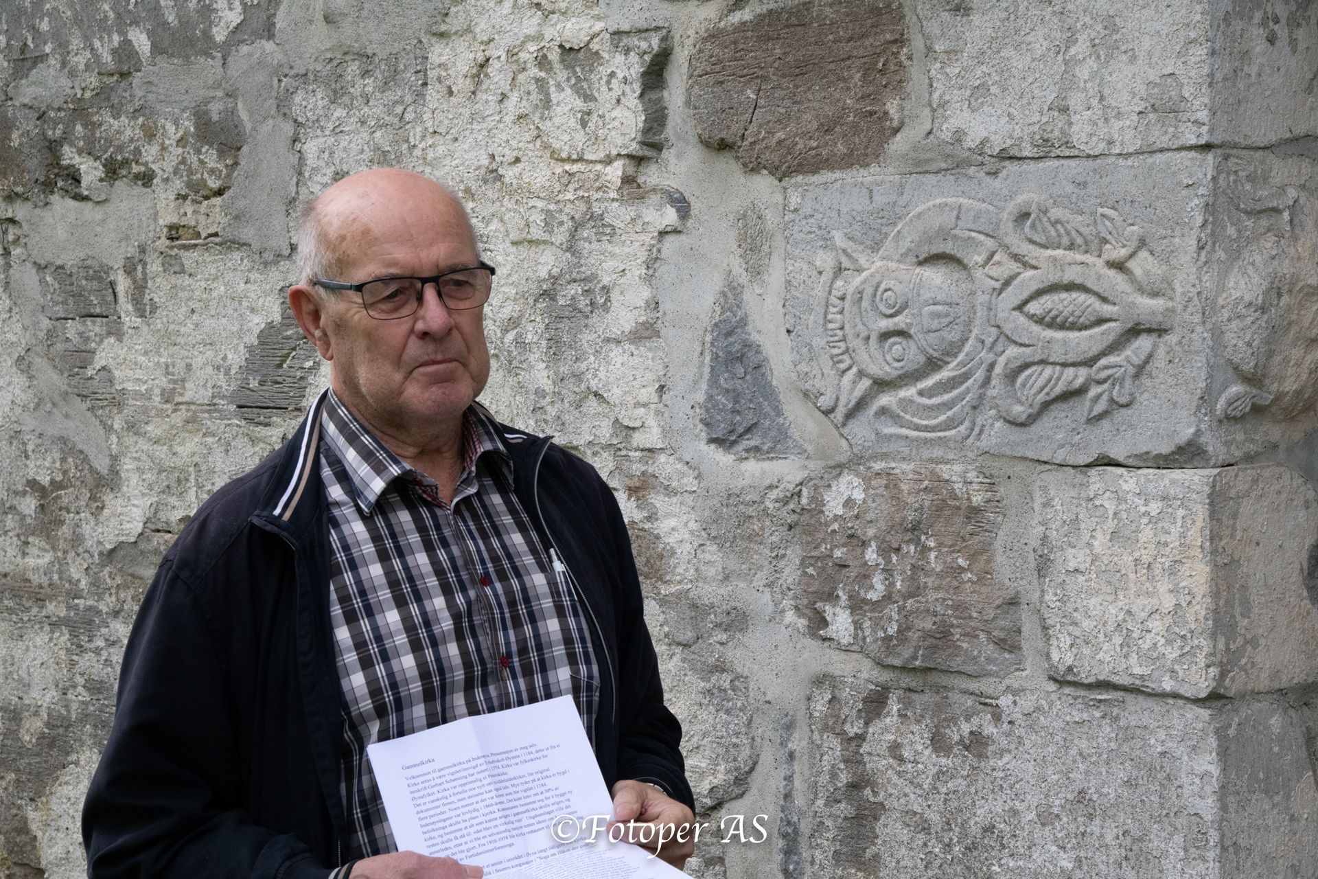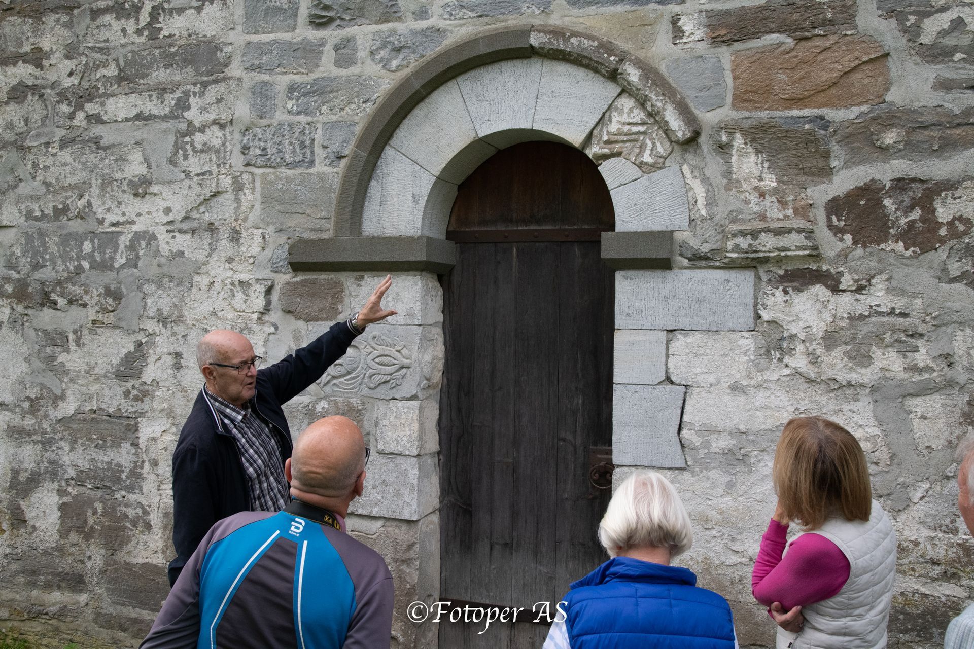 Det er tid for å komme seg videre til avtalt guiding i Sakshaug gamle kirke. Kirka er under restaurering og halve sida har stillaser og er pakket inn i presenning. Guiden vår er oppvokst på gården ved siden av kirka, og kan sin historie. Kirka er ei steinkirke fra 1100-tallet, bygd i normannisk stil med noen gotiske trekk etter ombygging på 1200-tallet. Kirka ligger på ei bratt og vanskelig tomt, kanskje fordi det har vært ei trekirke her før. Grunnet det skrå terrenget begynte fundamentet å svikte, og på 1200- eller 1300-tallet ble det reist støttemurer. Fortsatt er sørveggen en halv meter ute av lodd.