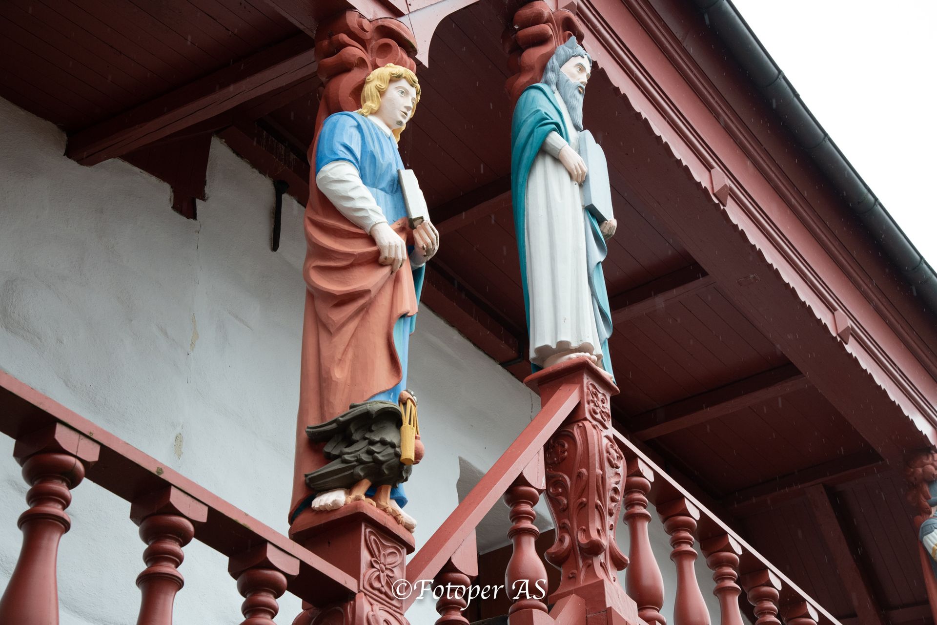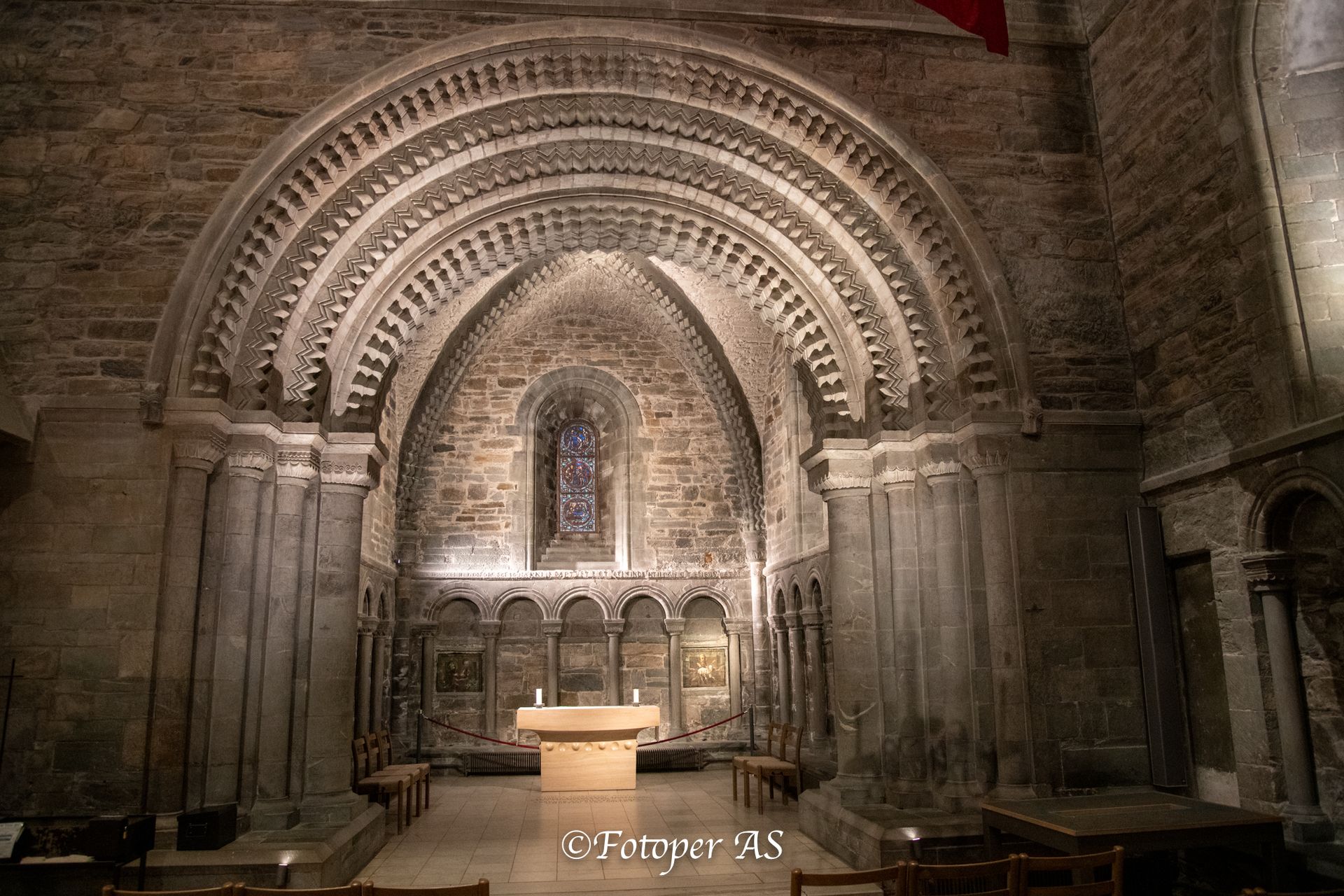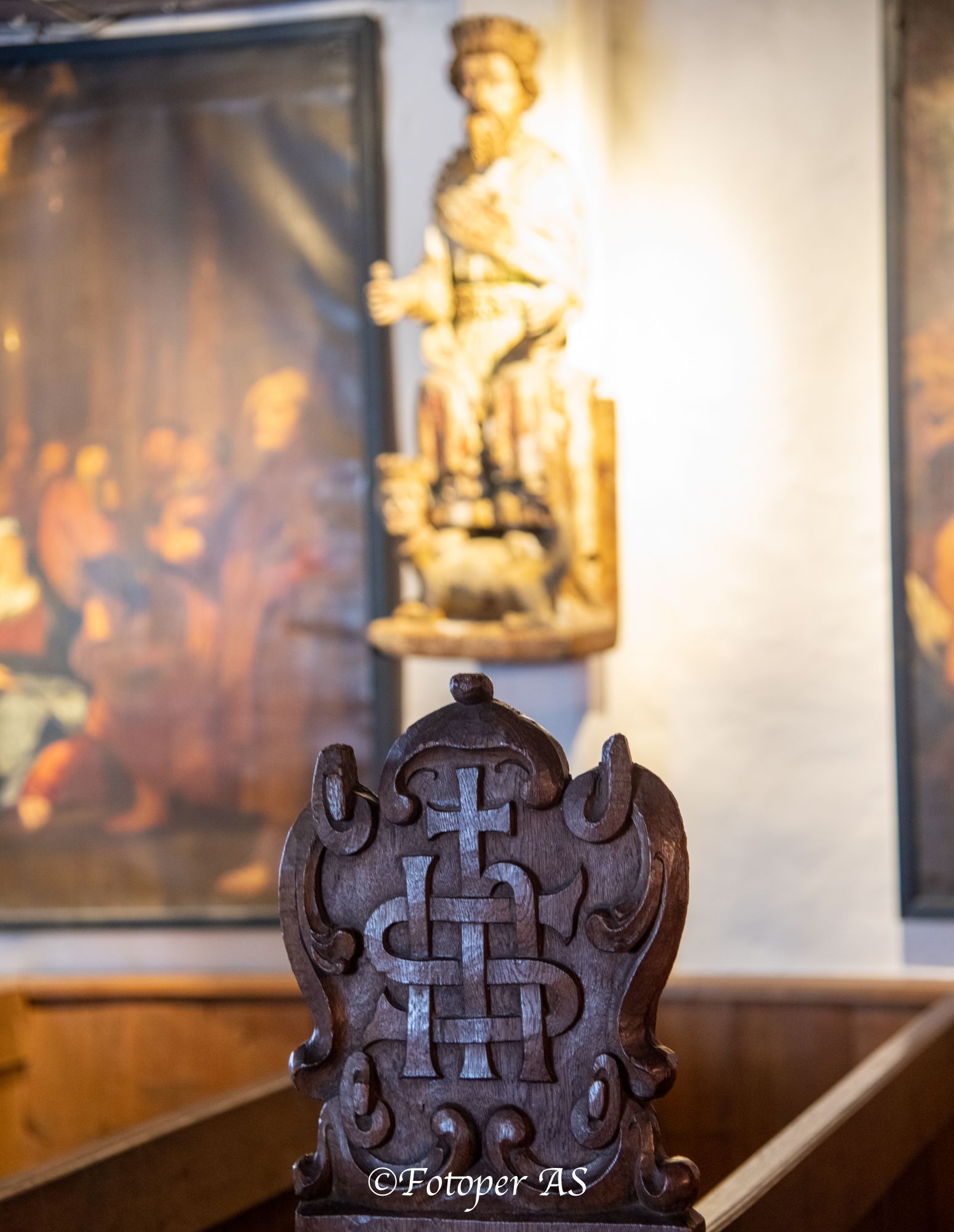Det er tid for å komme seg videre til avtalt guiding i Sakshaug gamle kirke. Kirka er under restaurering og halve sida har stillaser og er pakket inn i presenning. Guiden vår er oppvokst på gården ved siden av kirka, og kan sin historie. Kirka er ei steinkirke fra 1100-tallet, bygd i normannisk stil med noen gotiske trekk etter ombygging på 1200-tallet. Kirka ligger på ei bratt og vanskelig tomt, kanskje fordi det har vært ei trekirke her før. Grunnet det skrå terrenget begynte fundamentet å svikte, og på 1200- eller 1300-tallet ble det reist støttemurer. Fortsatt er sørveggen en halv meter ute av lodd.