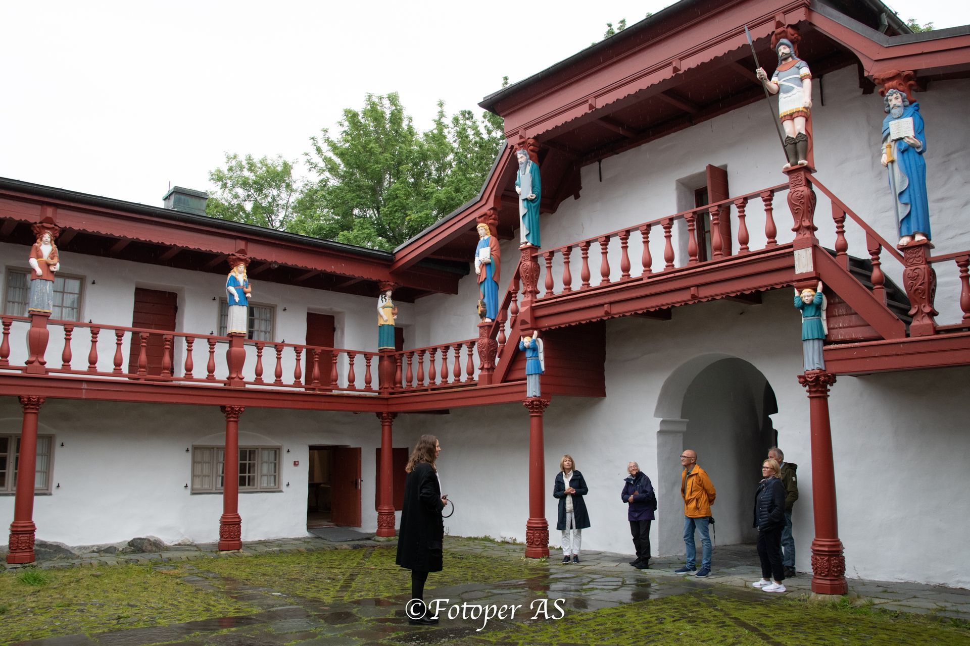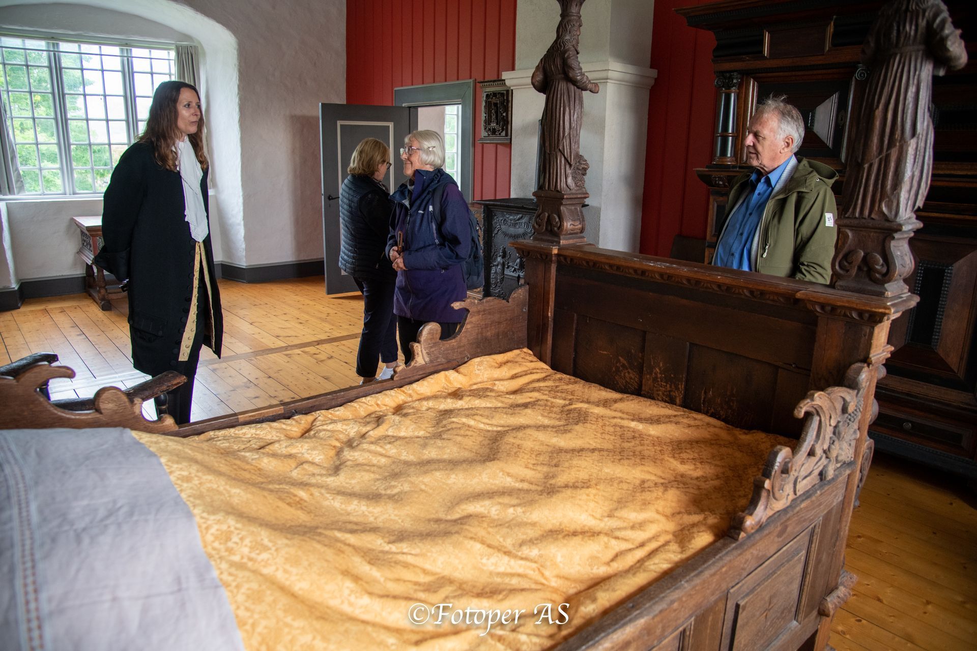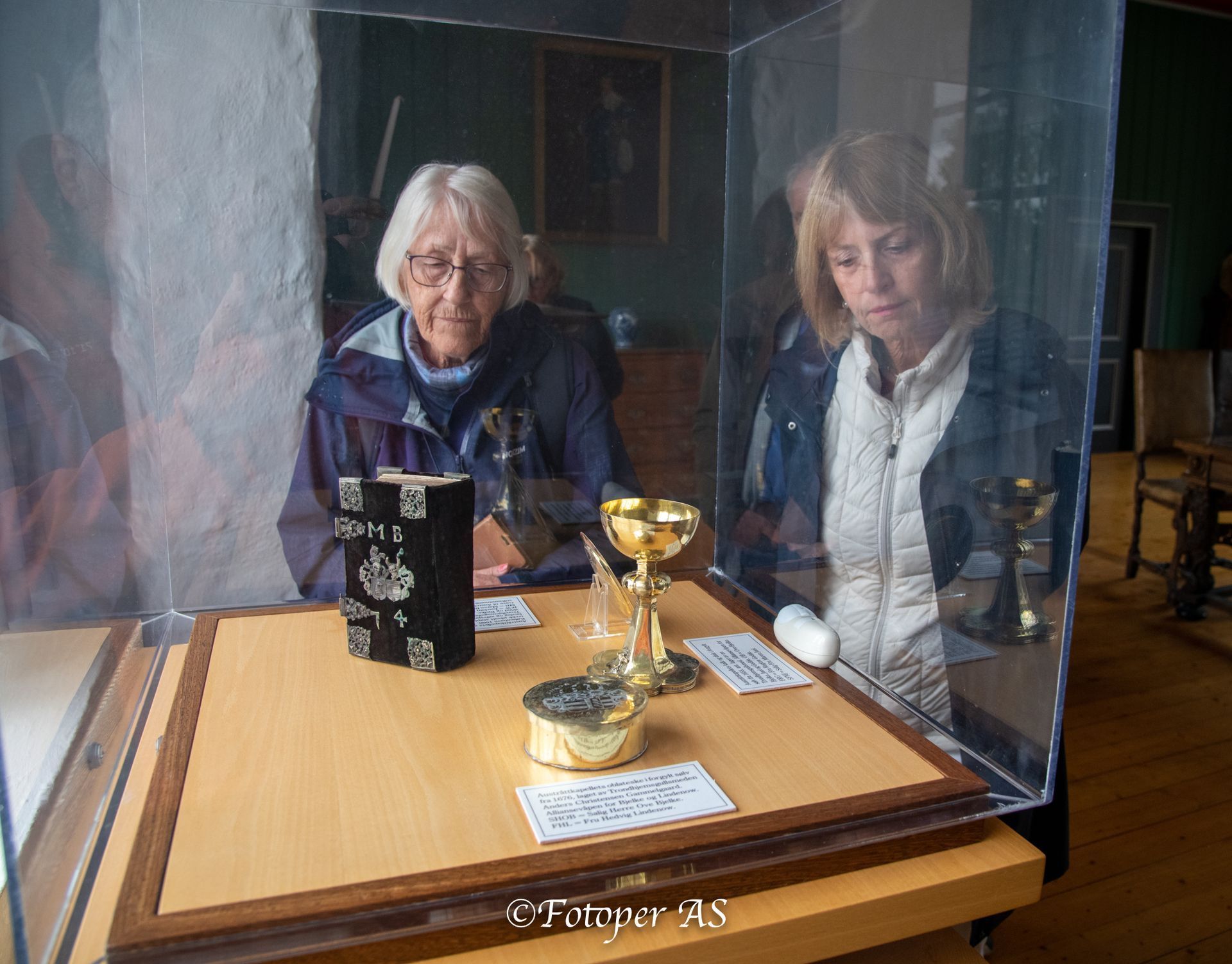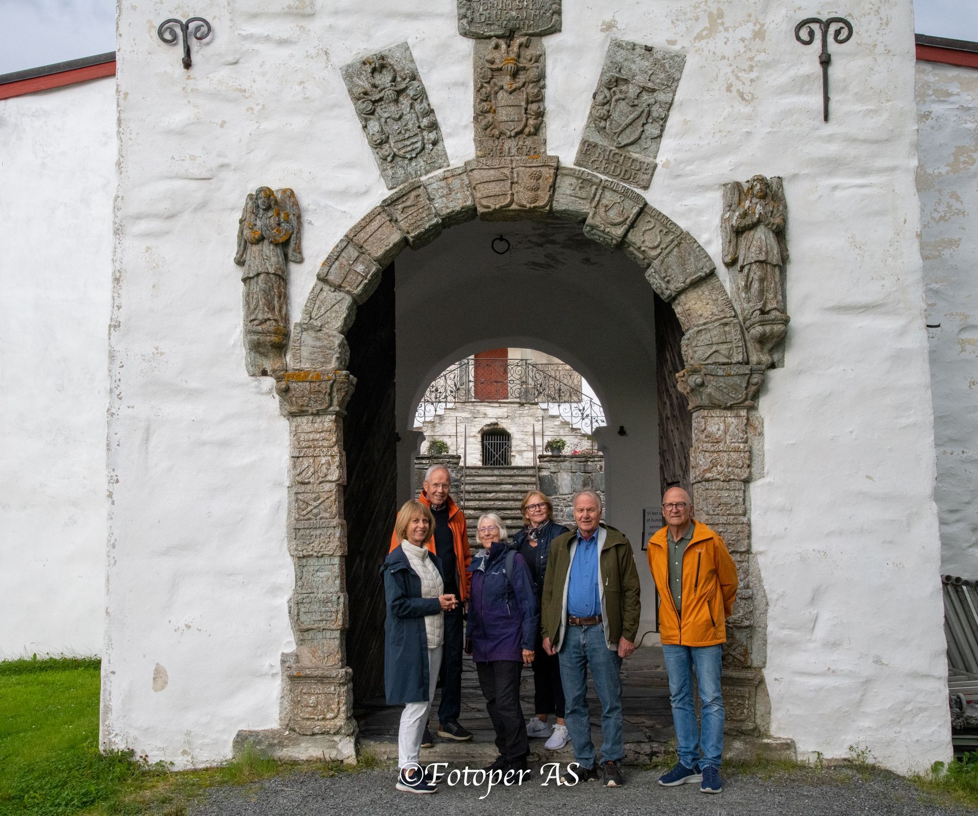 Vårt første besøk på land er Austråttborgen, hvor vi har avtalt omvisning. Så kommer hun, guiden, i stilig tidsriktig antrekk, og ønsker oss velkommen. Og hun har med et nøkkelknippe med solide nøkler hun skal bruke. Vi starter ute i duskregnet, før vi går inn i borggården og får vite enda mer om stedet. Austrått er en herregård fra 1000-tallet, og har vært bosted for flere personer i norsk historie. Familien Bjelke er blant de eierne som har markert seg mest. Men også Inger Ottesdatter (Inger til Austrått) er et kjent navn knyttet til borgen. I 1916 brant det meste av borgen ned etter et lynnedslag. Men det ble bestemt at den skulle bygges opp igjen, og i 1961 var restaureringen ferdig. Staten eier i dag borgen med Nordenfjeldske Kunstindustrimuseum i Trondheim som forvaltningsorgan. Kirken brukes til gudstjenester og andre kirkelige handlinger i sommerhalvåret. Takk for meget bra guiding, vi lærte mye interessant.