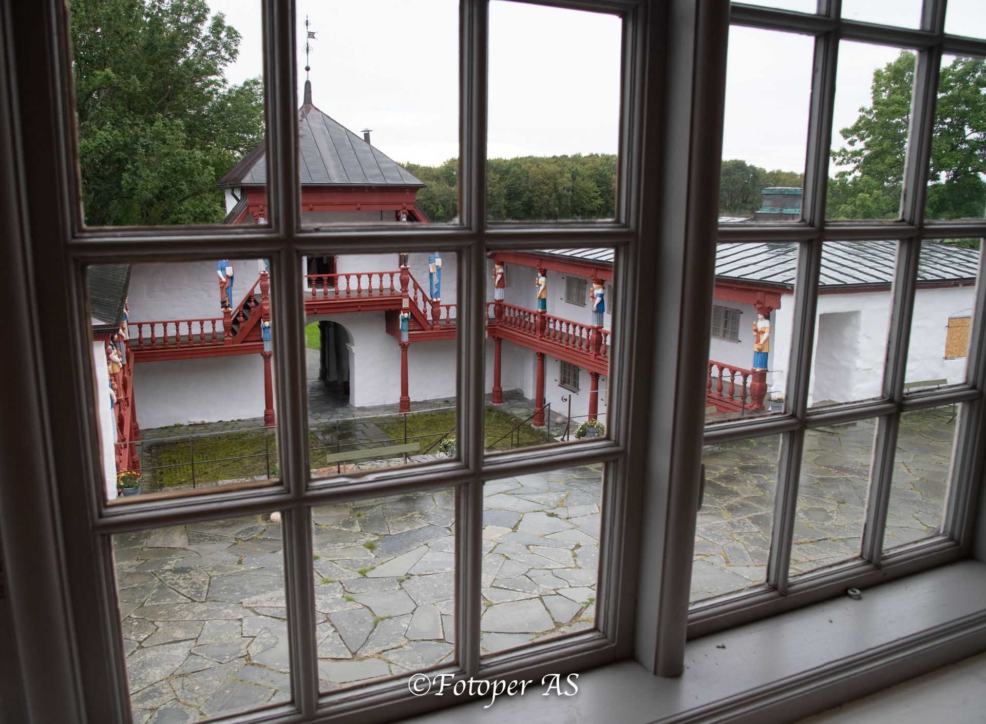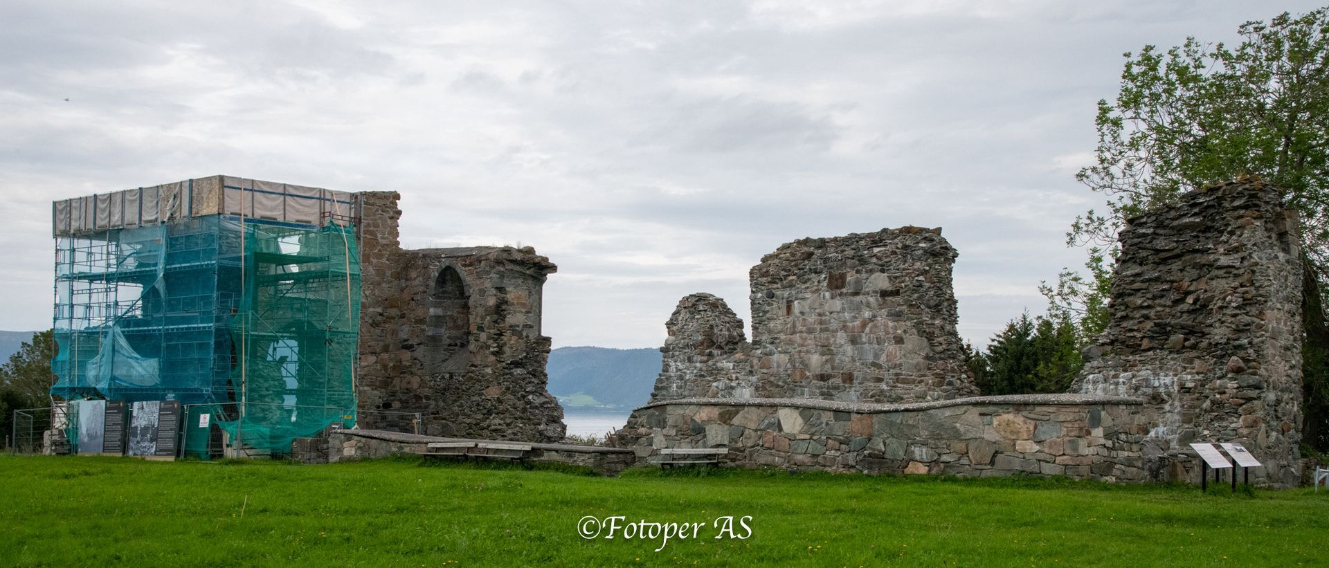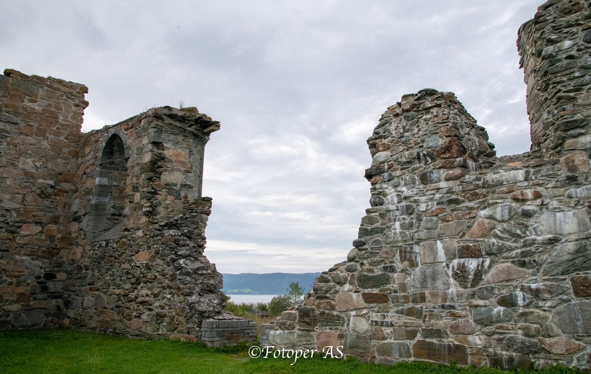 Vårt første besøk på land er Austråttborgen, hvor vi har avtalt omvisning. Så kommer hun, guiden, i stilig tidsriktig antrekk, og ønsker oss velkommen. Og hun har med et nøkkelknippe med solide nøkler hun skal bruke. Vi starter ute i duskregnet, før vi går inn i borggården og får vite enda mer om stedet. Austrått er en herregård fra 1000-tallet, og har vært bosted for flere personer i norsk historie. Familien Bjelke er blant de eierne som har markert seg mest. Men også Inger Ottesdatter (Inger til Austrått) er et kjent navn knyttet til borgen. I 1916 brant det meste av borgen ned etter et lynnedslag. Men det ble bestemt at den skulle bygges opp igjen, og i 1961 var restaureringen ferdig. Staten eier i dag borgen med Nordenfjeldske Kunstindustrimuseum i Trondheim som forvaltningsorgan. Kirken brukes til gudstjenester og andre kirkelige handlinger i sommerhalvåret. Takk for meget bra guiding, vi lærte mye interessant.