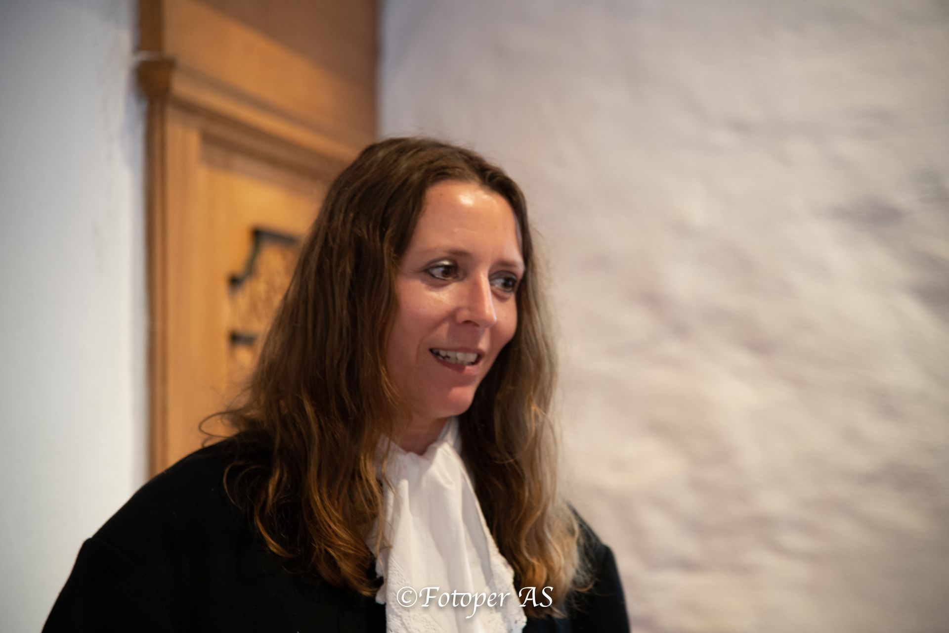 Mens vi sitter ute i hagen og spiser, ser vi plutselig et kjent ansikt. Det er domprost Kristin Moen Saxegård, som også har vært prost i Ringerike. Hun er på et seminar med jobben, men har tid til en hyggelig prat med oss.