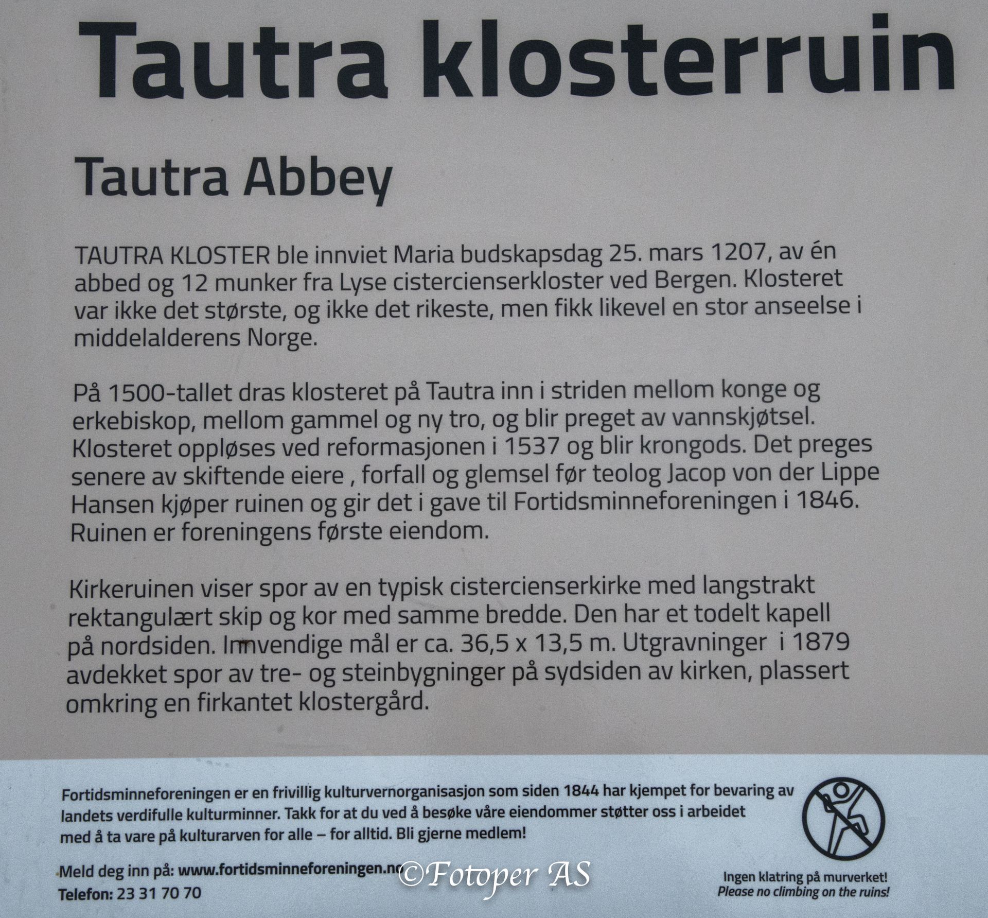 Nå blir det tur fra gammel kirke til gammelt kloster på Tautra. Der skal vi se ruinene av Tautra kloster, som var et cistercienserkloster innviet i 1207. Klosteret har en begivenhetsrik historie, som slutter i 1846 da en mann kjøper det for fem speciedaler og gir det til Fortidsminneforening. Klosteret blir den nystartede foreningens første eiendom.