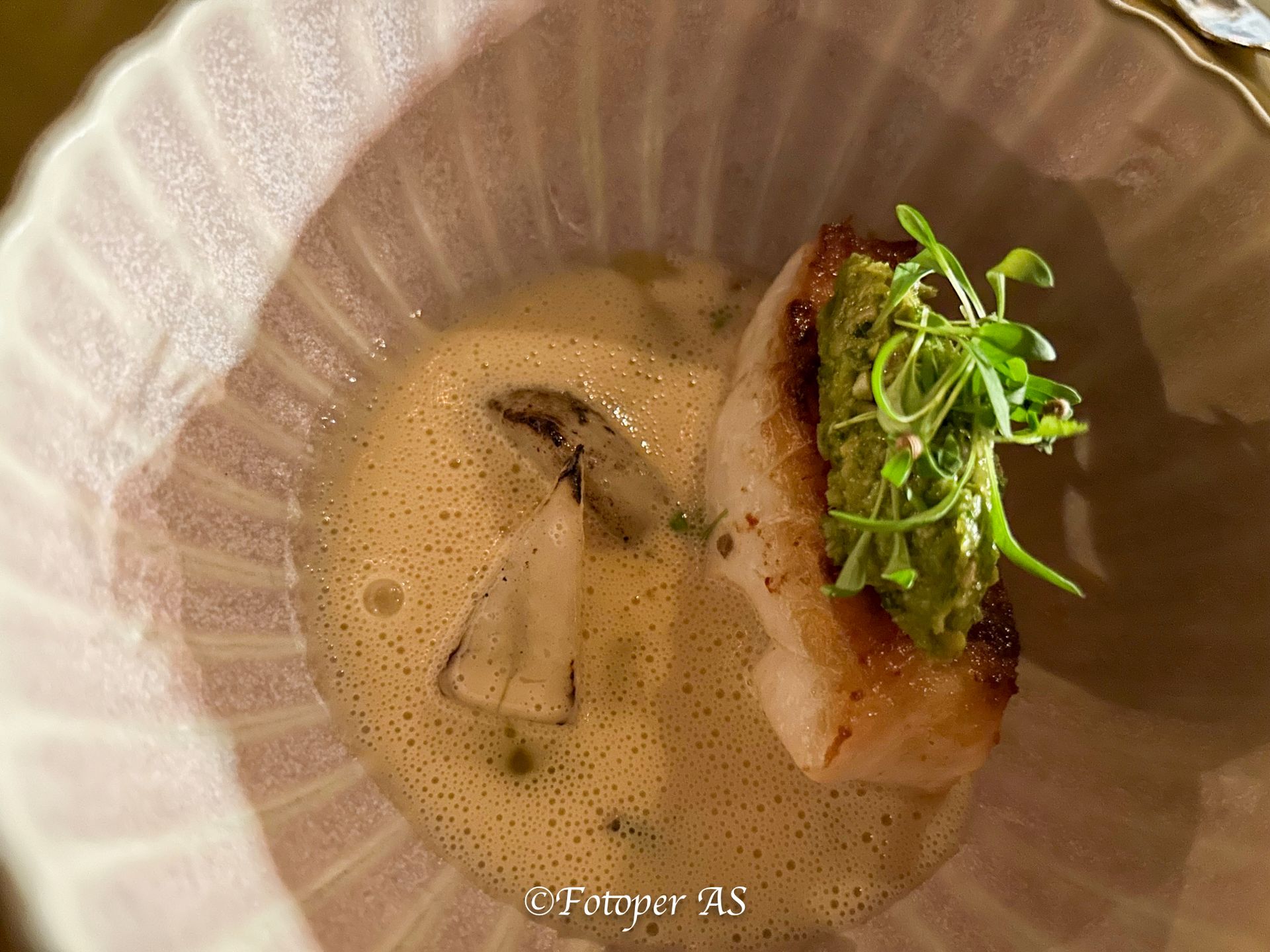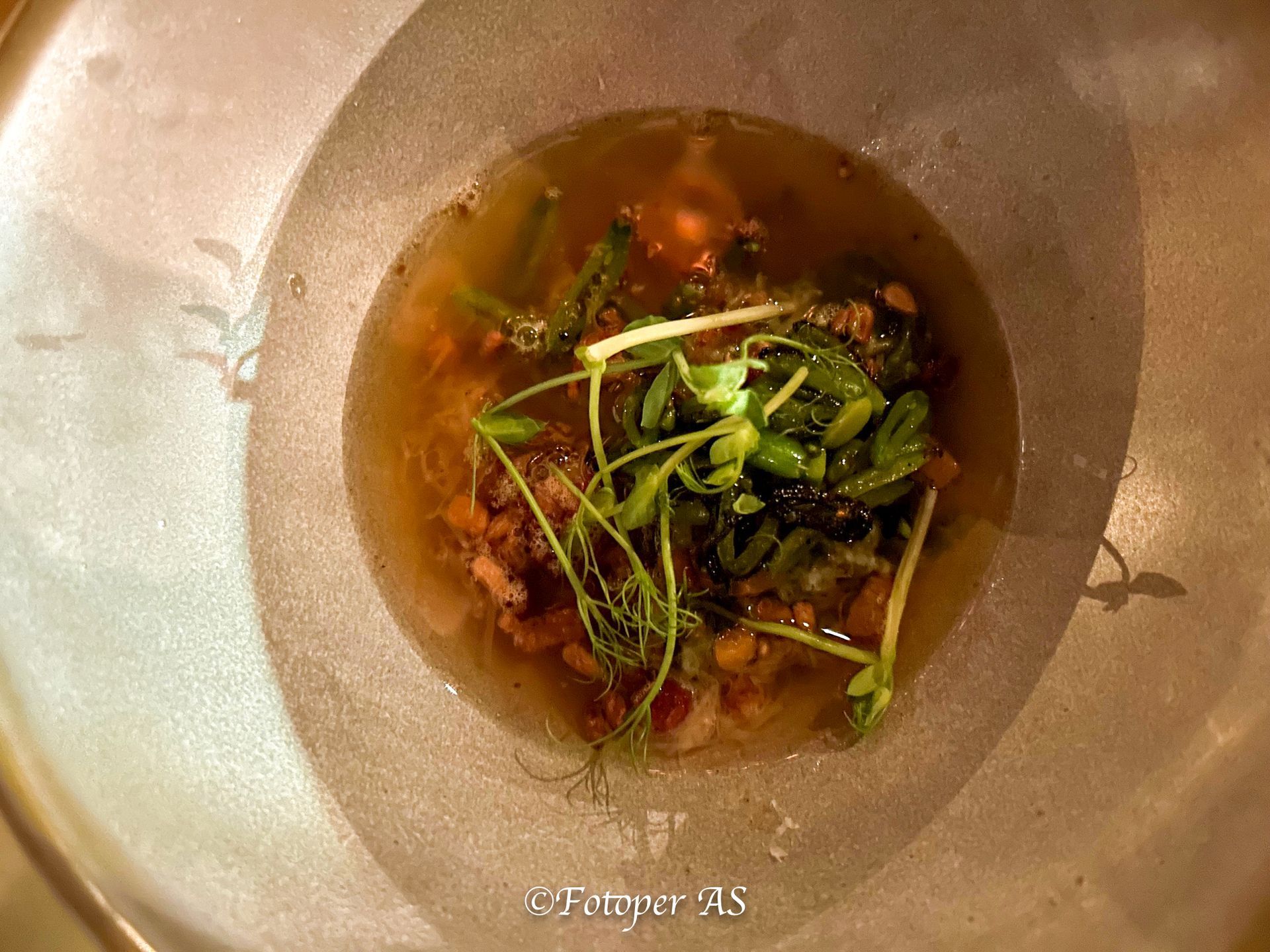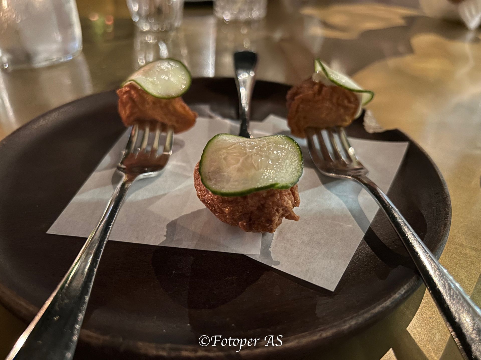 Det er fritt innsyn til kjøkkenet, og vi kan se på mens kokkene klargjør rettene våres. Etter å ha bestilt drikke, er vi klar for å bli overrasket. For hver rett får vi en kort forklaring av kokken på hva vi skal spise. Puffet svinehud, røkt fiskebeinsmajones og urtepulver. Nystekt fiskekake på sei. Nystekt Bulabrød med hummus, chiliolje og sesamfrø. Det er «Oppvarmingsretter» for å få i gang smakssansene, og det smaker utmerket. Vi blir anbefalt en vinpakke med viner som passer til de forskjellige rettene. Vi bestiller halv pakke, det er nok vin til å smake hvor godt vinene og maten passer sammen.