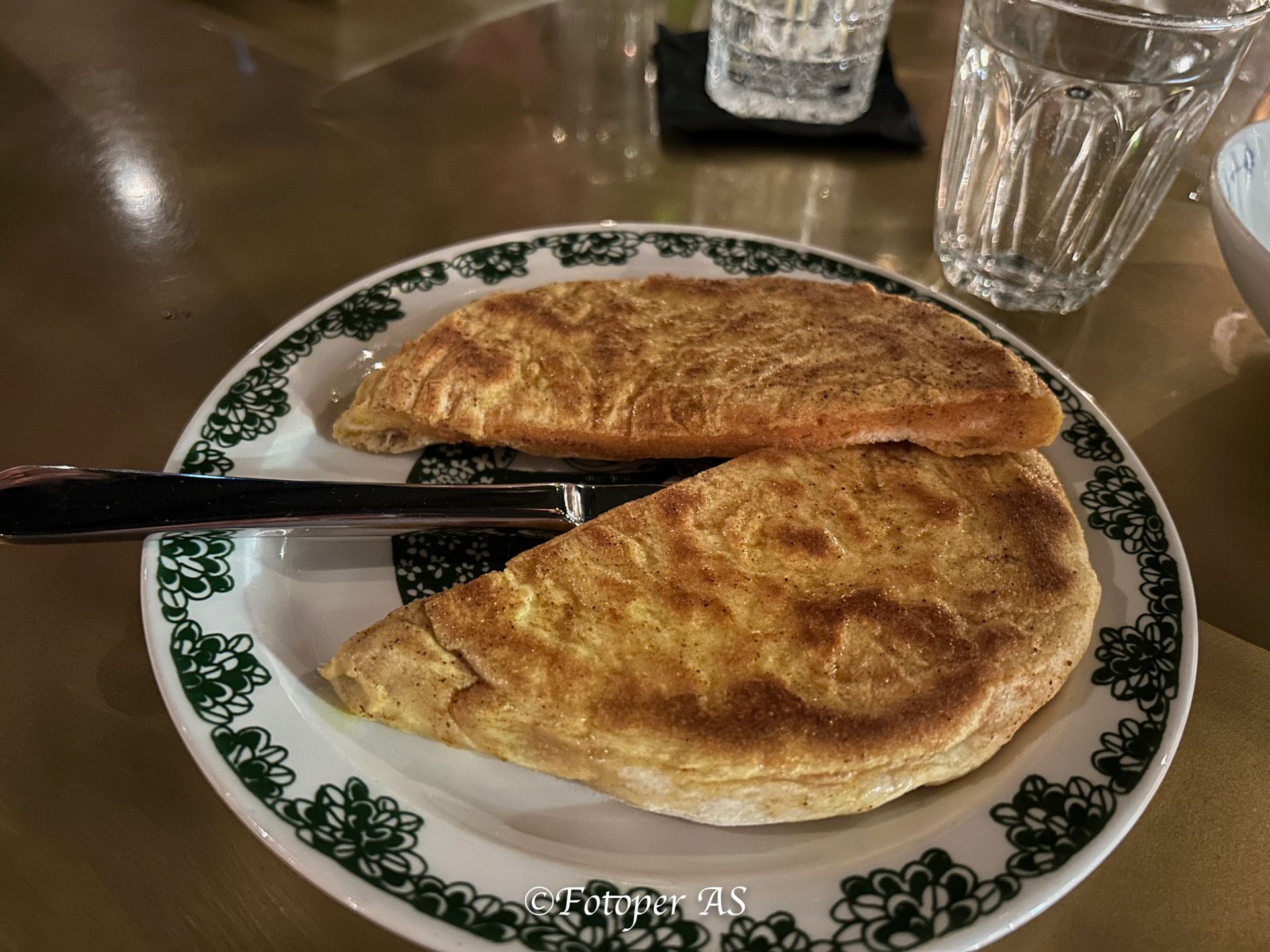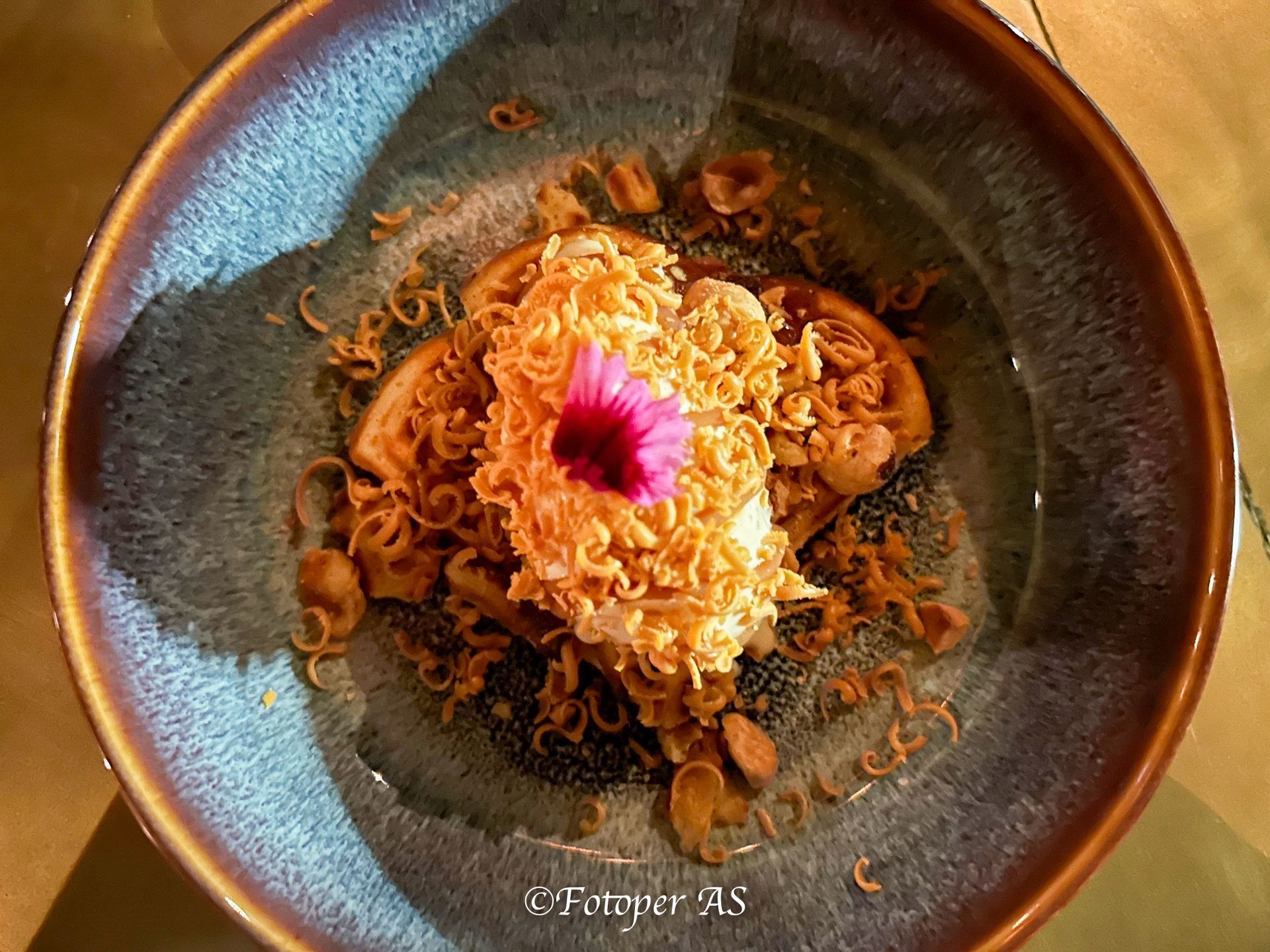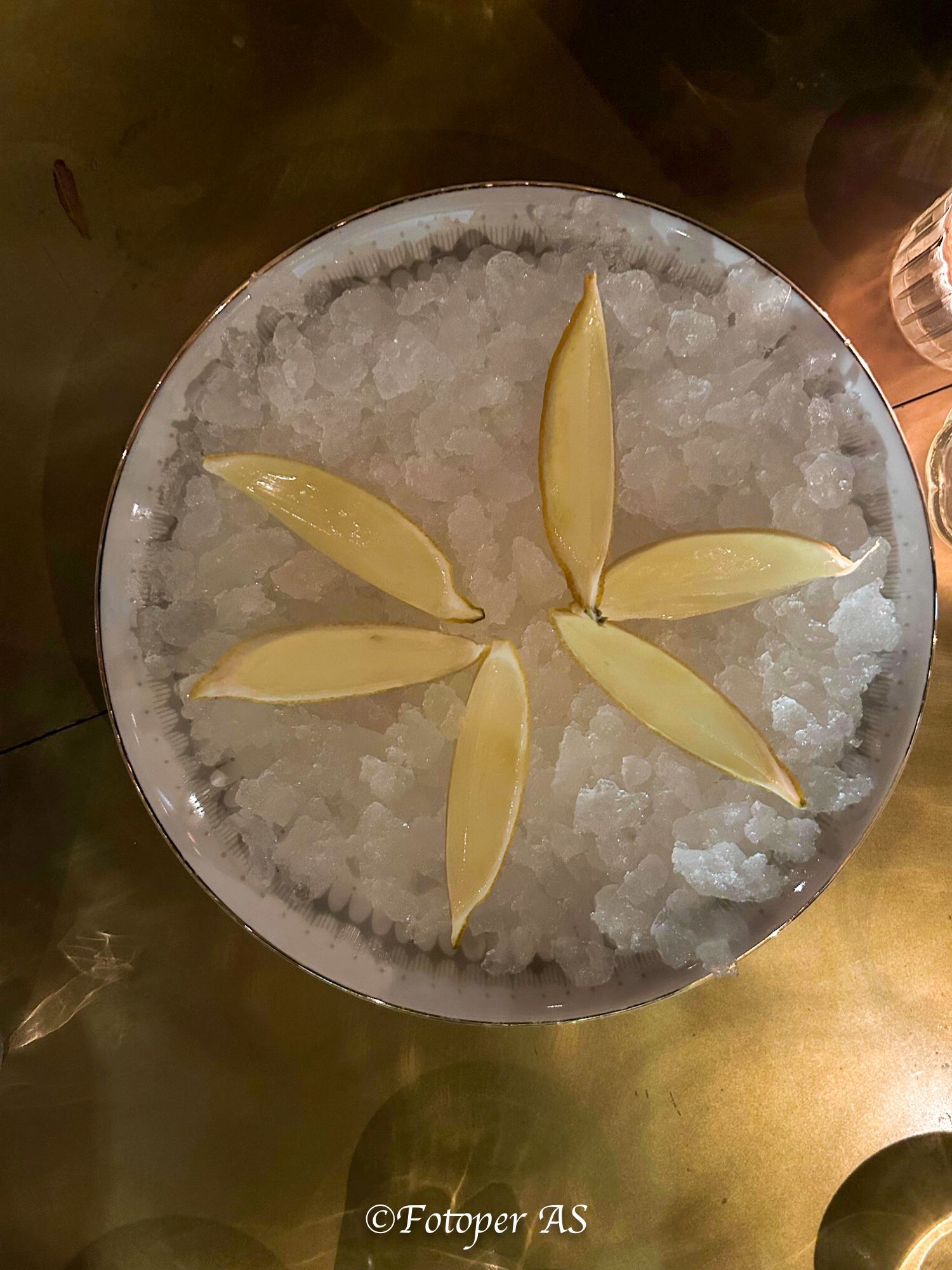 Det er fritt innsyn til kjøkkenet, og vi kan se på mens kokkene klargjør rettene våres. Etter å ha bestilt drikke, er vi klar for å bli overrasket. For hver rett får vi en kort forklaring av kokken på hva vi skal spise. Puffet svinehud, røkt fiskebeinsmajones og urtepulver. Nystekt fiskekake på sei. Nystekt Bulabrød med hummus, chiliolje og sesamfrø. Det er «Oppvarmingsretter» for å få i gang smakssansene, og det smaker utmerket. Vi blir anbefalt en vinpakke med viner som passer til de forskjellige rettene. Vi bestiller halv pakke, det er nok vin til å smake hvor godt vinene og maten passer sammen.