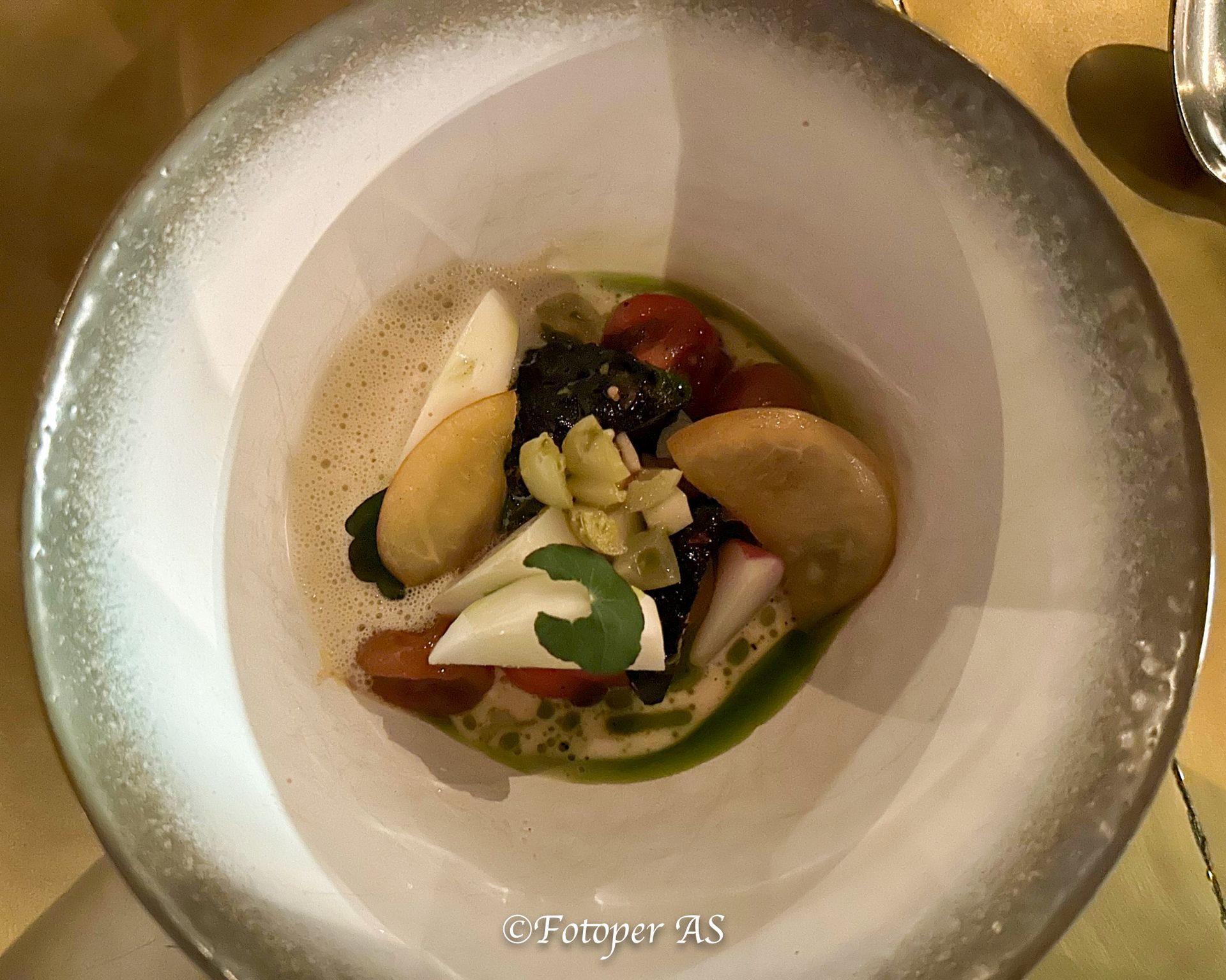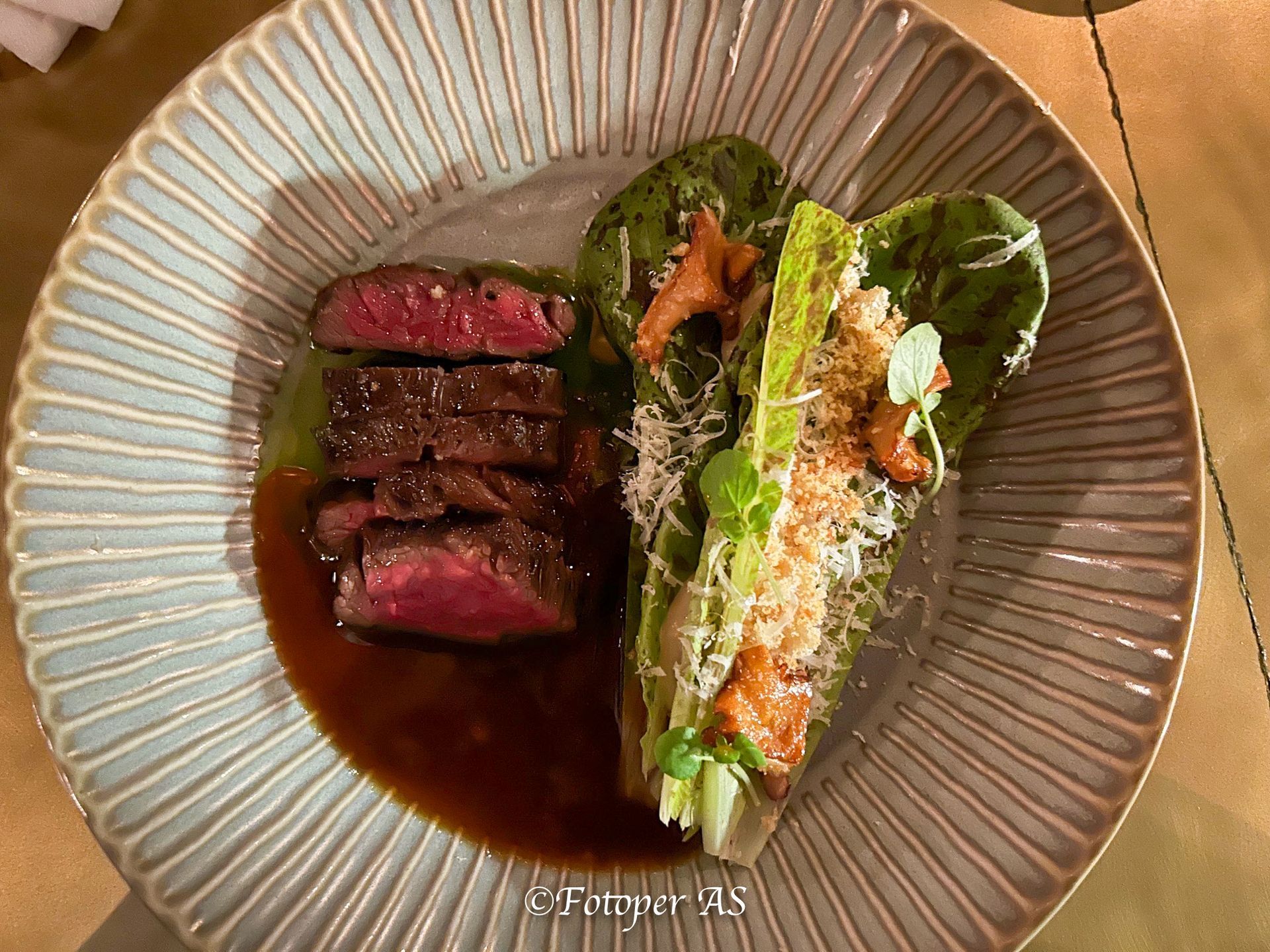 Første rett er tomater med nyperose, grillet squash og agurk, nepe, reddik og bær. Så brenneslepasta med eggeplomme, vellagret parmesan, grillet salat på sukkerter og bacon. Fisk får vi også. Pannestekt sei med velsmakende tilbehør. Som neste rett serveres entrecotè tørrmodnet i egne skap, med bl.a. salat, ansjoskrem, kantareller og oksehalesaus. Til slutt får vi vaffel, steinsopp og brunost. Helt til slutt er det en liten frisk "dessert". Ingen av rettene er så mettende, men når vi har fått i oss alt, er vi gode og mette etter et strålende måltid. Ikke bare måltidet er strålende, det er også atmosfæren og kontakten med kokker og servitører. Musikken er passe høy, og det er så fint å sitte ved et rundt bord for da er det lettere å snakke sammen.