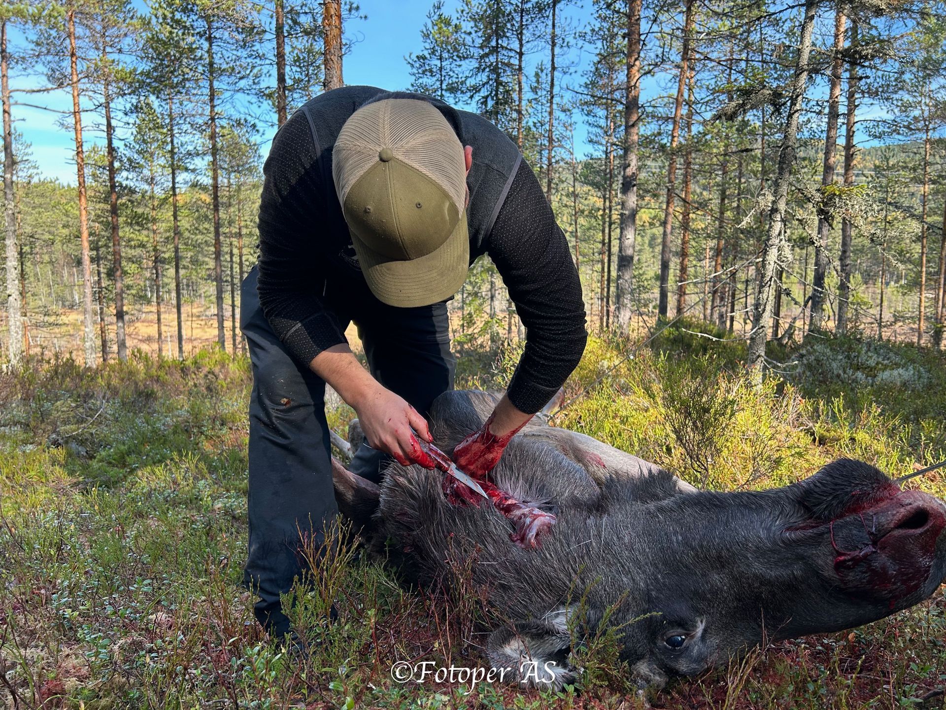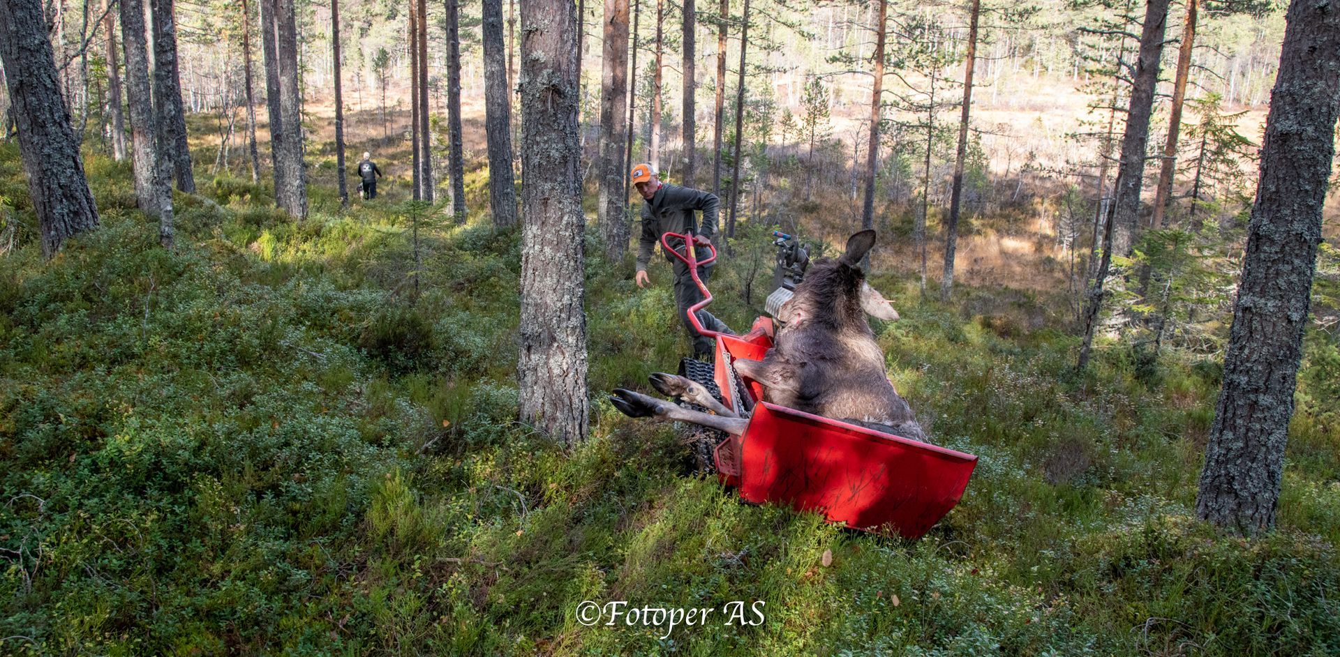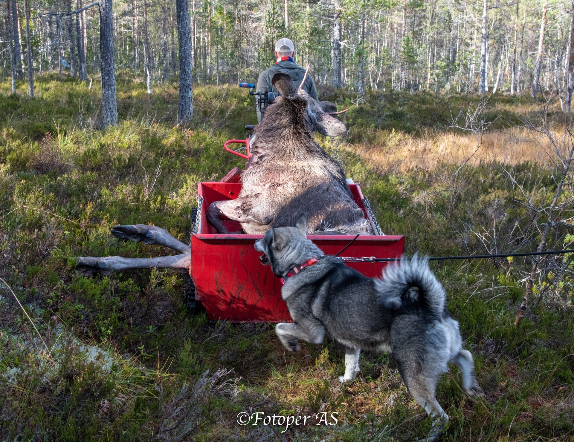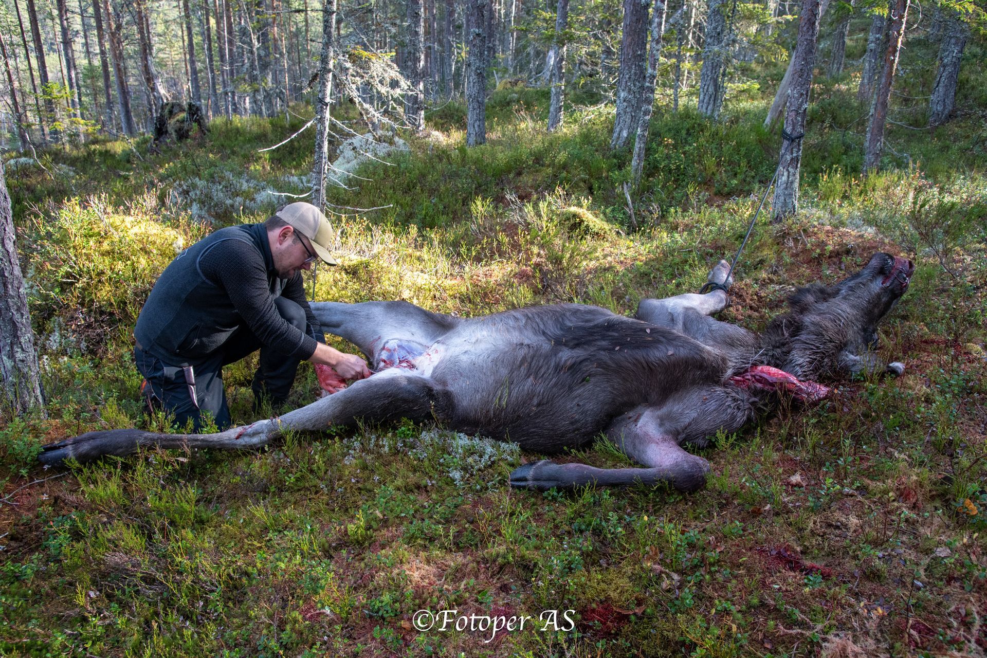 Jonas har reist for å hente trekkeren for å frakt elgen til bilveien, og snart er elgen klar for transport til slakteri. Innmaten og pelsen ligger igjen. I løpet av noen få dager er all innmaten borte. Vi hører allerede ravnen, eller korpen, skriker over oss og er klar for mange måltider. En og annen rev kan også glede seg over elgmat.