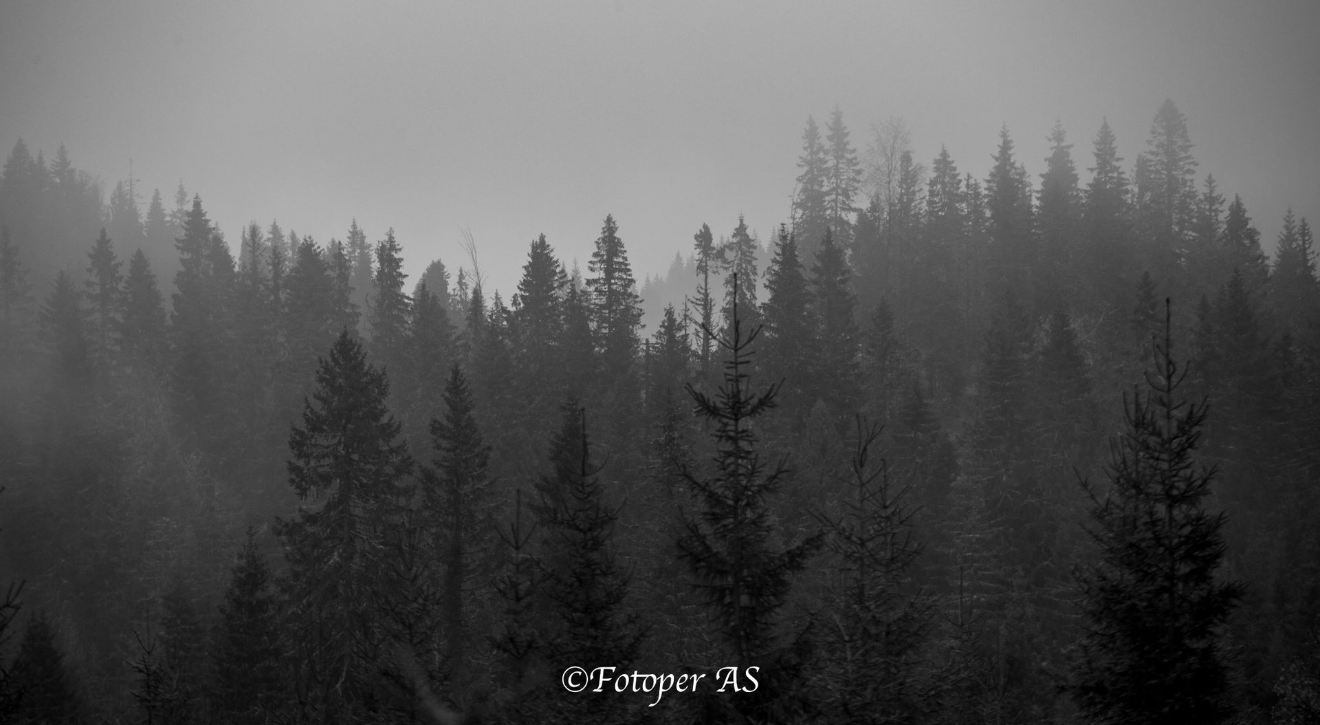 Jeg skal på en overnattingstur på hytta igjen. Det er så fint både på kvelden og morran at jeg må få med meg det nå før det blir for kaldt. På toppen av Dronningveien møter jeg tåka, men sola stråler gjennom.