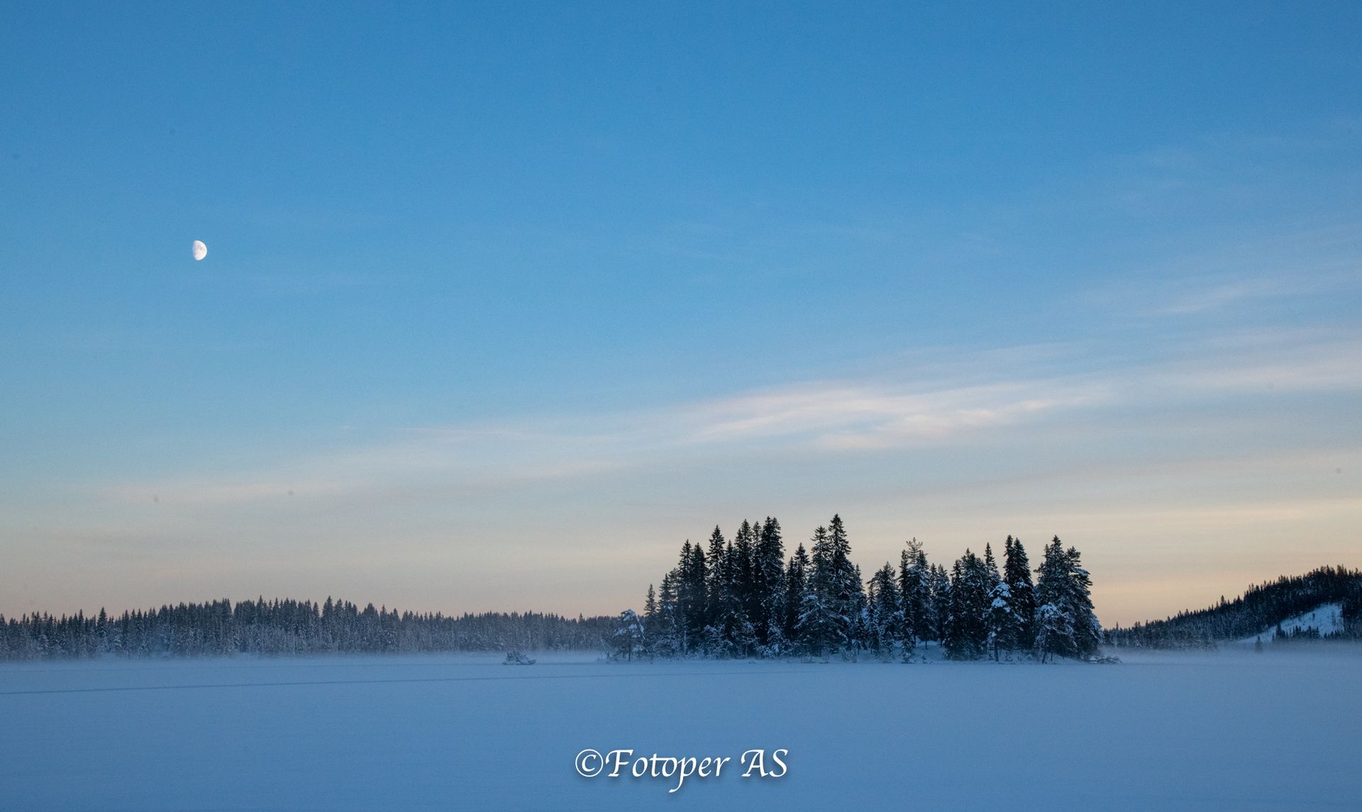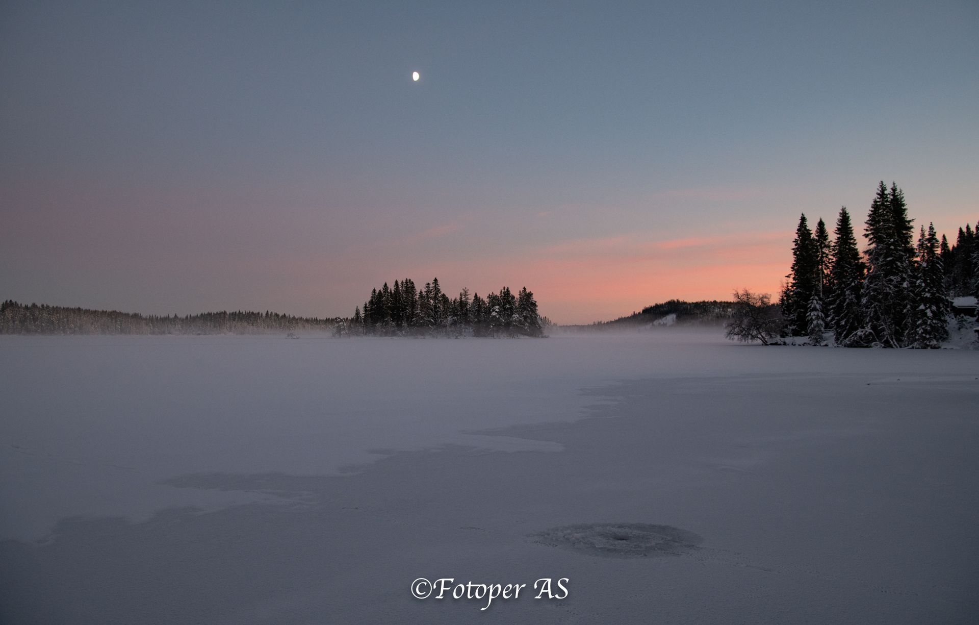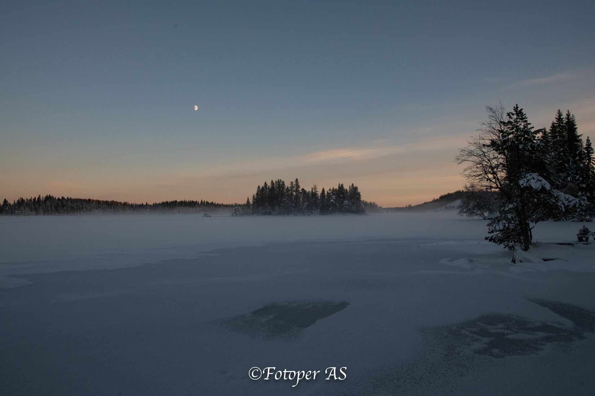 Etterpå rusler jeg bort til vannet. Det ligger snø på det, men jeg ser fotspor som viser at det er overvann under snøen. Sjekker noen pilkehull for å se hvor tjukk isen er, den holder til meg. Noe tåke kommer sigende innover vannet, og en halvmåne skinner på himmelen.