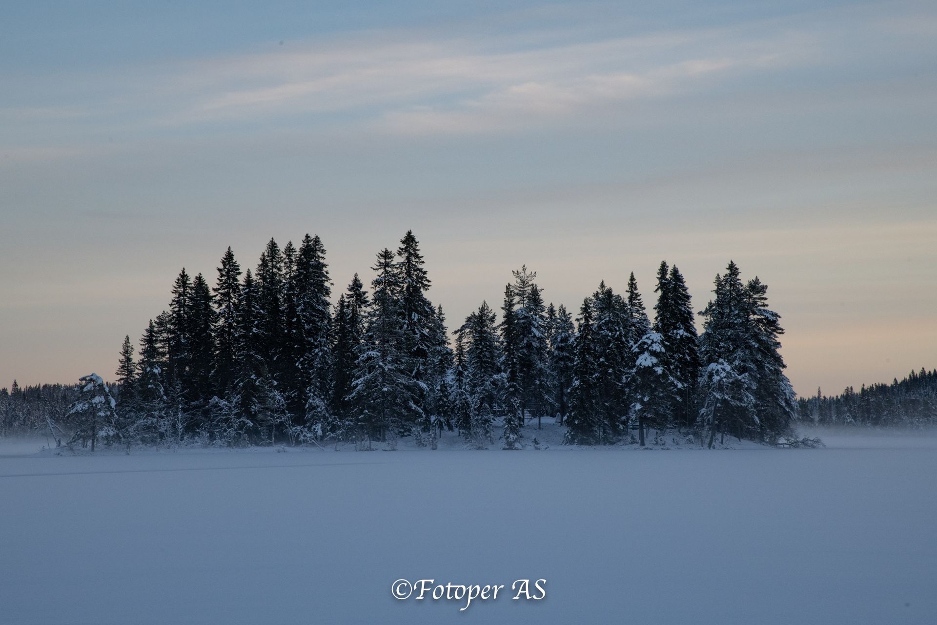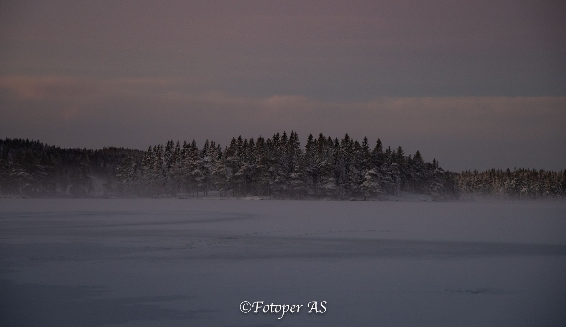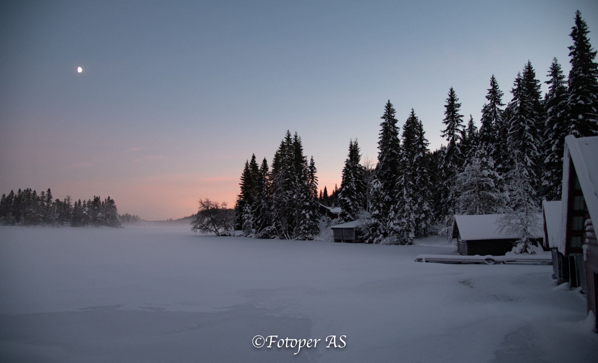 Etterpå rusler jeg bort til vannet. Det ligger snø på det, men jeg ser fotspor som viser at det er overvann under snøen. Sjekker noen pilkehull for å se hvor tjukk isen er, den holder til meg. Noe tåke kommer sigende innover vannet, og en halvmåne skinner på himmelen.