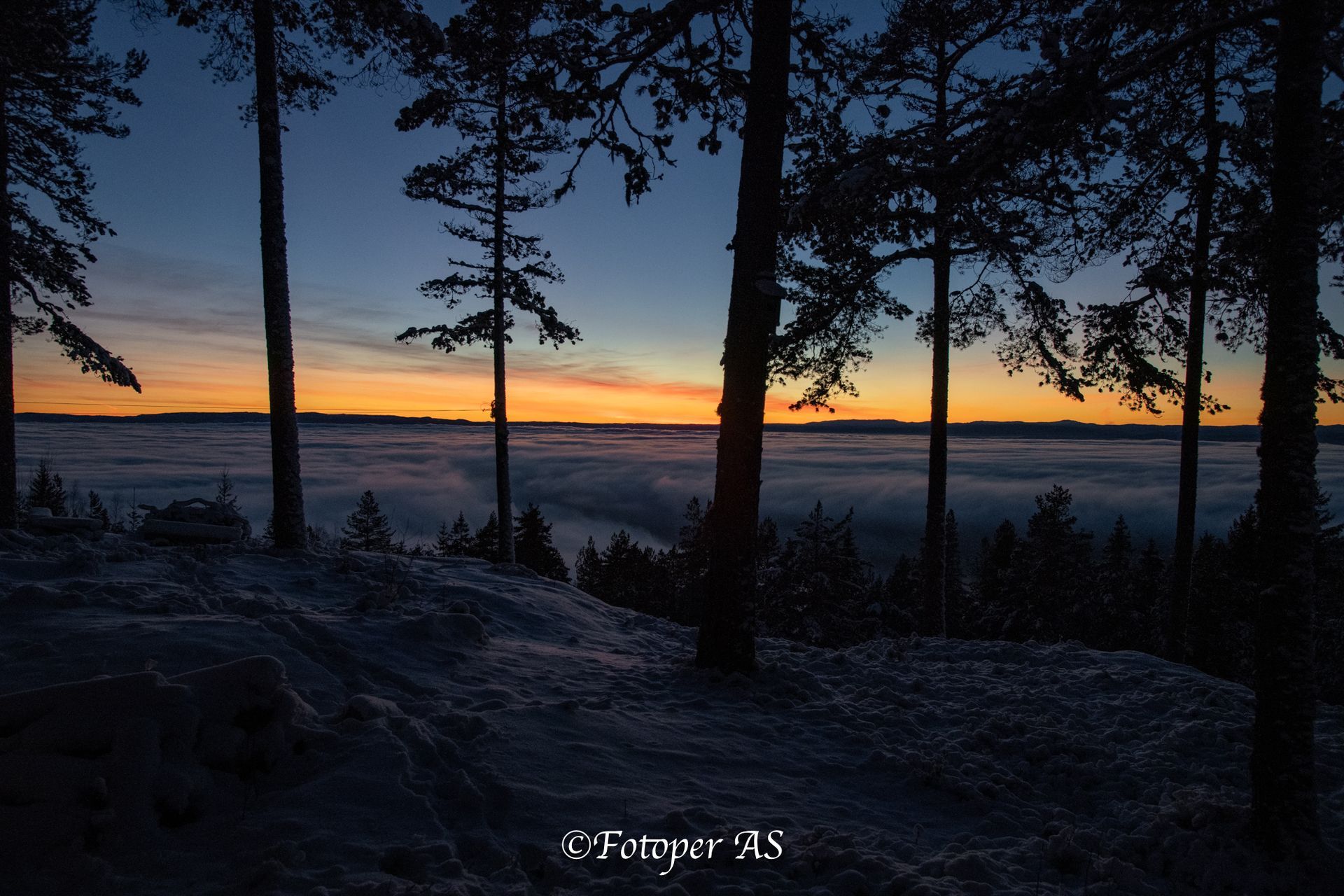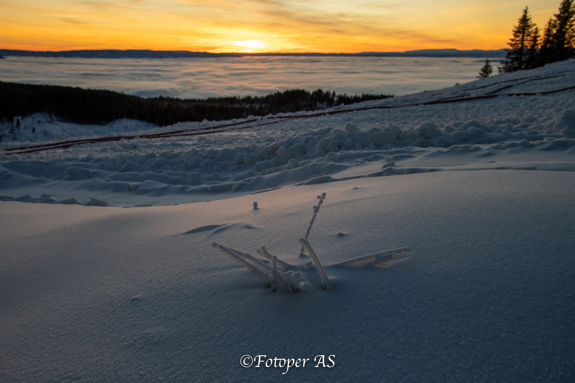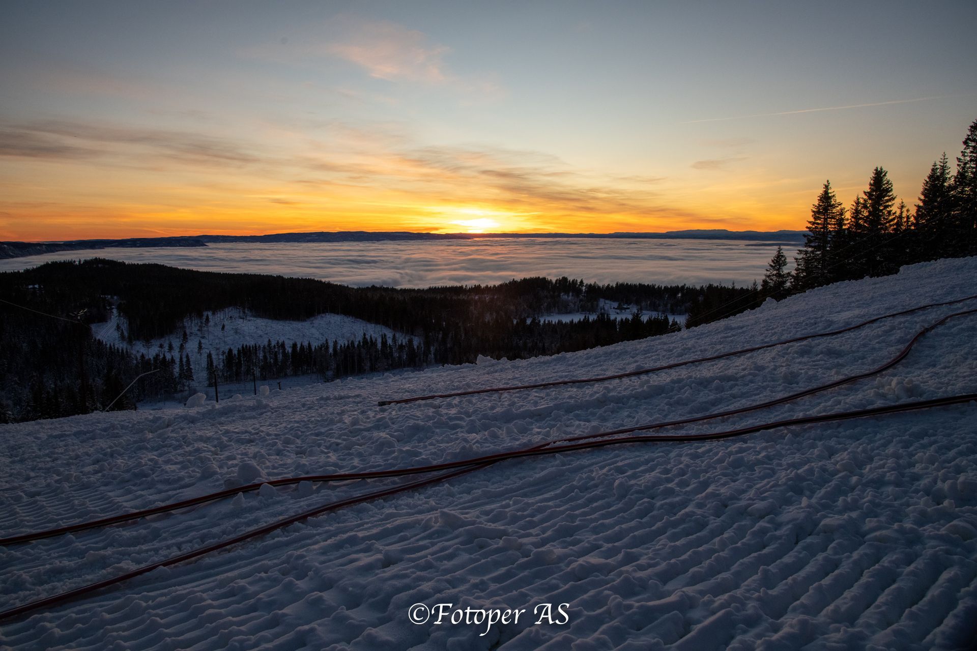 Ser at det nærmer solnedgang og tenker at jeg må komme meg til Ringkollstua for å få den med derfra. I alpinbakken har det blitt produsert snø og slangene ligger utover. Snøen her er steinhard og knudrete, ja det er mer is enn snø. Det er litt igjen før sola bikker over åskanten. Jeg stiller meg i le for litt sur vind og venter – og venter. Men jeg venter ikke forgjeves. Det blir en vakker solnedgang over tåka.