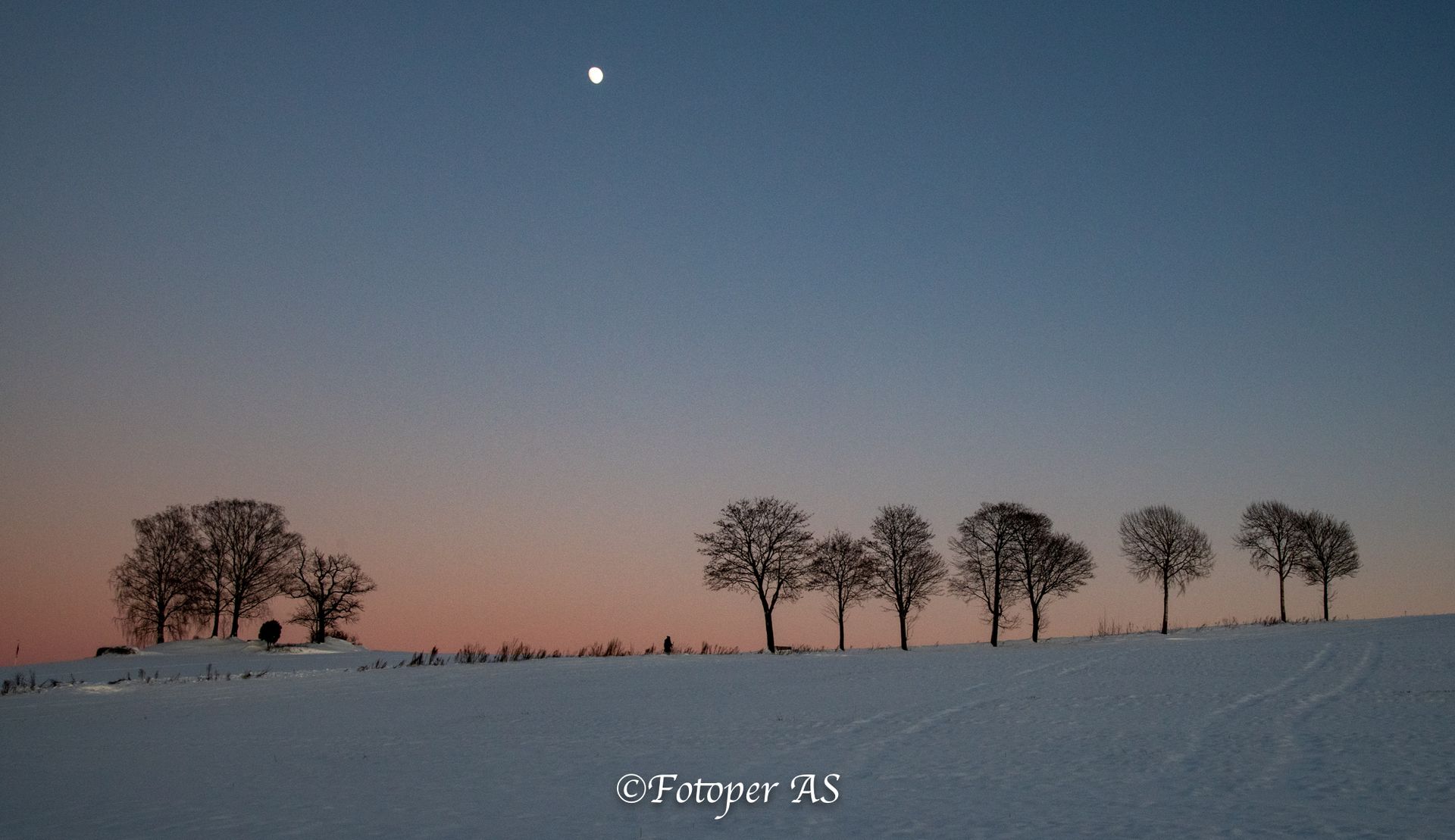 Som vanlig blir det en stopp når jeg kommer til Frøyshov gravfelt nær Onsakervika. I Åsbakken står det noen fine trær. I dag er også månen oppe i bakgrunnen.