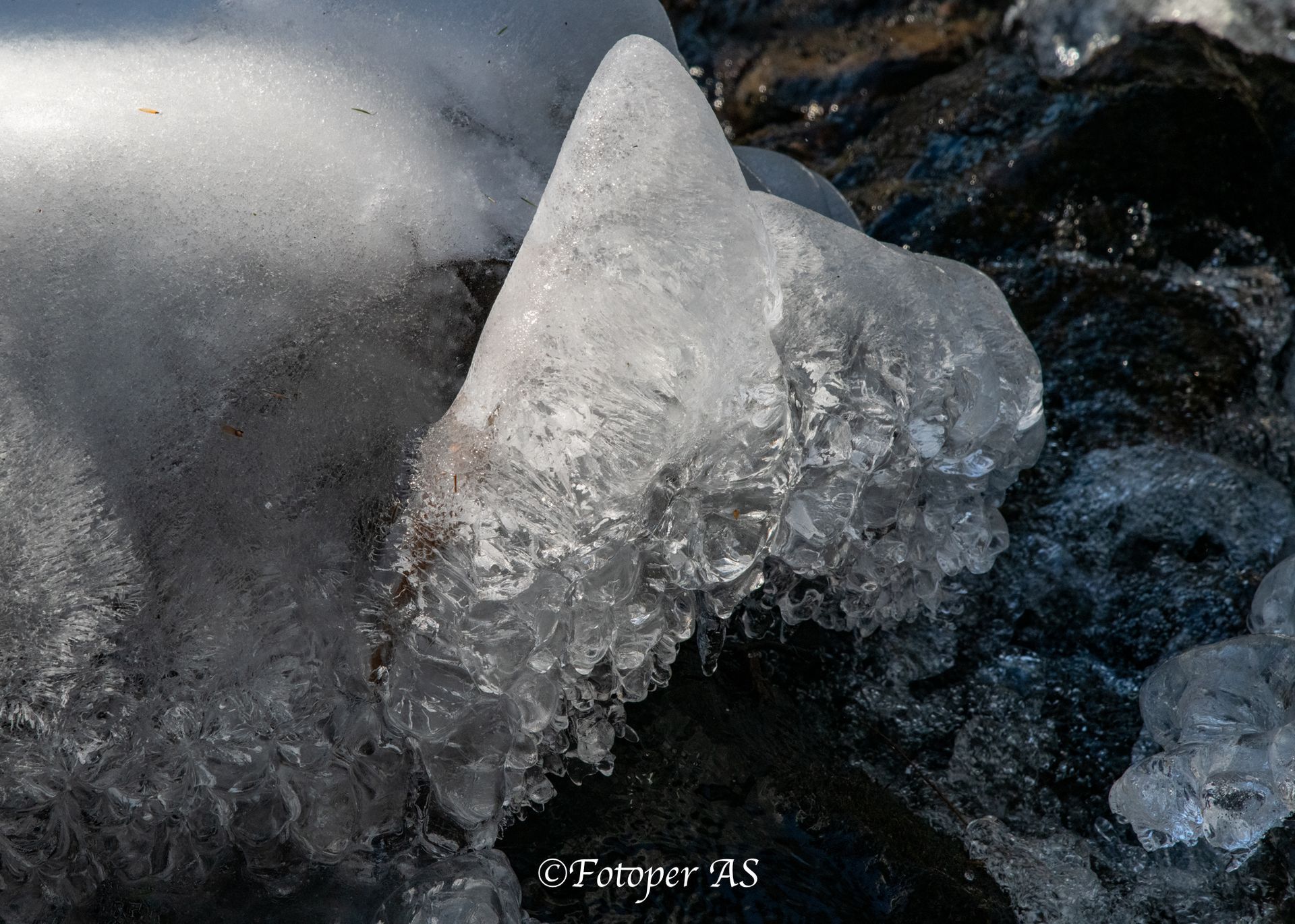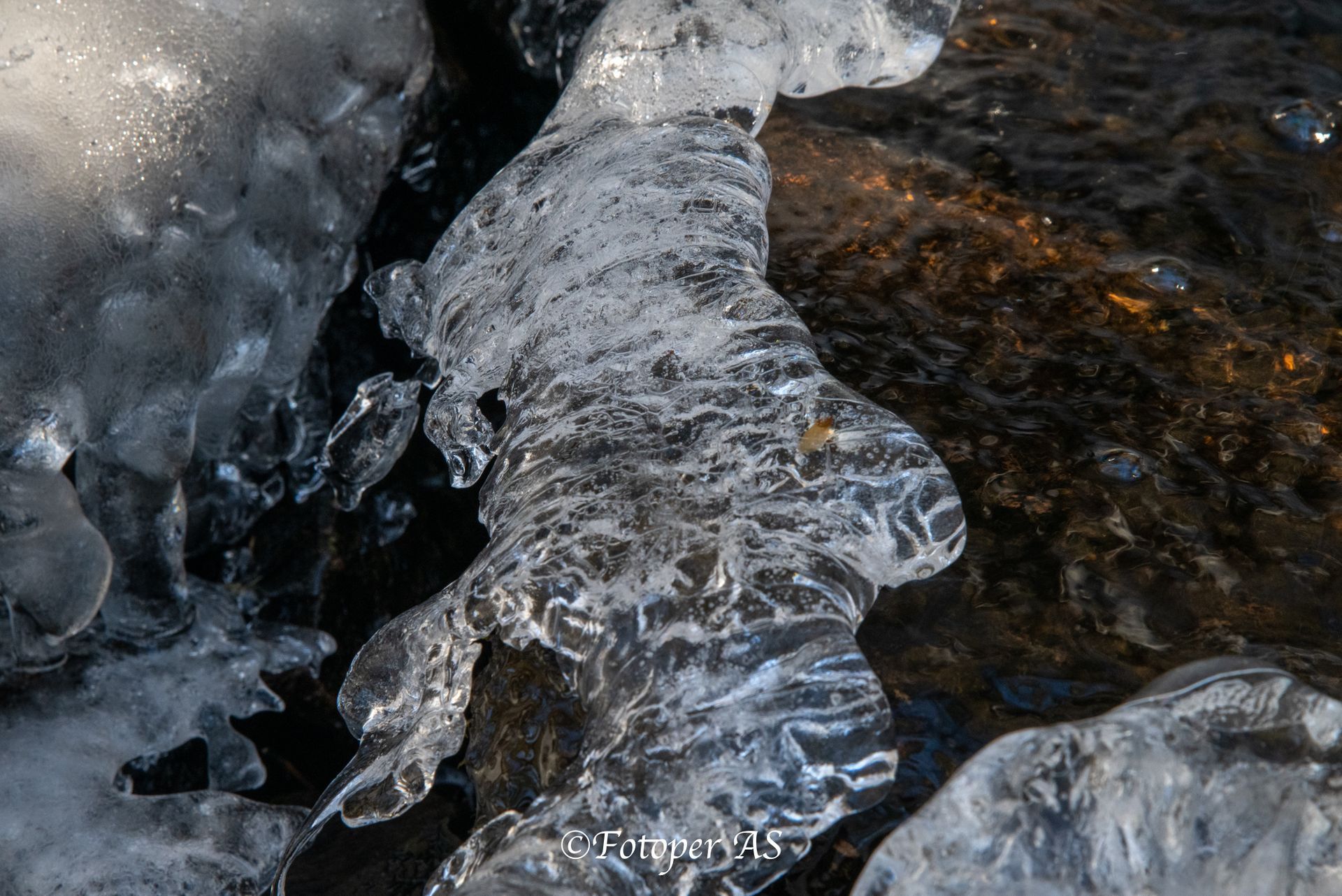 Langs Dronningveien kommer ned en bekk. Der er det fullt av isfigurer, og jeg klatrer opp i bekken.