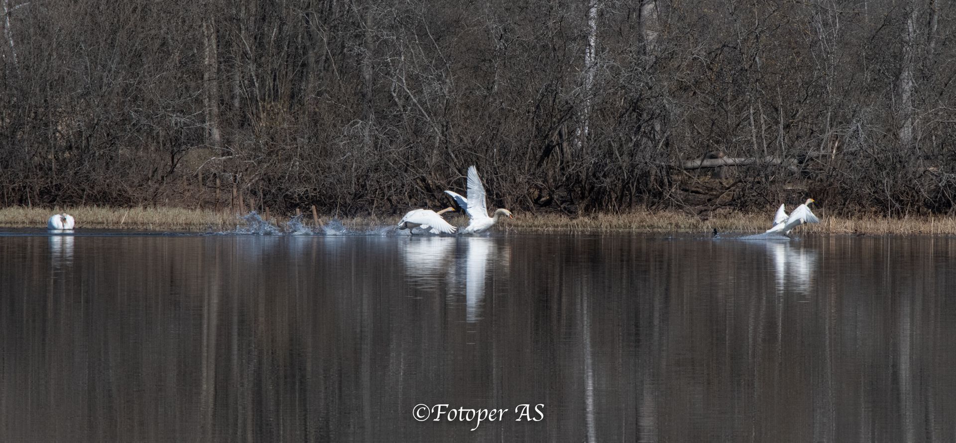 Over meg kommer det er et skrikende svanepar. Det ligger et par i Juveren fra før, og selvsagt må det innflyvende paret legge seg akkurat der de andre ligger. Det må jo bli bråk. De bakser og slår med vinger og biter hverandre, alt mens de skråler og skriker. Det ender til slutt med at inntrengerne fornøyd kan slå med vingene, mens det andre paret er spredt.