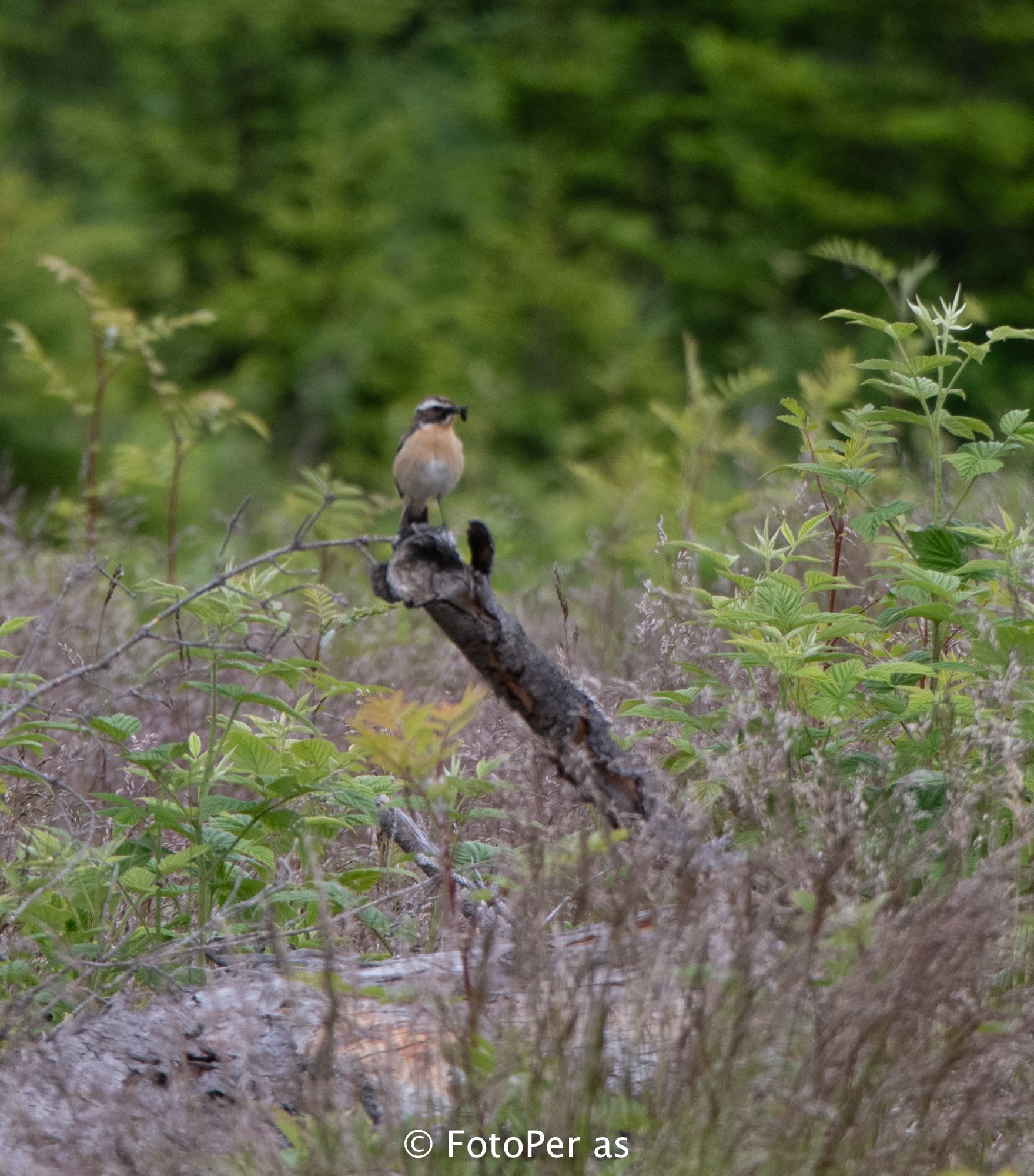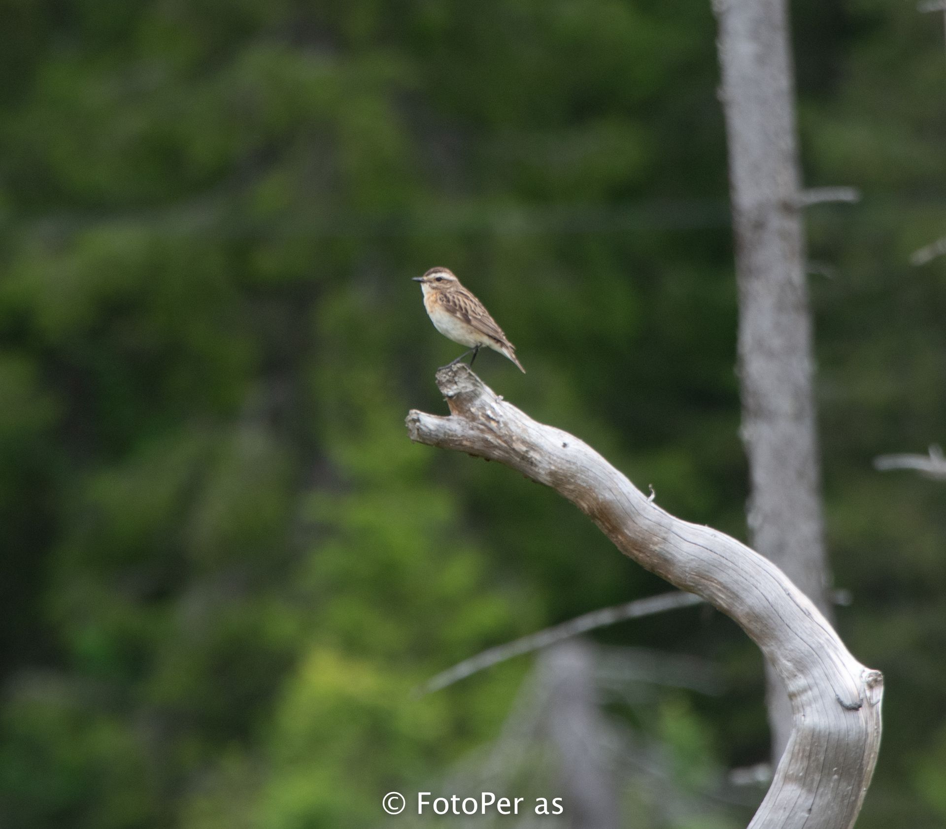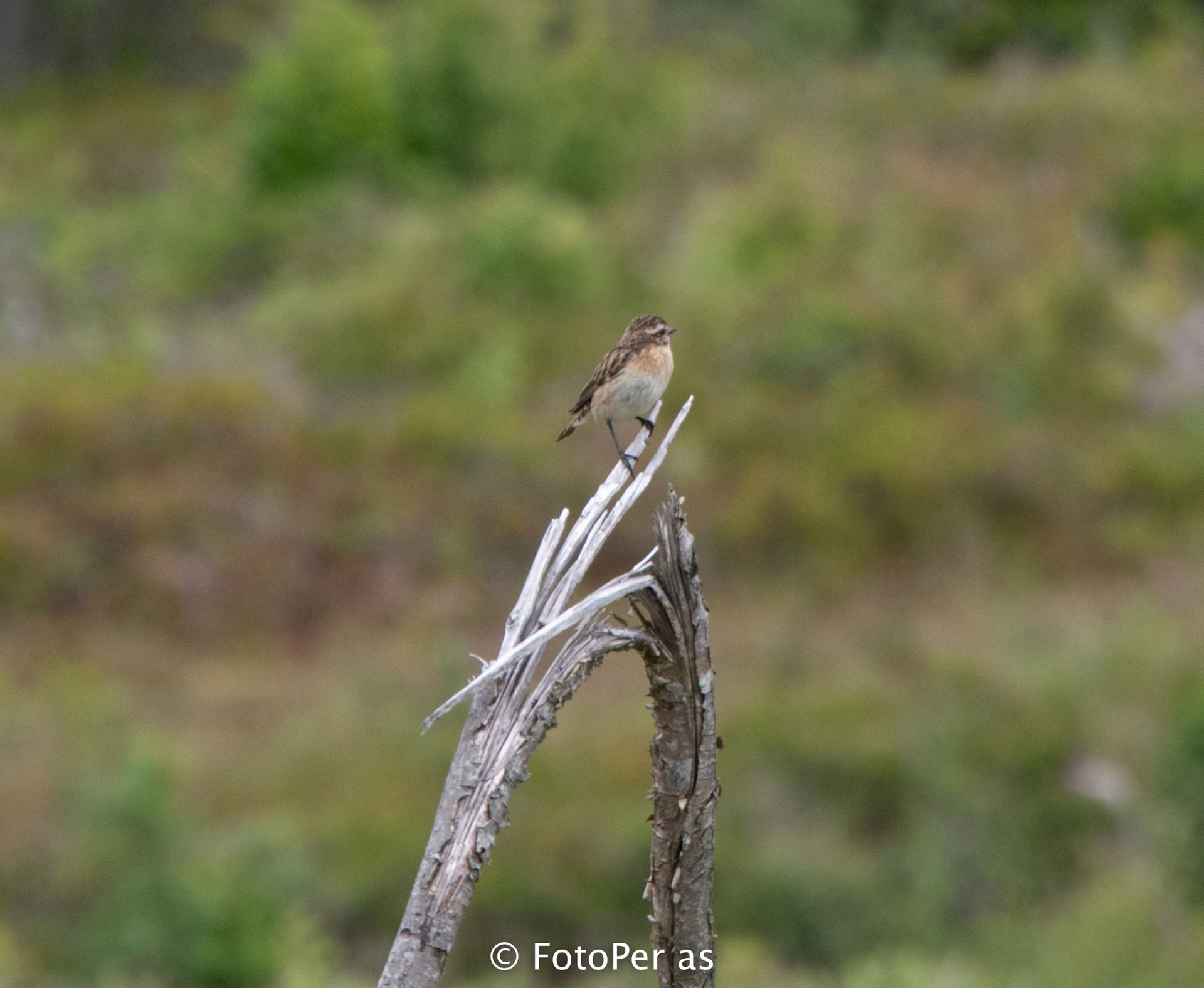 Vel framme på hytta hører jeg mange fuglelyder. Finner fram appen Merlin Bird ID og den ene fuglen etter den andre blir registrert. En ny for meg i dag er granmeis, men den jeg hører mest er buskskvett. Jeg er ingen fuglefotograf, og har derfor ikke med noe stativ. Men jeg finner god støtte i en verandastolpe, og med telelinsa klarer jeg å få noen bilder av buskskvett.