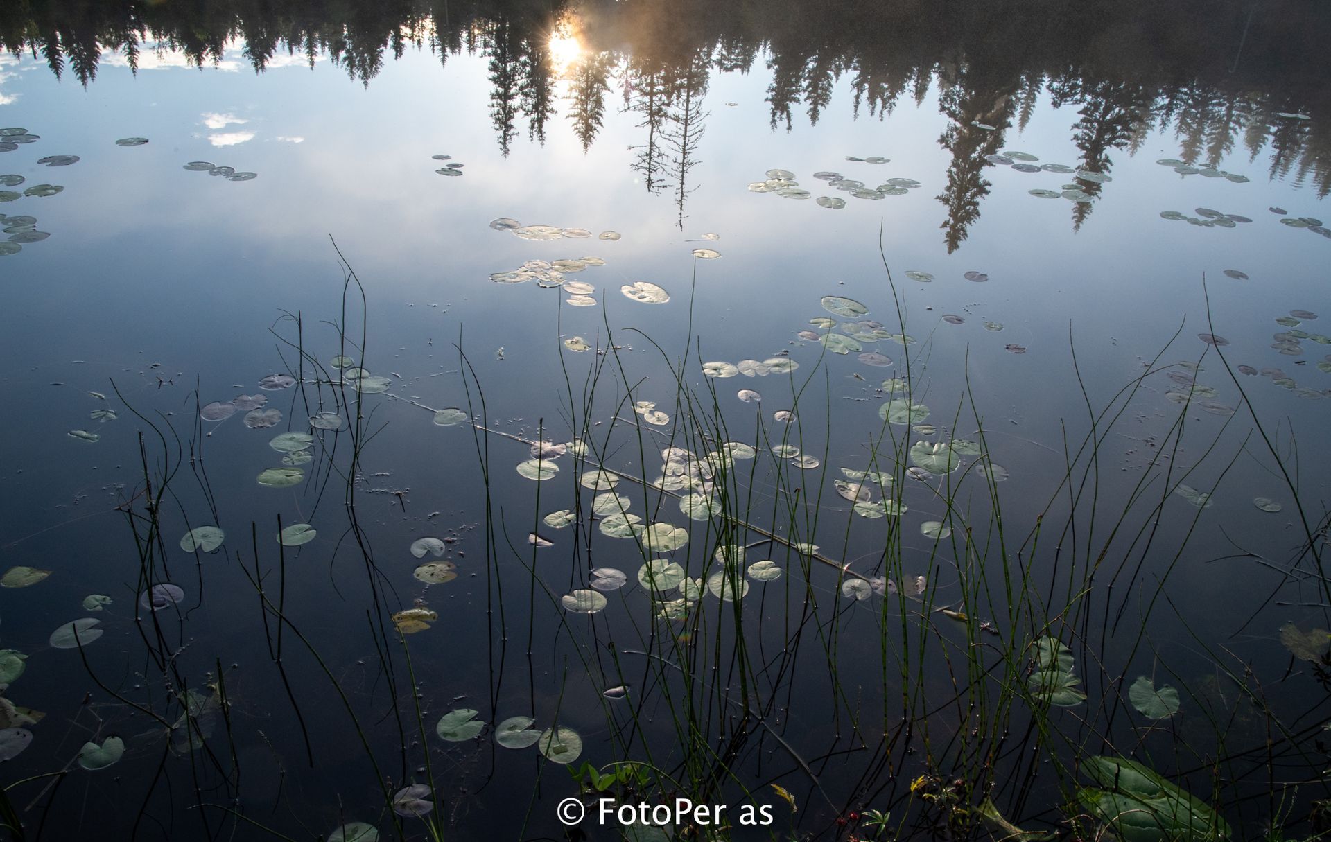 Våkner neste morgen før sola har stått opp, og kikker ut av vindu. Det er tåke, men sola er på vei til å komme gjennom. Her er det bare å få på seg klær og komme ut med kamera. Skal jeg gå ned til Nordsetertjernet nede i tåka, eller skal jeg gå opp mot Nordsetra der tåka letter og sola kommer? Jeg velger meg tjernet.
