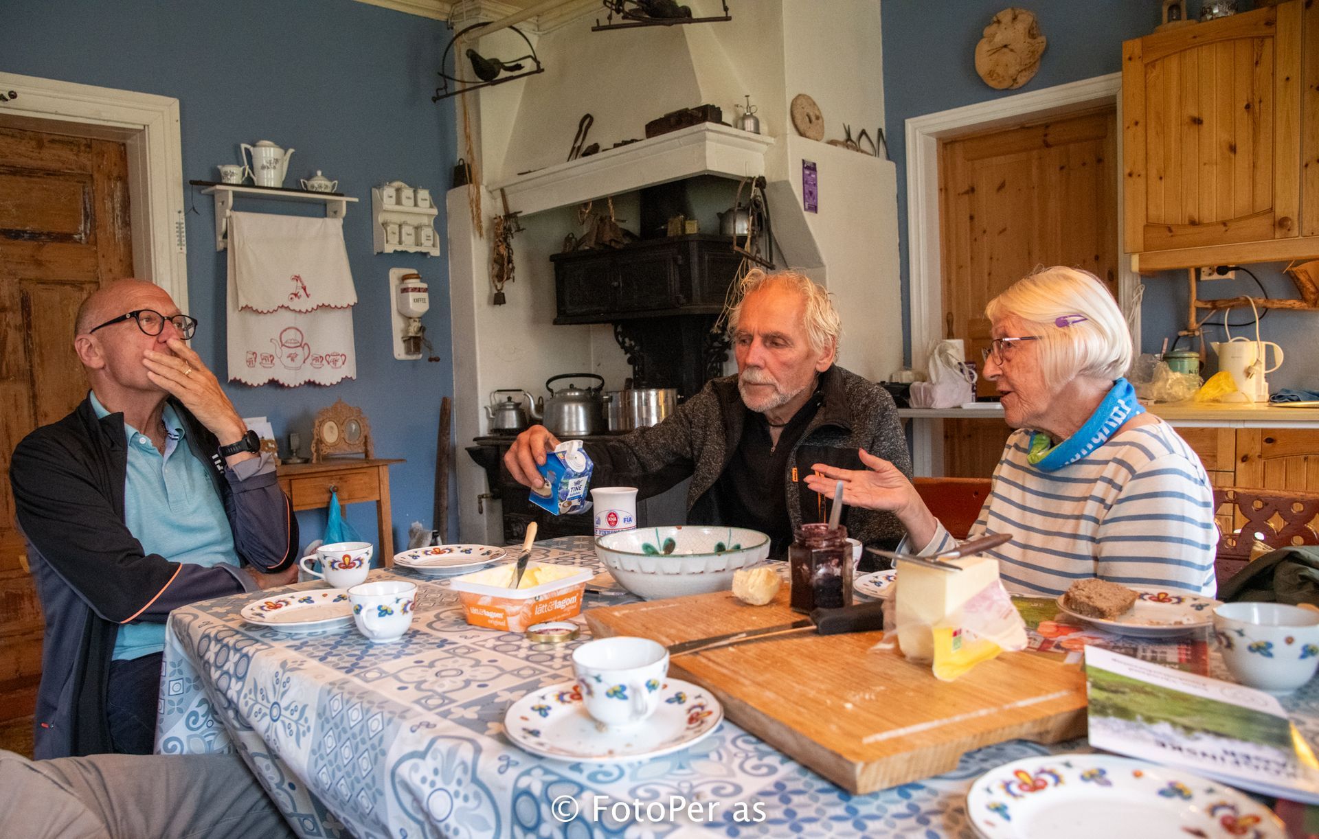 Vår guide Øystein tok i mot oss med noen storfe rundt seg. De er av en eldre rase, og er der for å beite ned deler av innmarka gjennom sommeren. Øystein var en forsiktig kar som på en rolig måte fortalte om de forskjellige bygningene og livet som var på gården. Det er mange bygninger å vedlikeholde, og gress som skal holdes nede. Når vi spør om hvem som har gjort de forskjellige tingene, svarer han at «nja, det er nå meg» på det meste vi spør om.