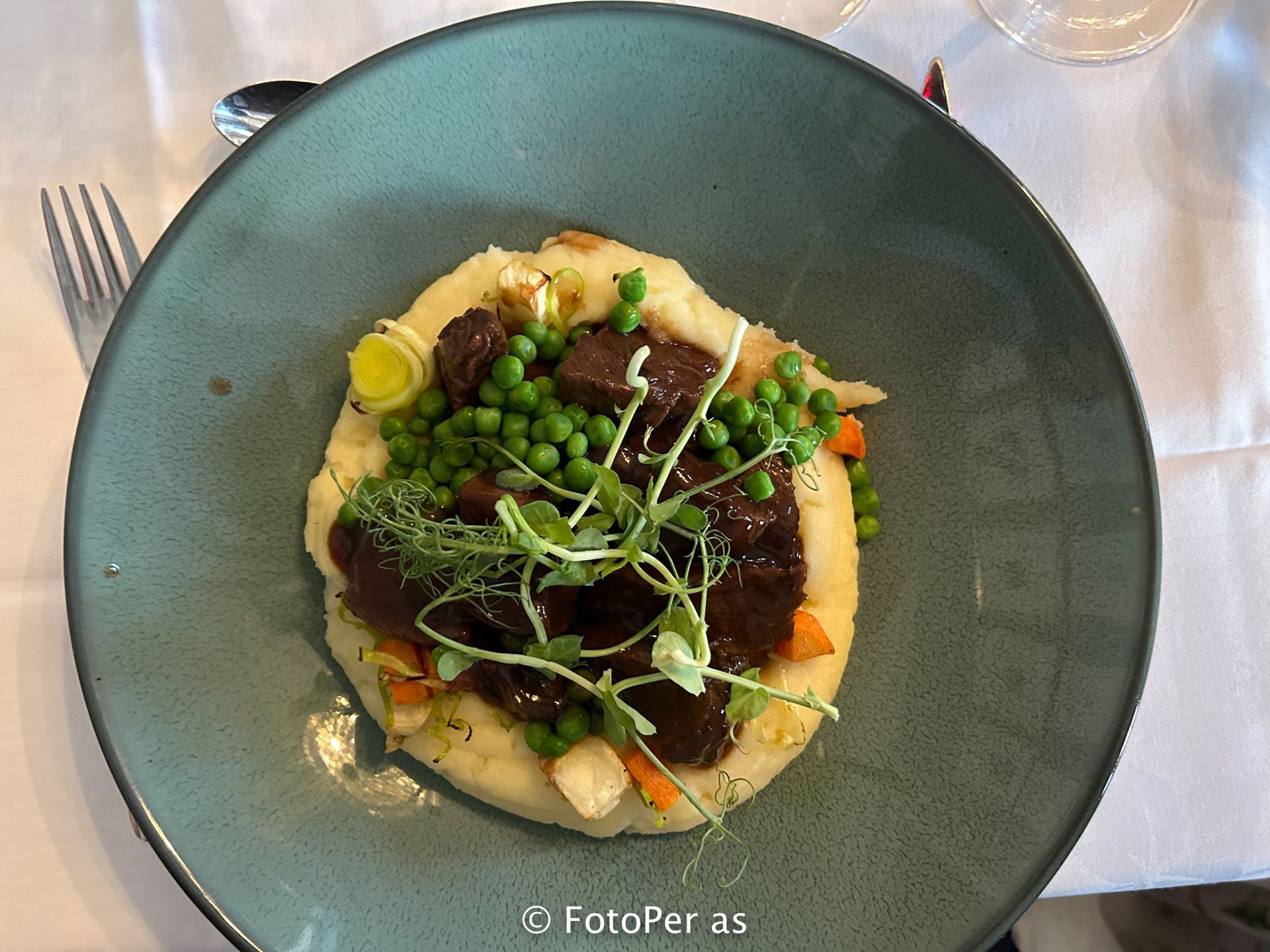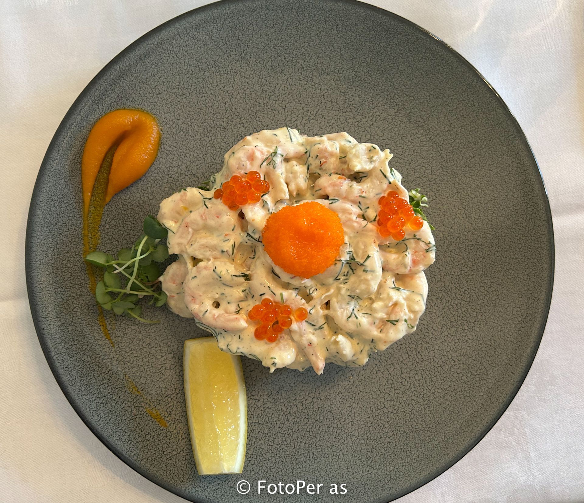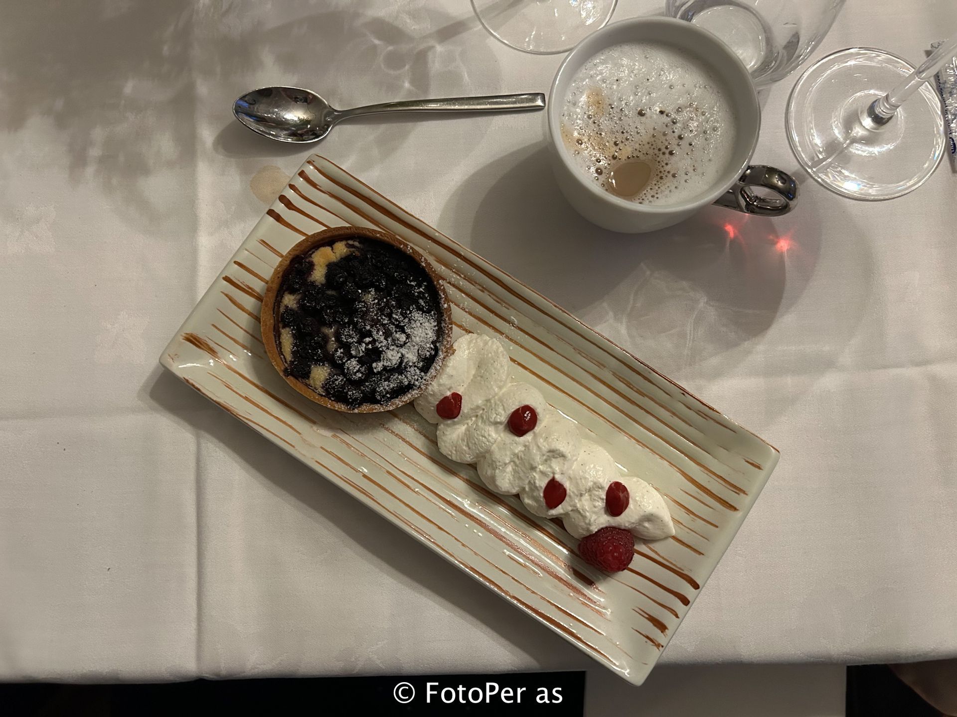 Vi var kveldens eneste gjester i restauranten. Der fikk vi servert skagenrøre på brød til forrett, hjortegryte til hovedrett og blåbærpai til dessert. Velsmakende og mettende.