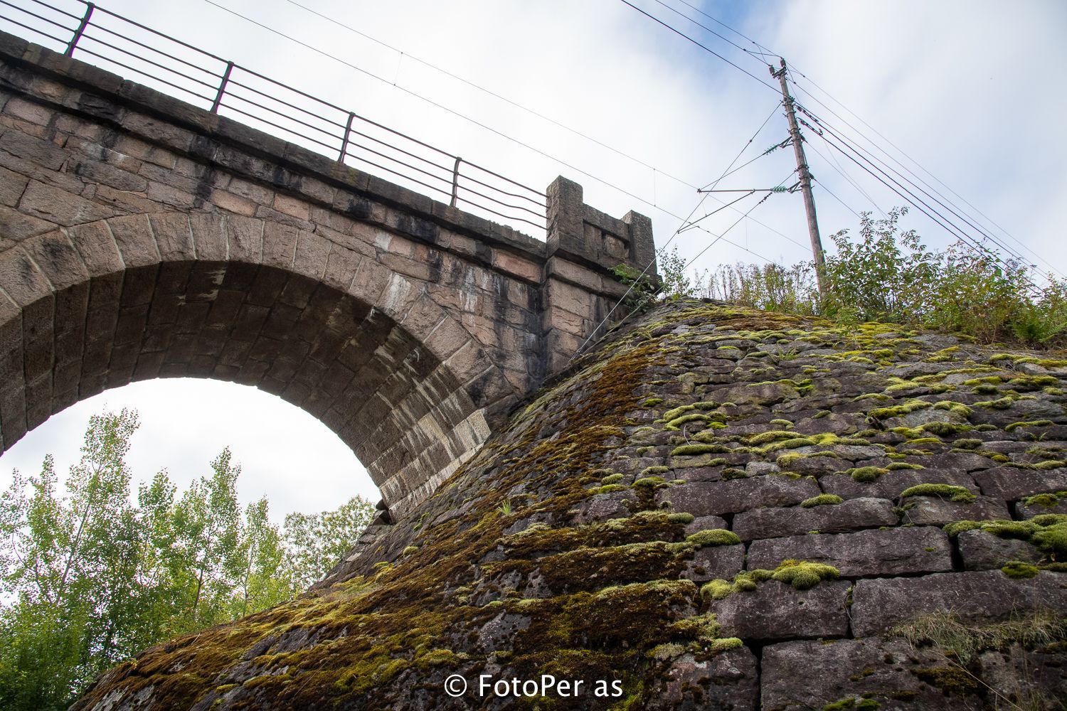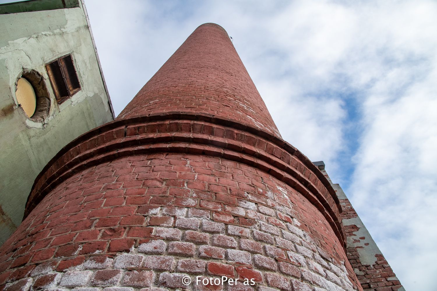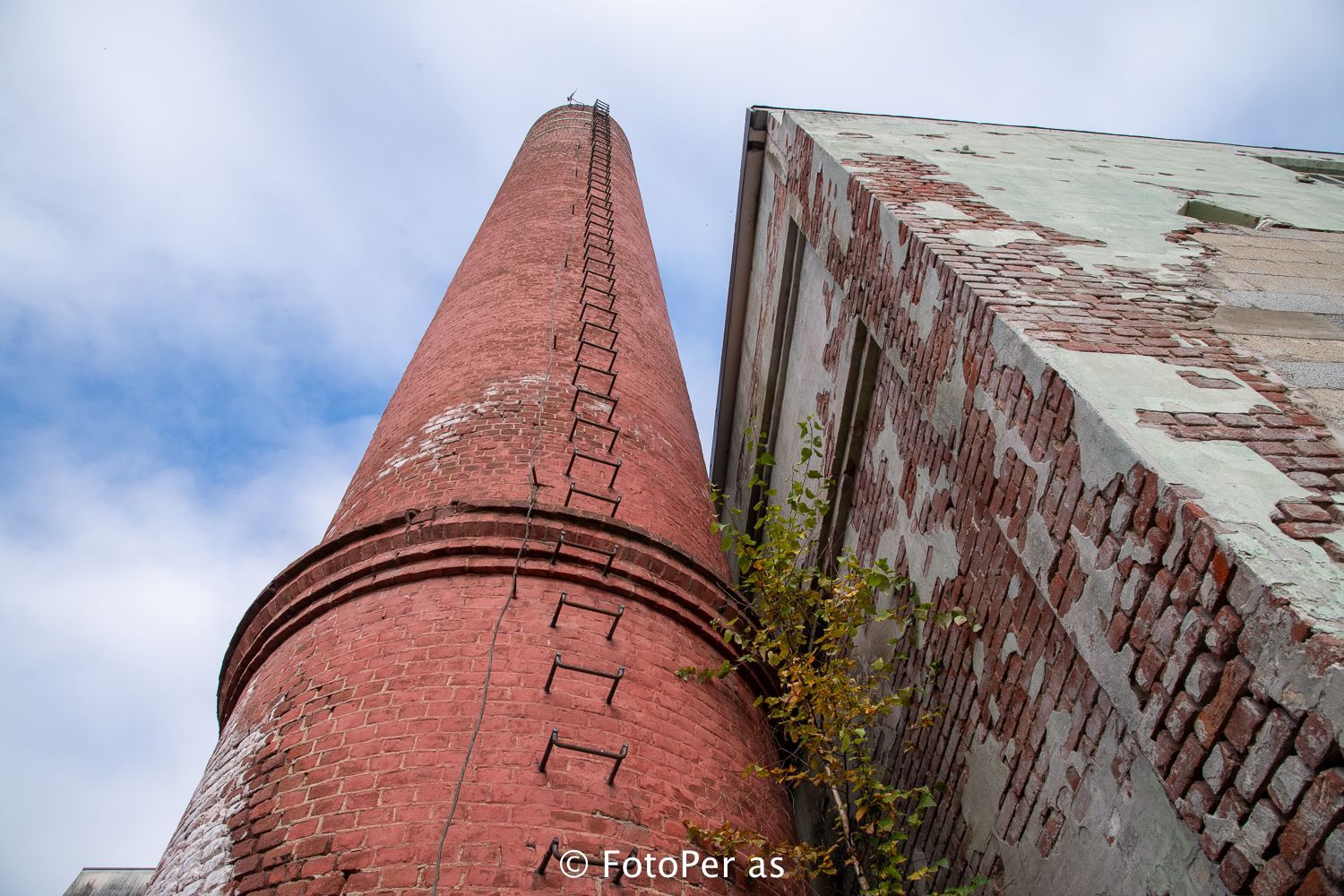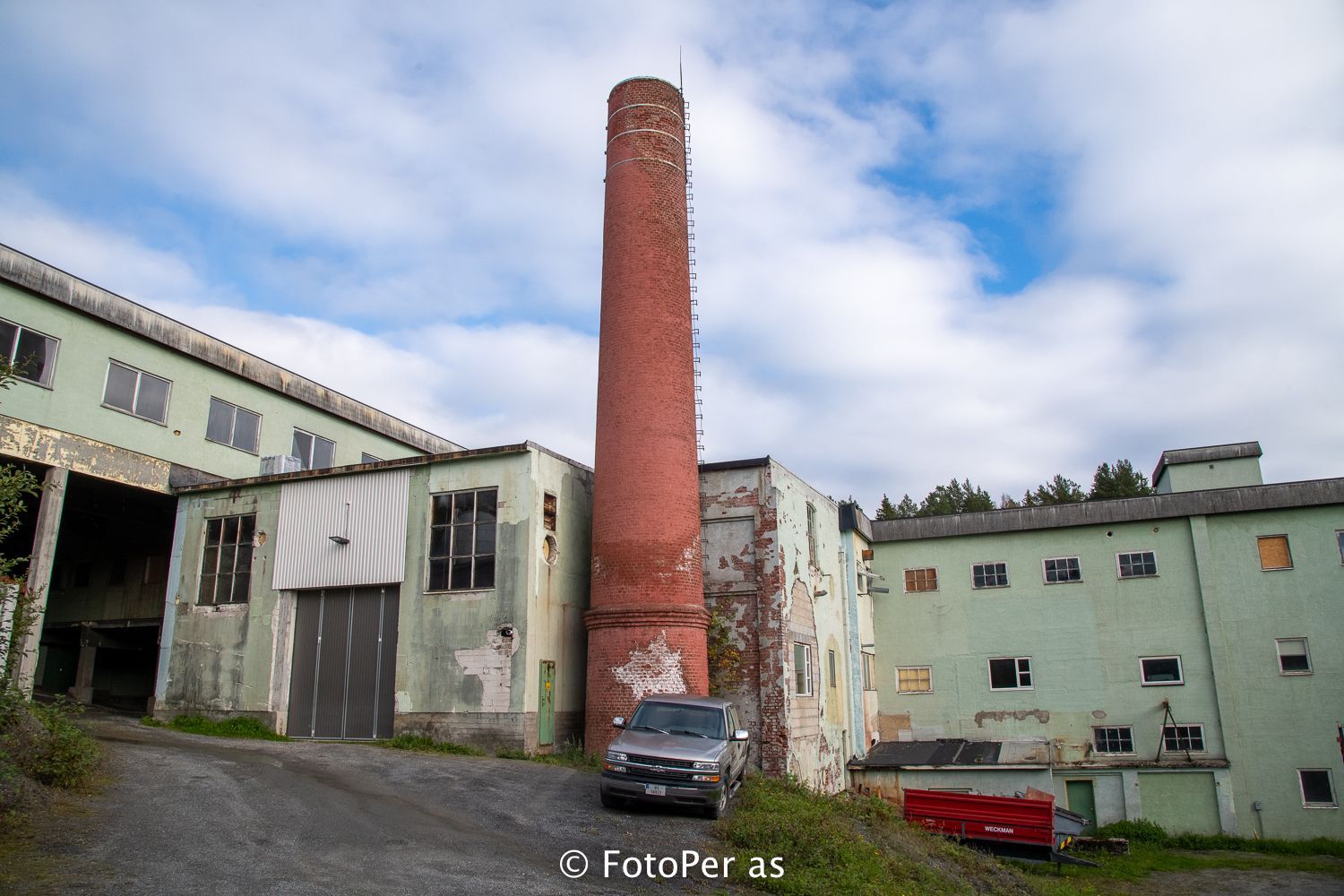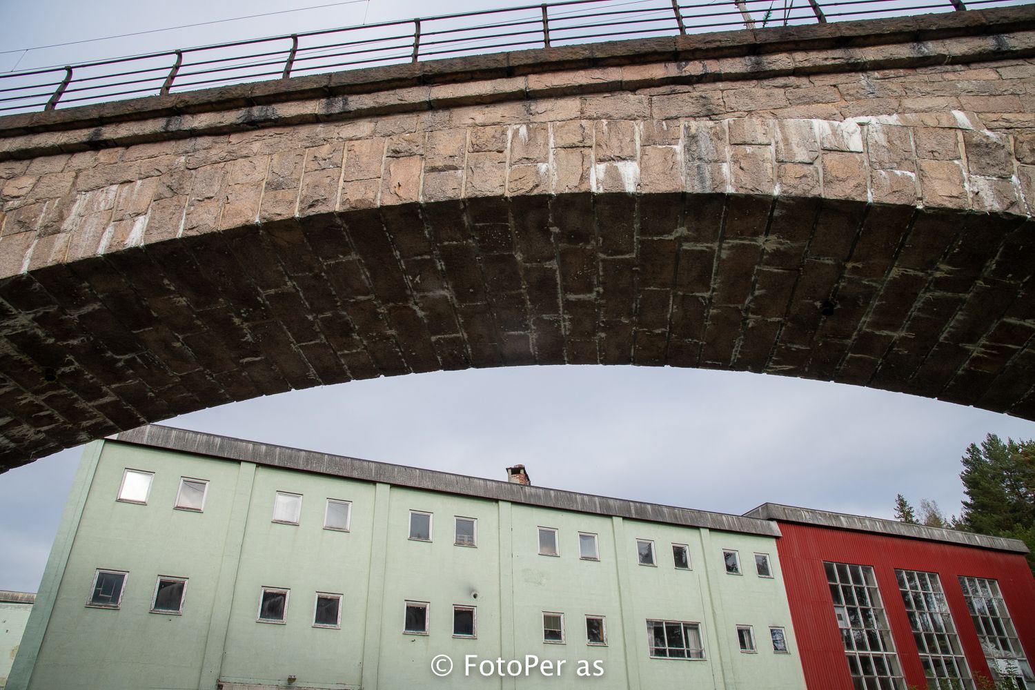 Neste stopp ble gamle Skjærdalen på Tyristrand. Der er det også ei gammel jernbanebru som er verdt et besøk. Og ei fabrikkpipe som rager høyt til værs. Fint å se det er aktivitet i flere av lokalene på området. Det er planer om mere aktivitet, men det tar nok litt tid før det skjer. På taket på bygningen som ligger nærmest hovedveien er det godt dekket med solceller.