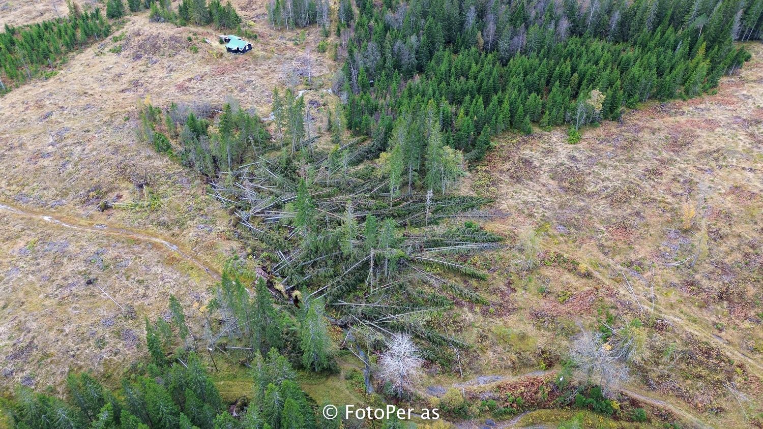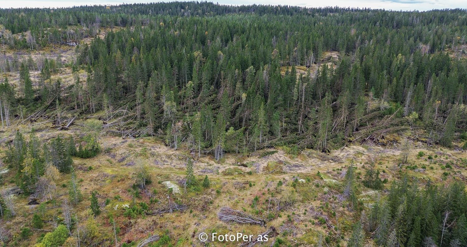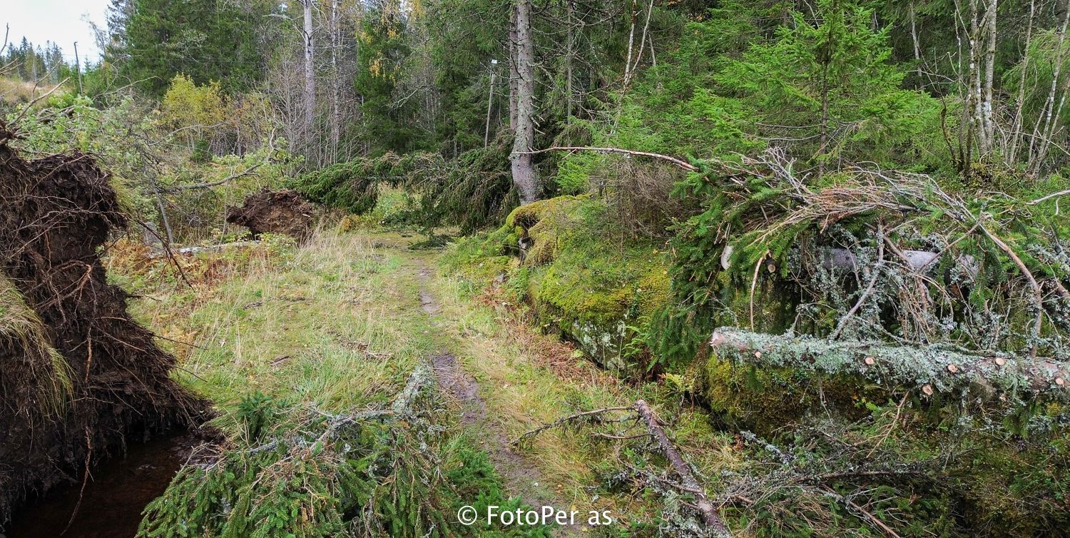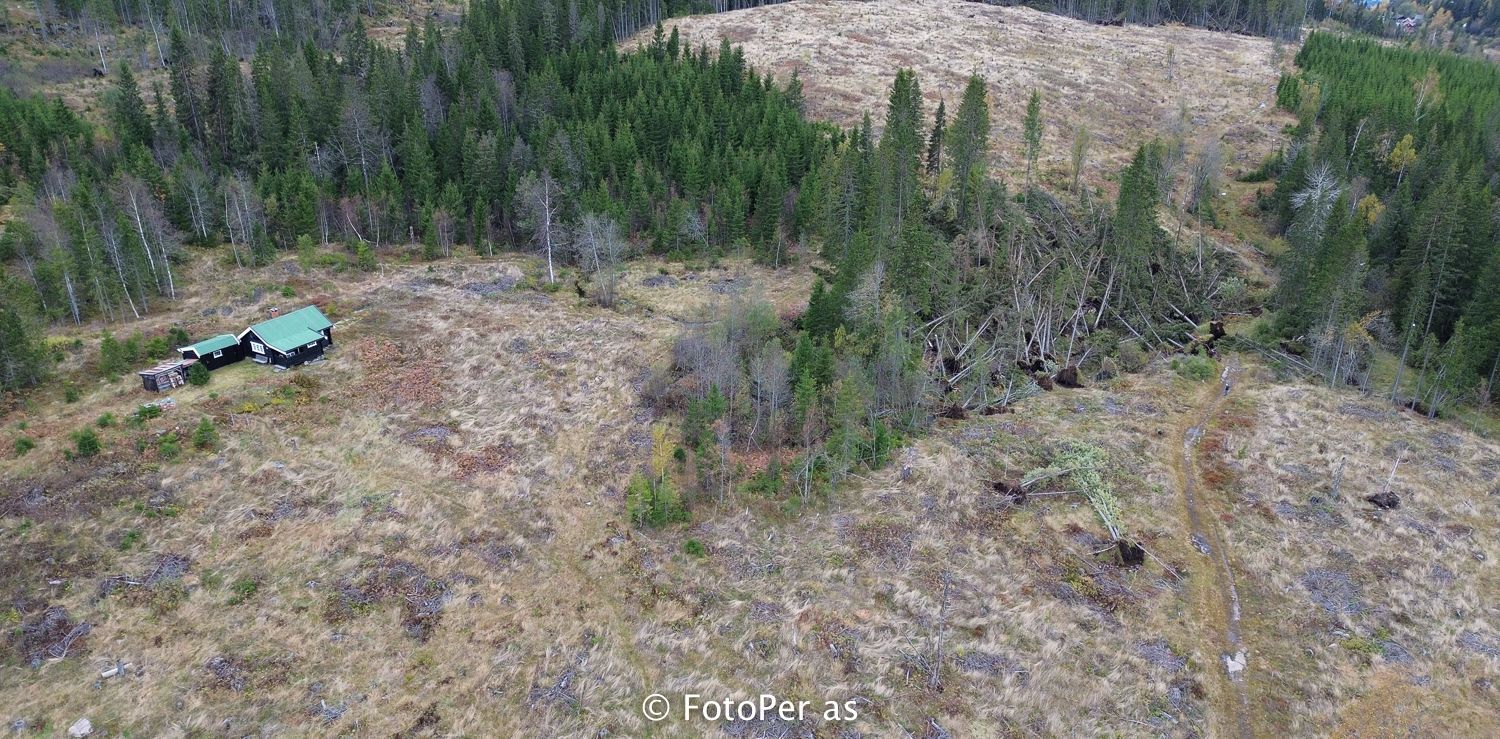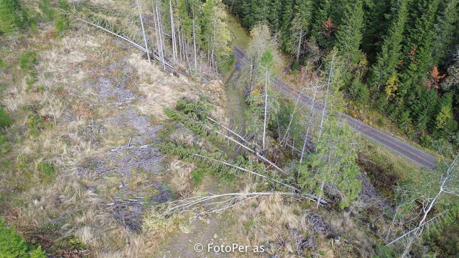 Det er ny dag og jeg har med drona for å få noen oversiktsbilder over skadene på skauen. Nå ser jeg bedre hvor mange trær som har blåst ned nær hytta. I går var det umulig å komme fram på stien, men etter jeg tok en runde med motorsaga, går det nå an å komme fram der på stien mellom Kleivstua og Sørsetra. I tillegg fjernet jeg noen greiner på trærne som sperrer Nordseterveien.