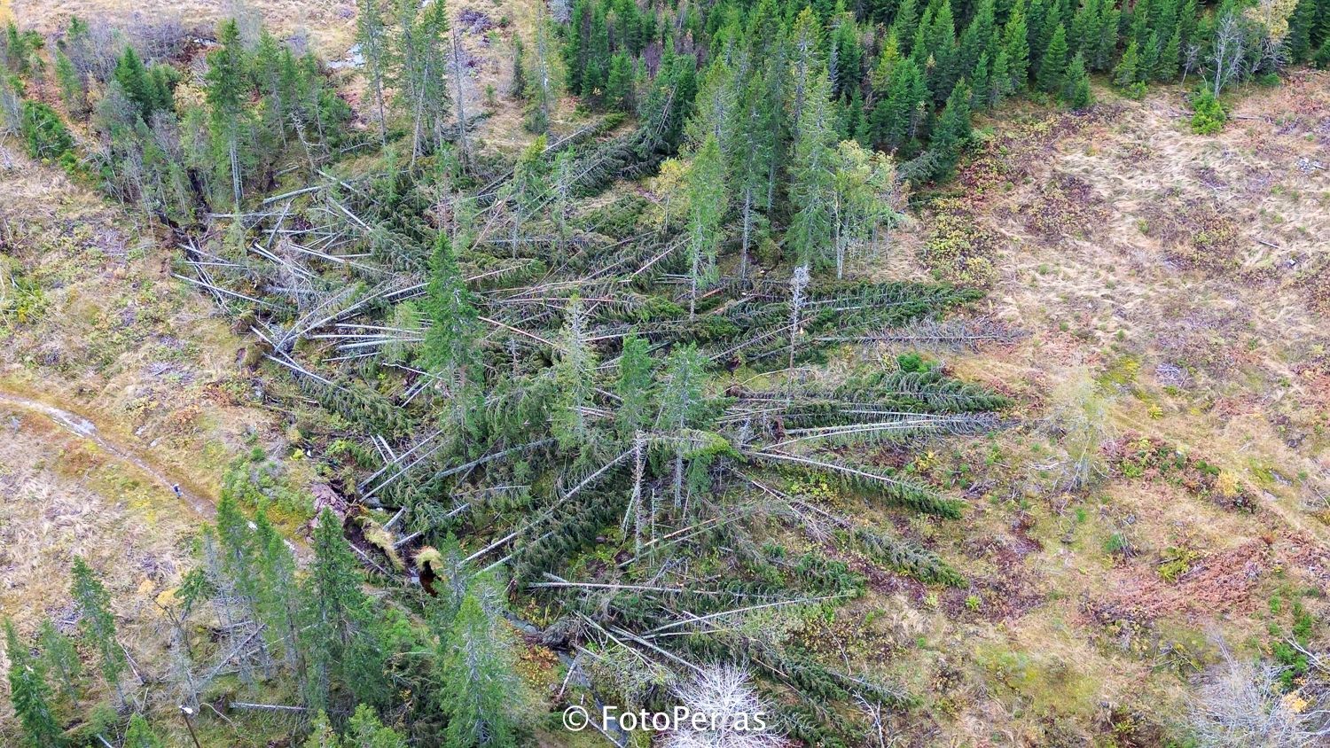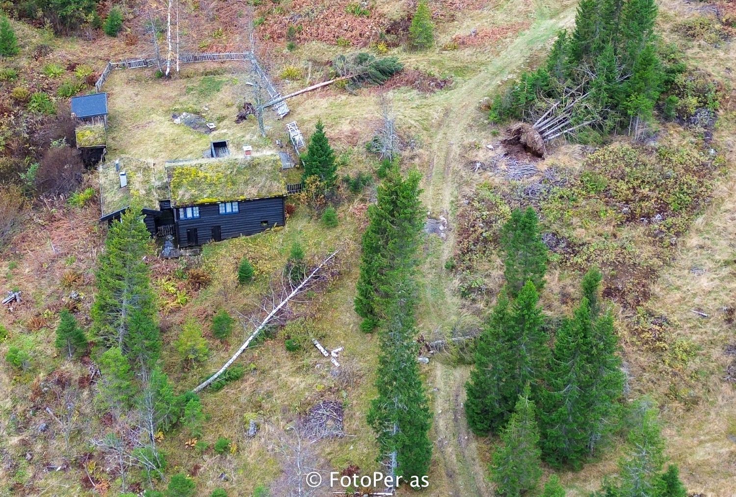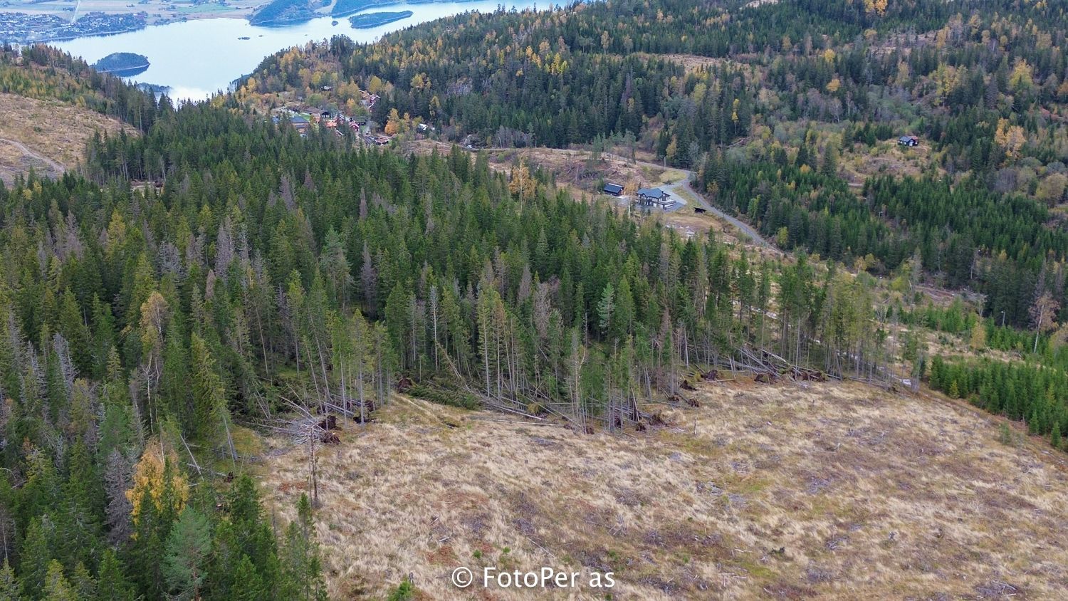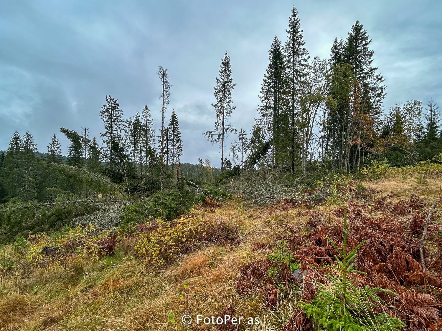 Det er ny dag og jeg har med drona for å få noen oversiktsbilder over skadene på skauen. Nå ser jeg bedre hvor mange trær som har blåst ned nær hytta. I går var det umulig å komme fram på stien, men etter jeg tok en runde med motorsaga, går det nå an å komme fram der på stien mellom Kleivstua og Sørsetra. I tillegg fjernet jeg noen greiner på trærne som sperrer Nordseterveien.