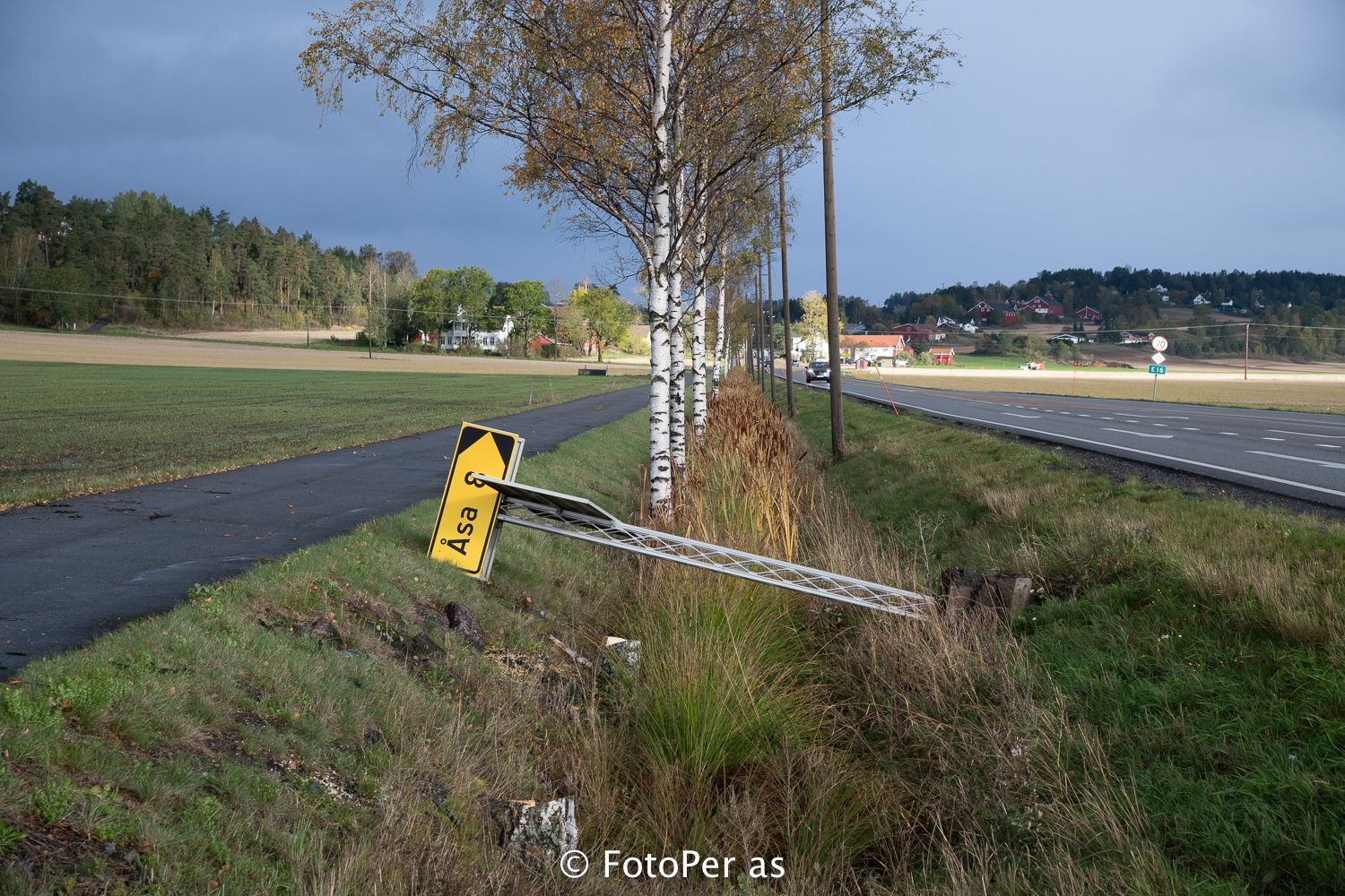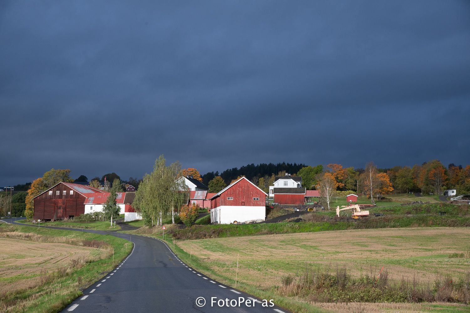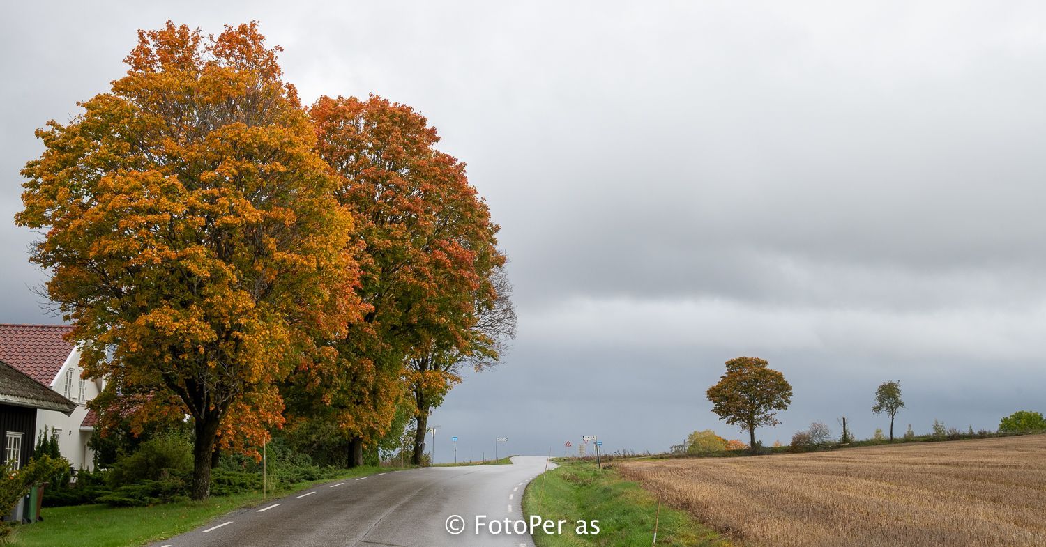 I Åsaveien, ved Vaker, er det noen høstvakre bjørketrær. Når jeg snur meg andre veien ligger gården til Løbben med en dramatisk himmel over seg.