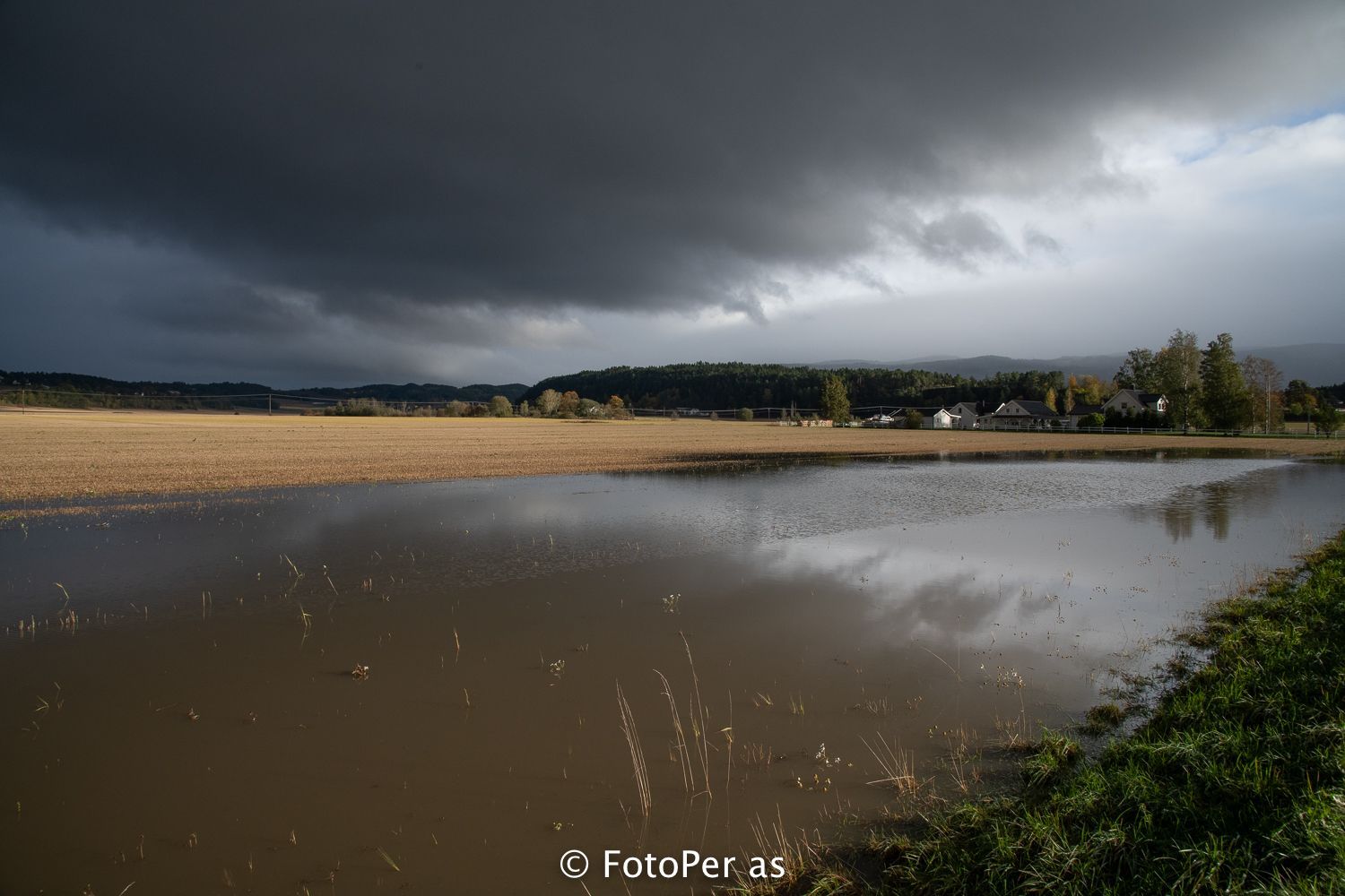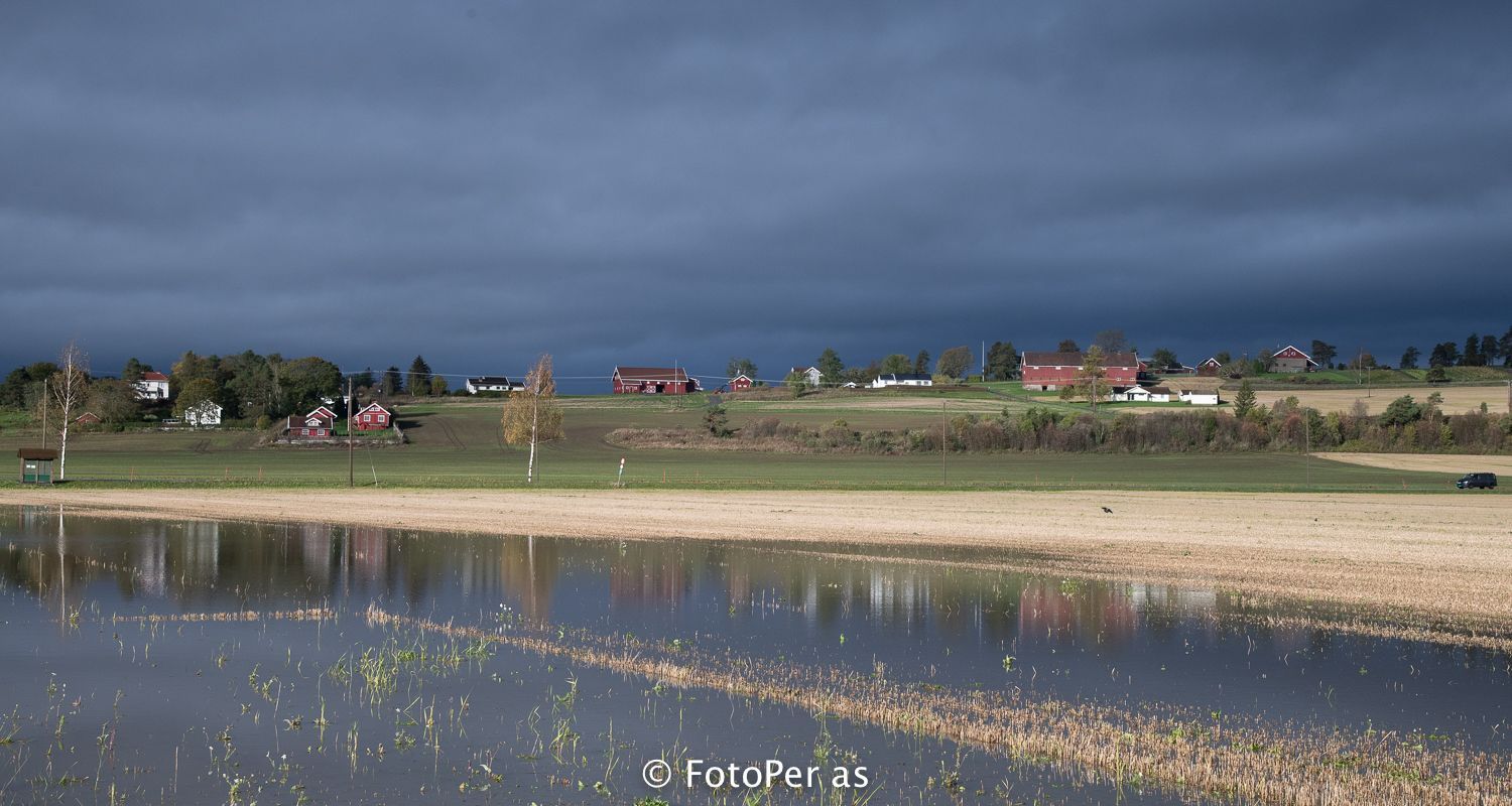 Når jeg kjører fra Åsa mot Steinsletta, oppdager jeg en ny innsjø på åkeren. Og veiskiltet har lagt seg ned i grøfta.