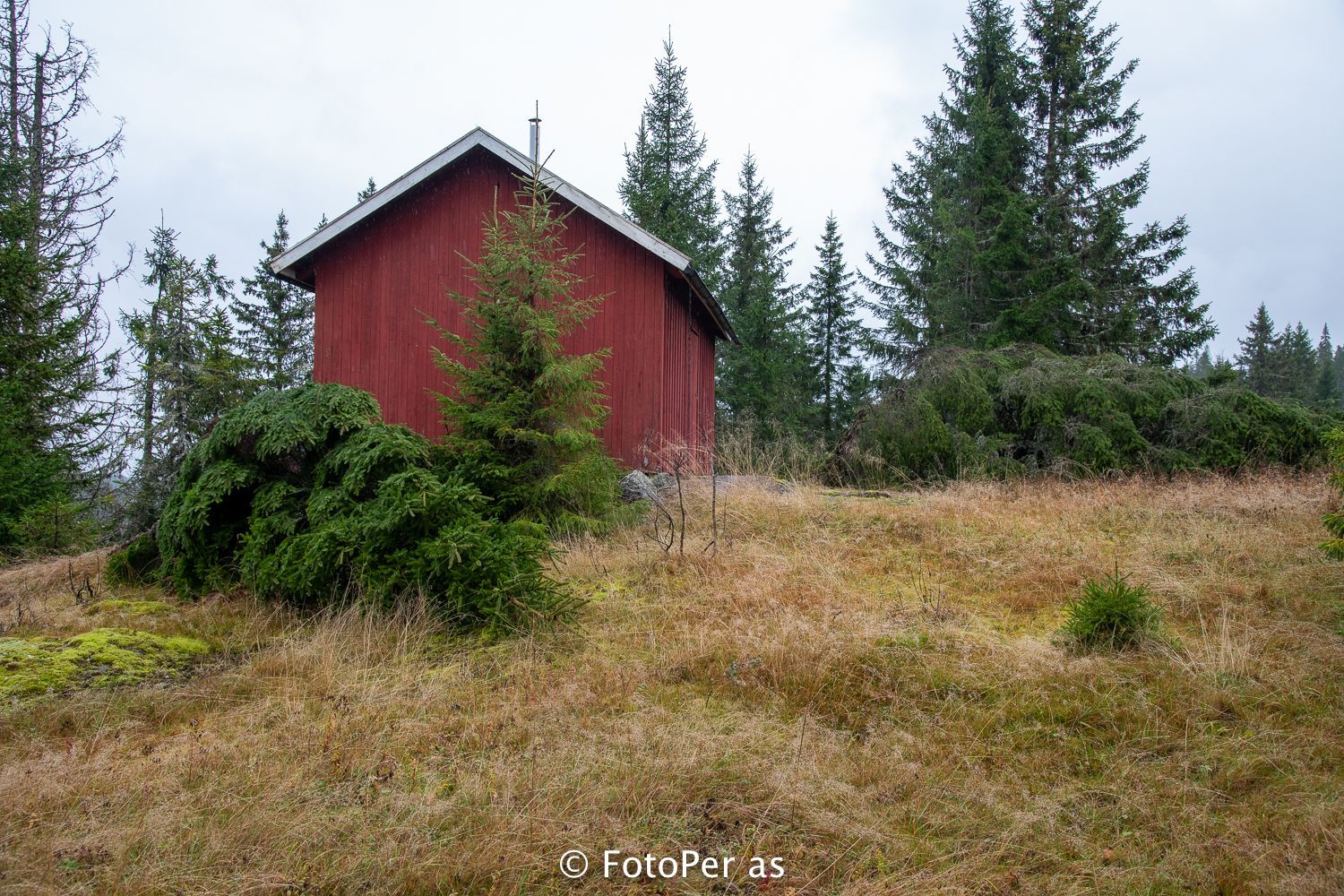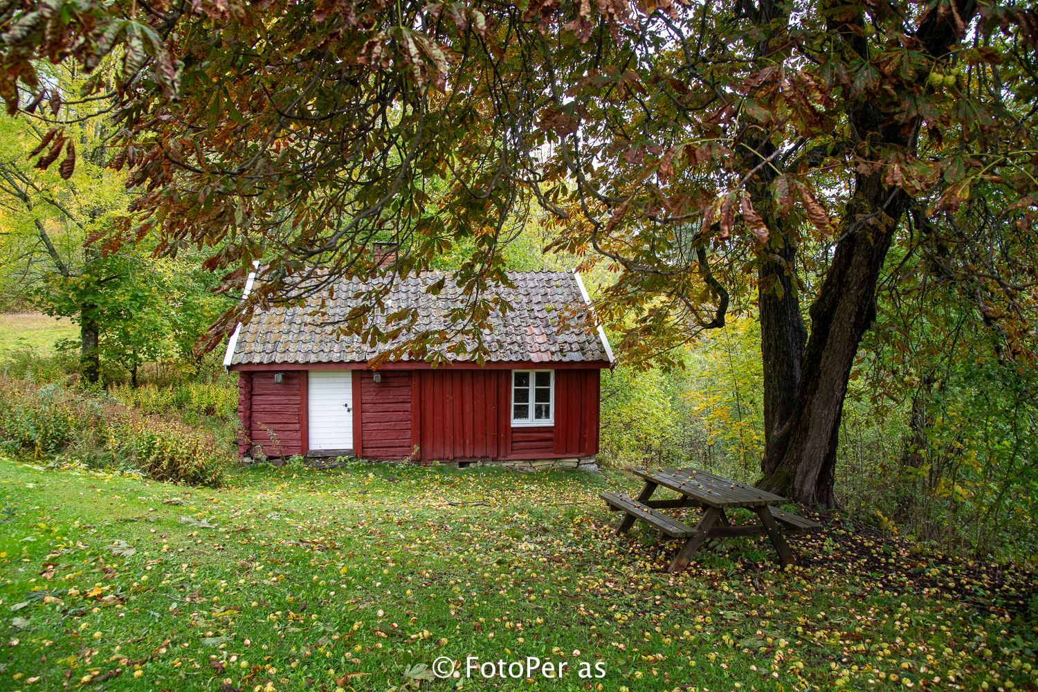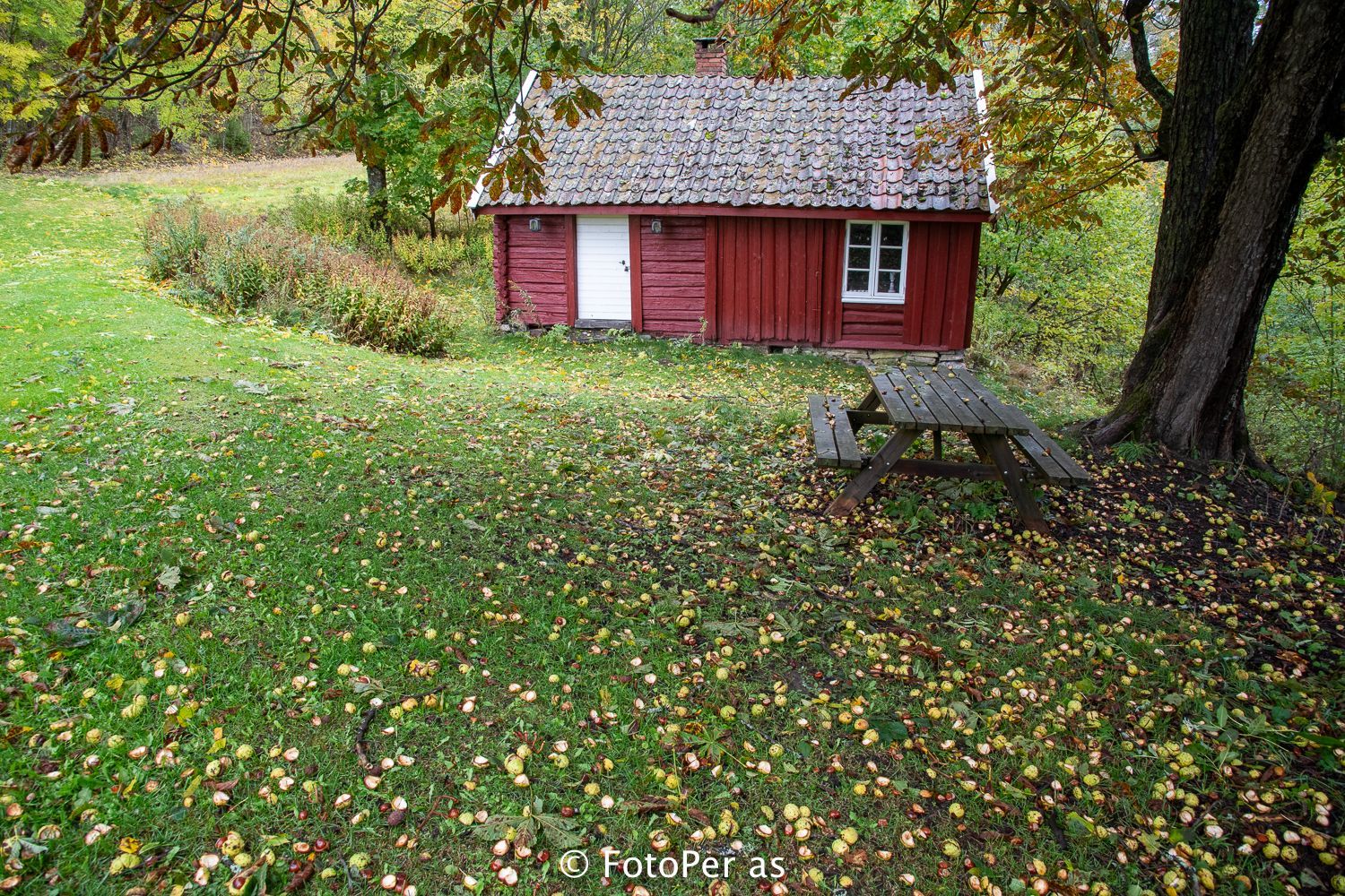 Høstvakkert i Gjesvoldåsen. Plenen foran hytta er full av kastanjenøtter etter at Amy har filleristet treet.