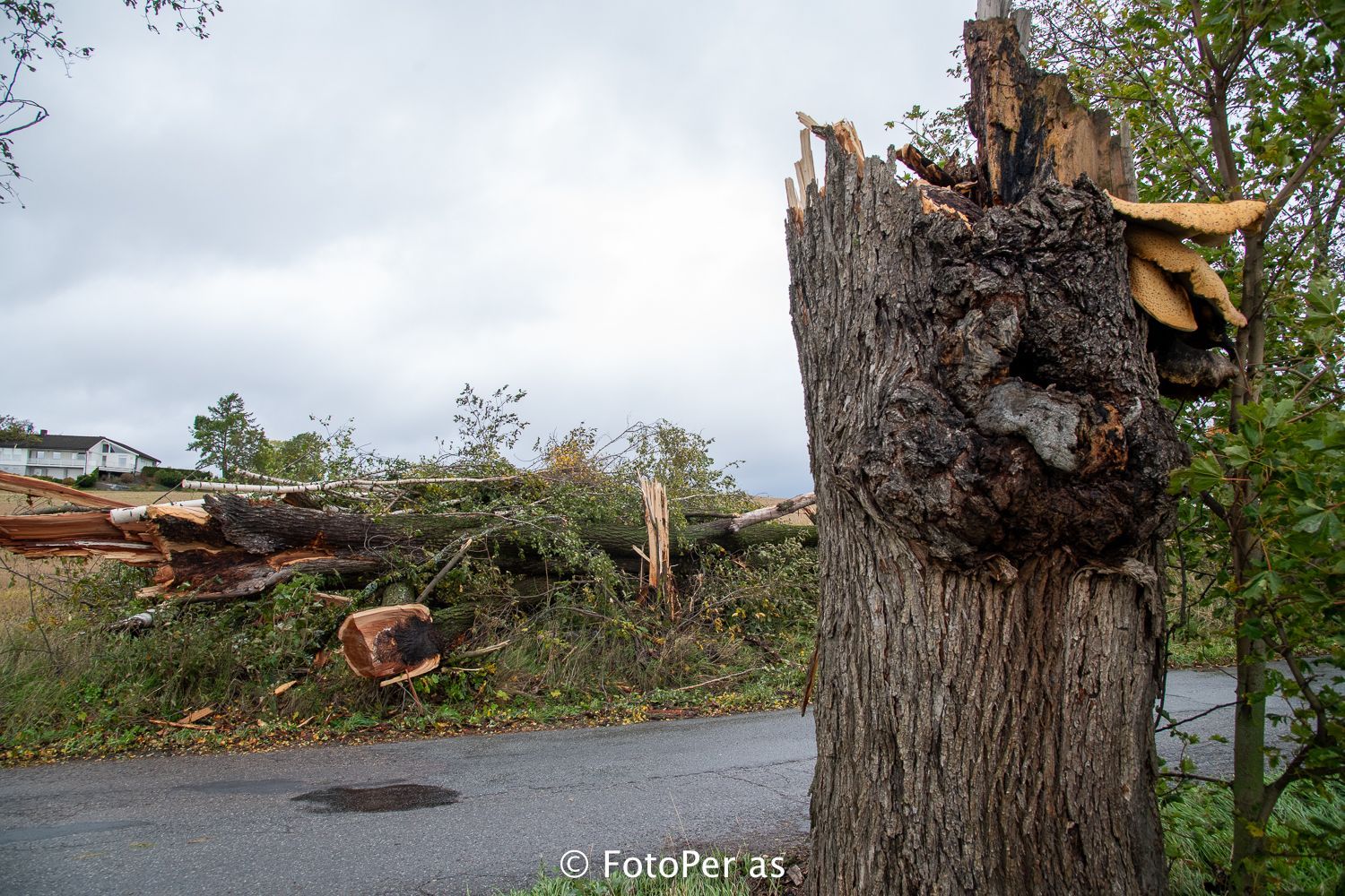 Ved Røyse skole er det stort tre som har knekt. Se den store soppen oppe til høyre på stammen.