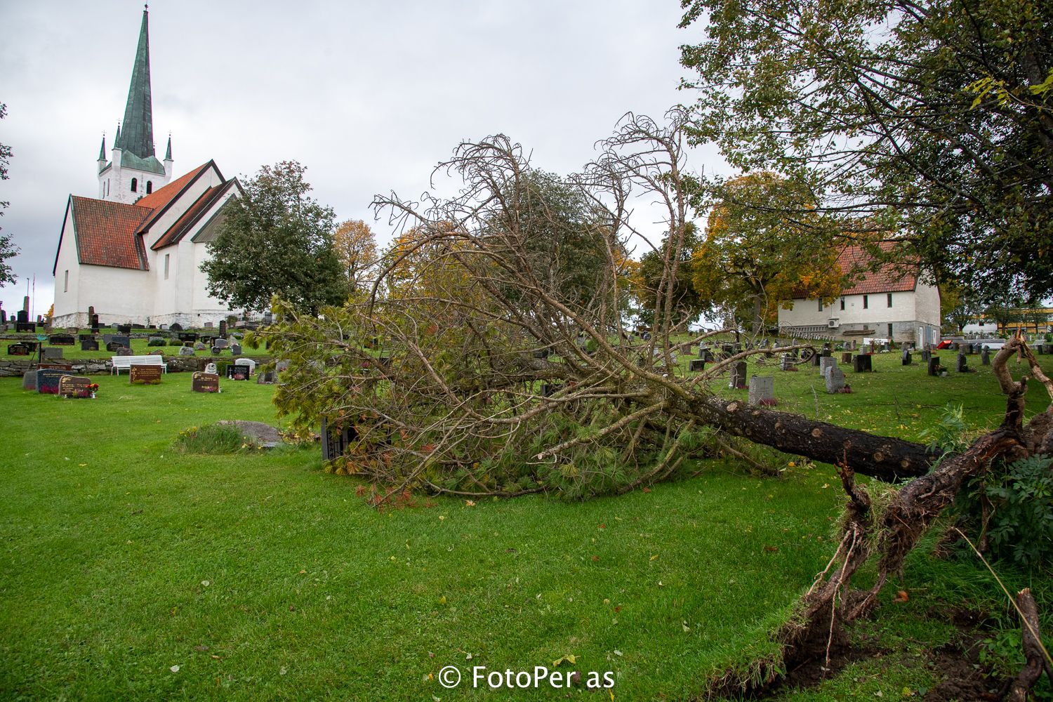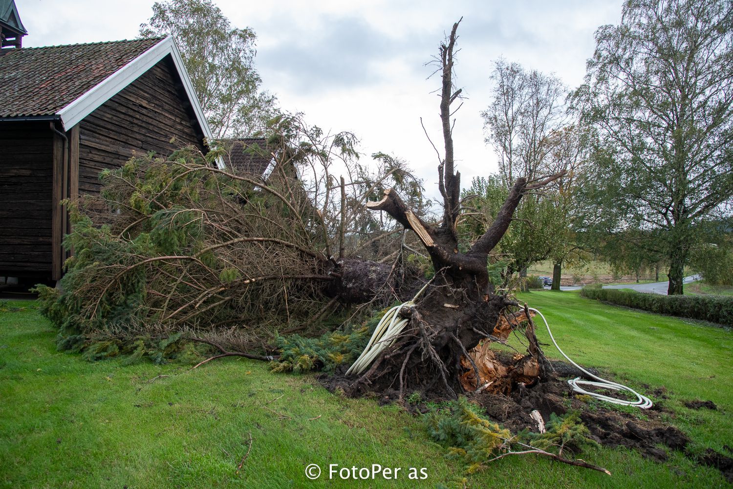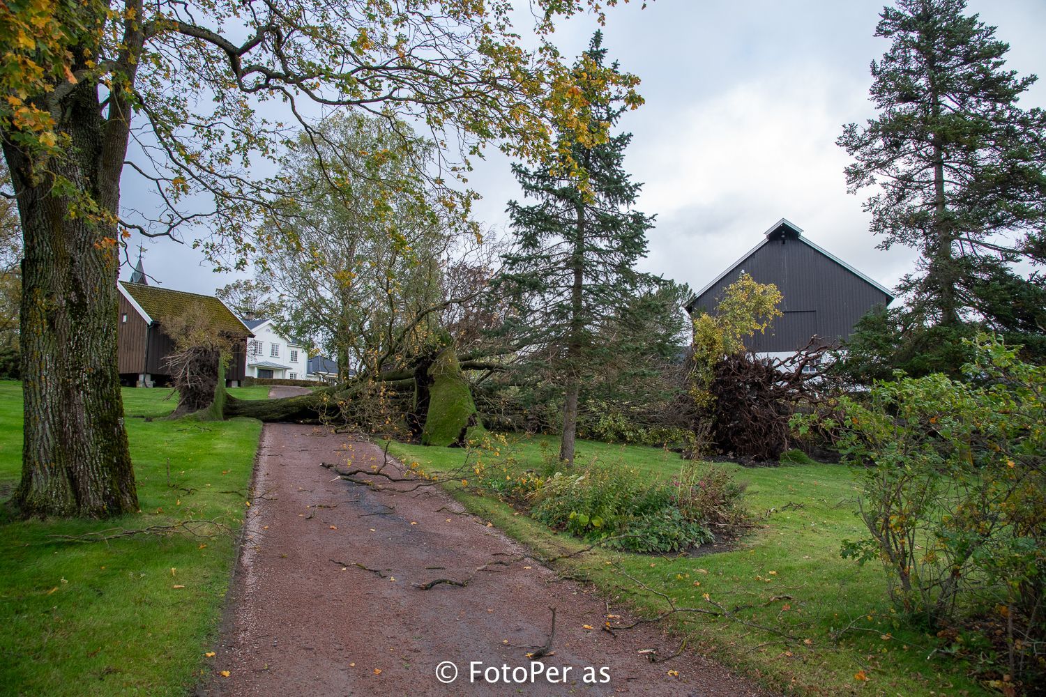 Ved Ringerikes museum og Norderhov kirke har trær og store greiner knekt. Og gjerdet ble ødelagt.