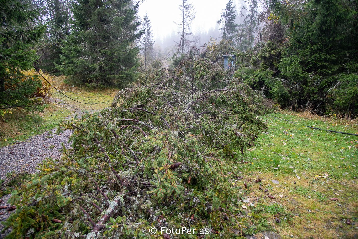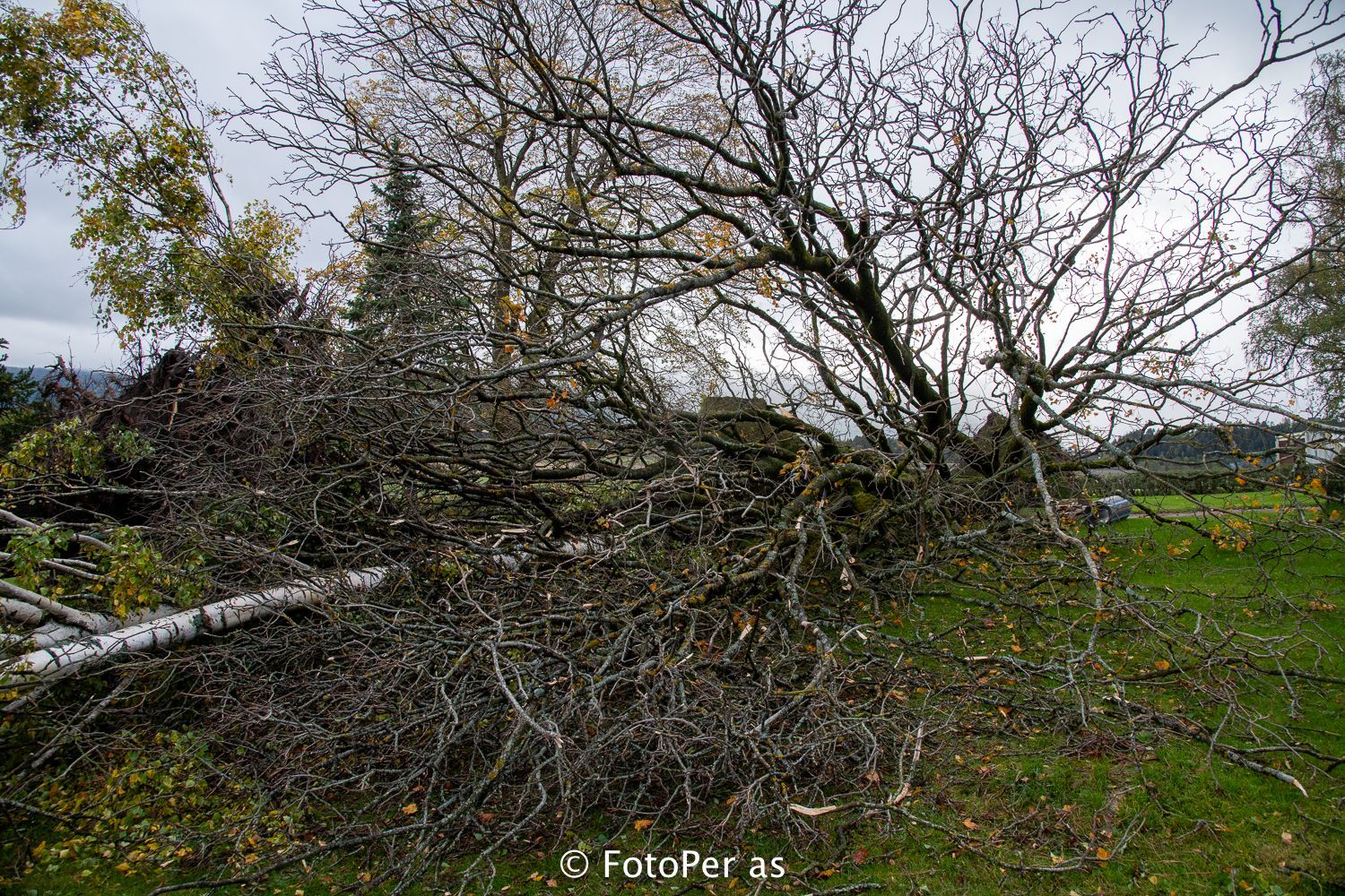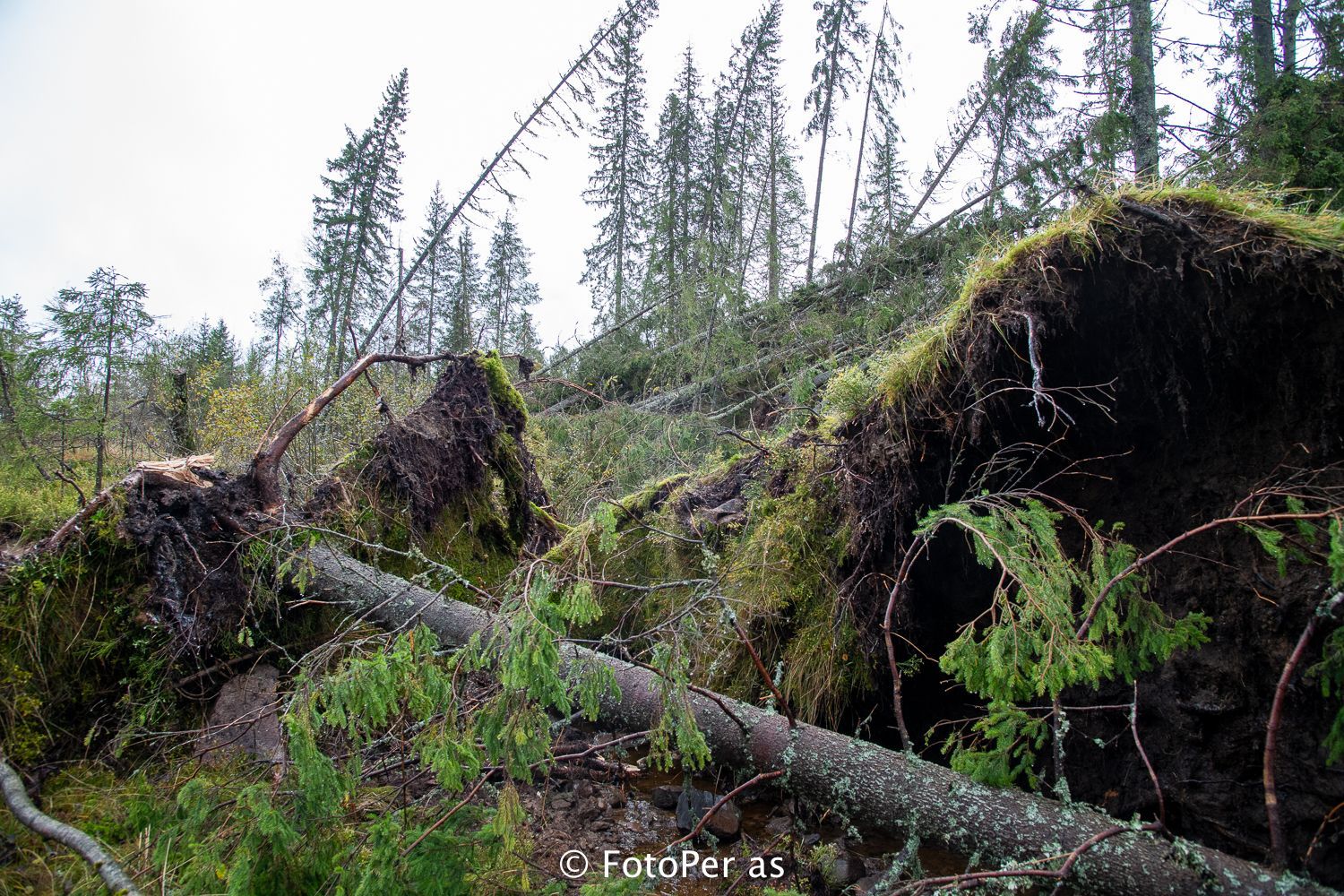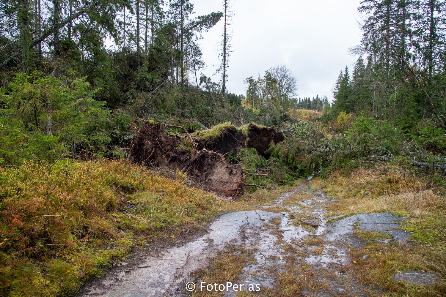 Store furutrær hadde lagt seg ned nær veien mot HRA-anlegget. Kassene til Elstøen ble nesten borte i trærne som hadde veltet.