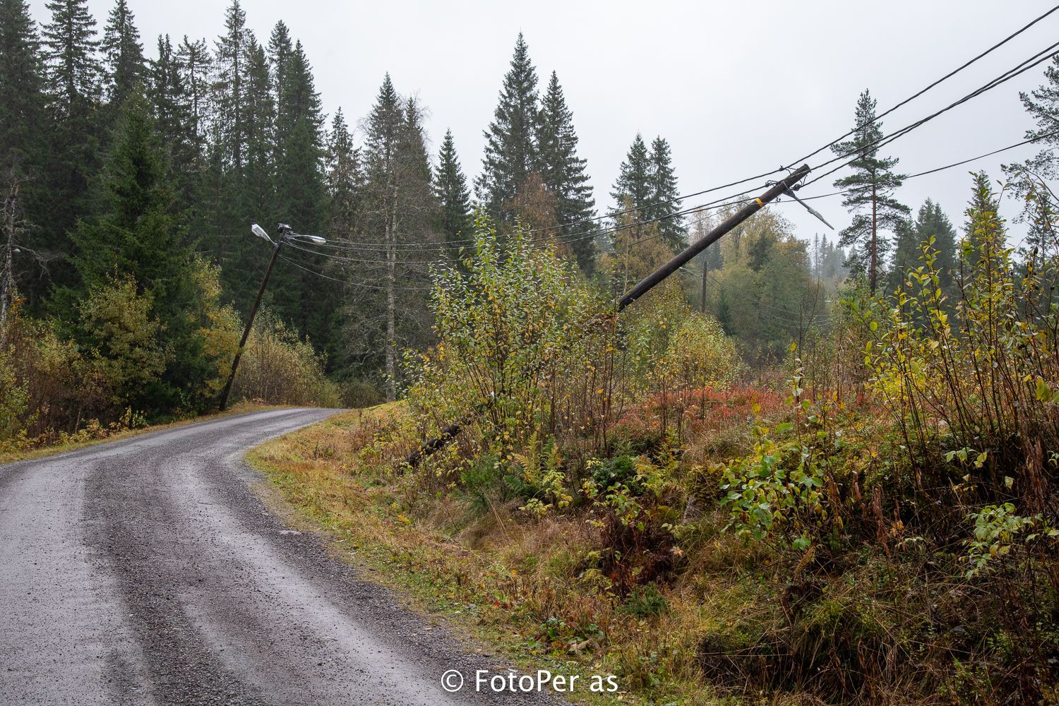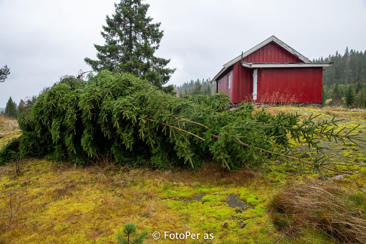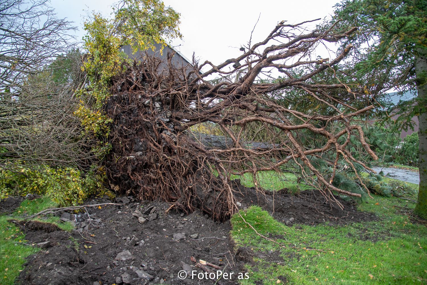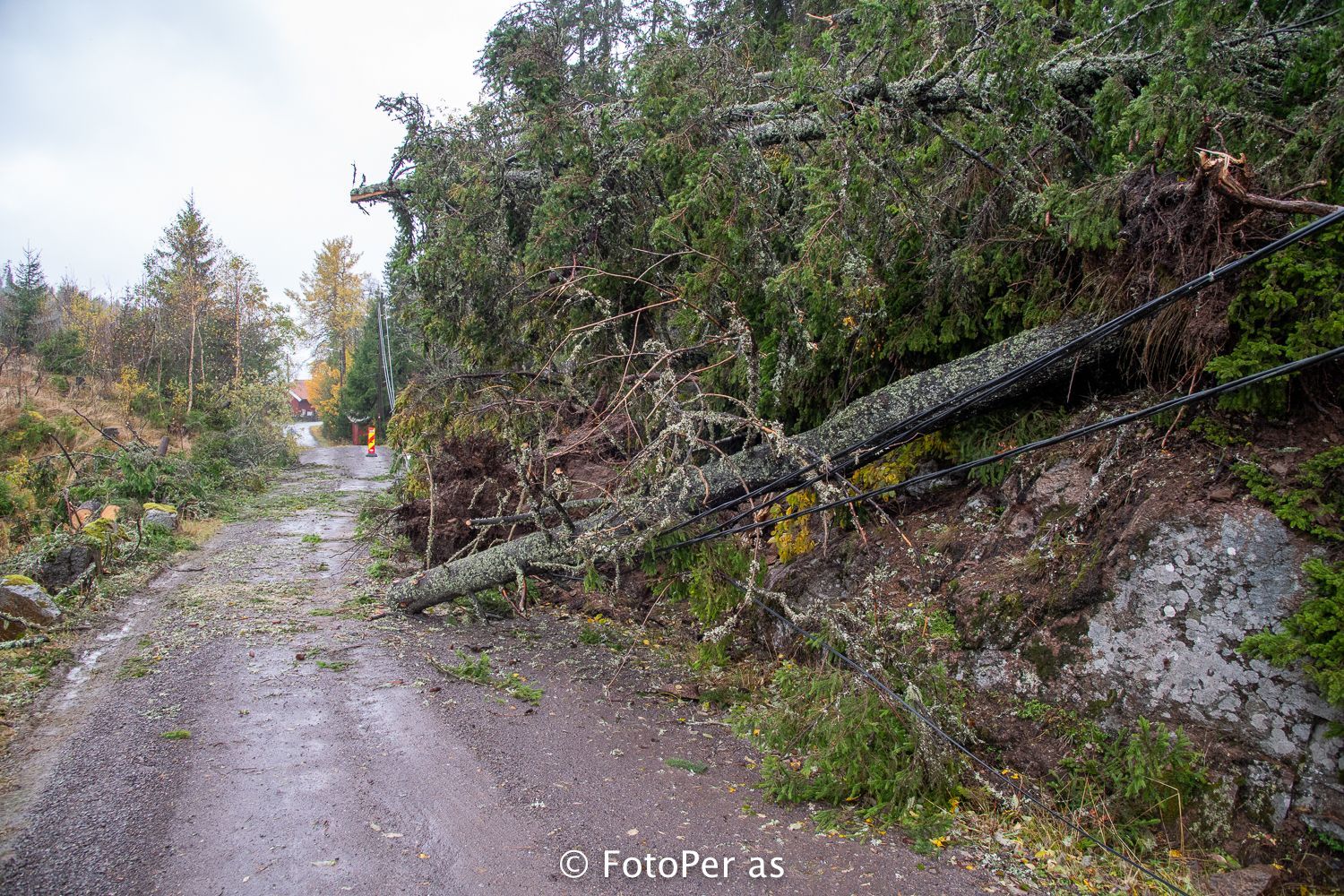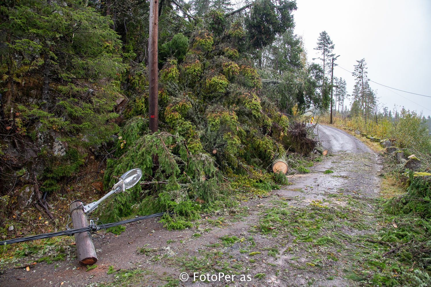 Store furutrær hadde lagt seg ned nær veien mot HRA-anlegget. Kassene til Elstøen ble nesten borte i trærne som hadde veltet.
