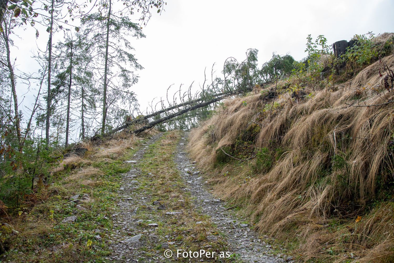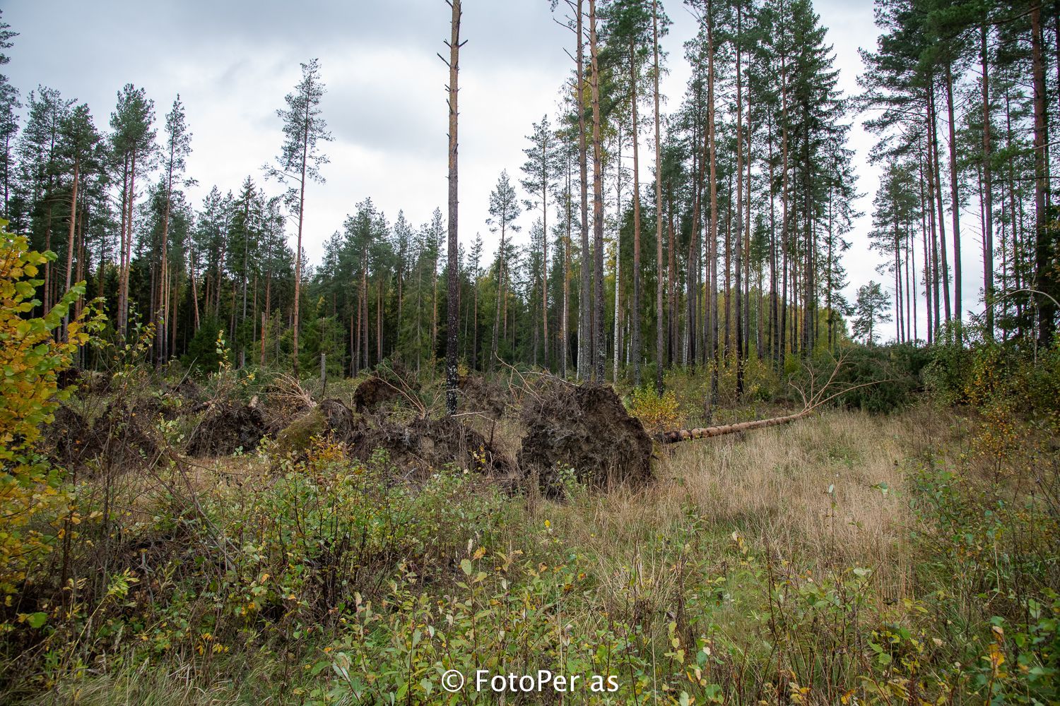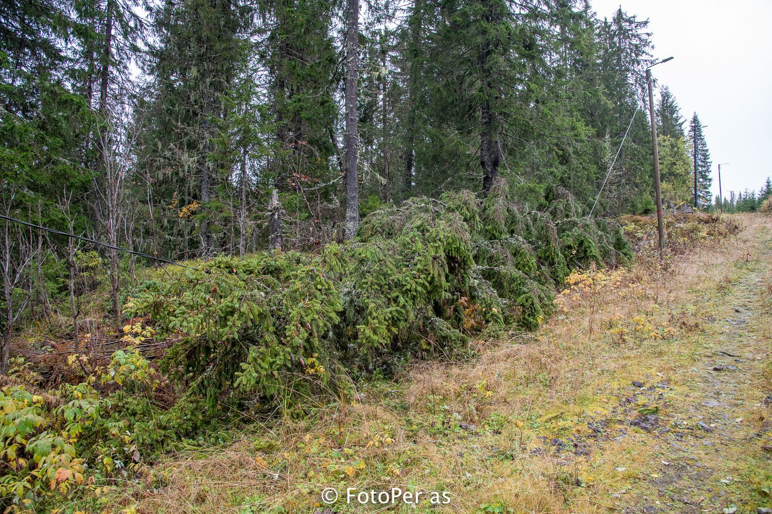 Langs Sørseterveien kan jeg se mange trær som ligger på kryss og tvers.