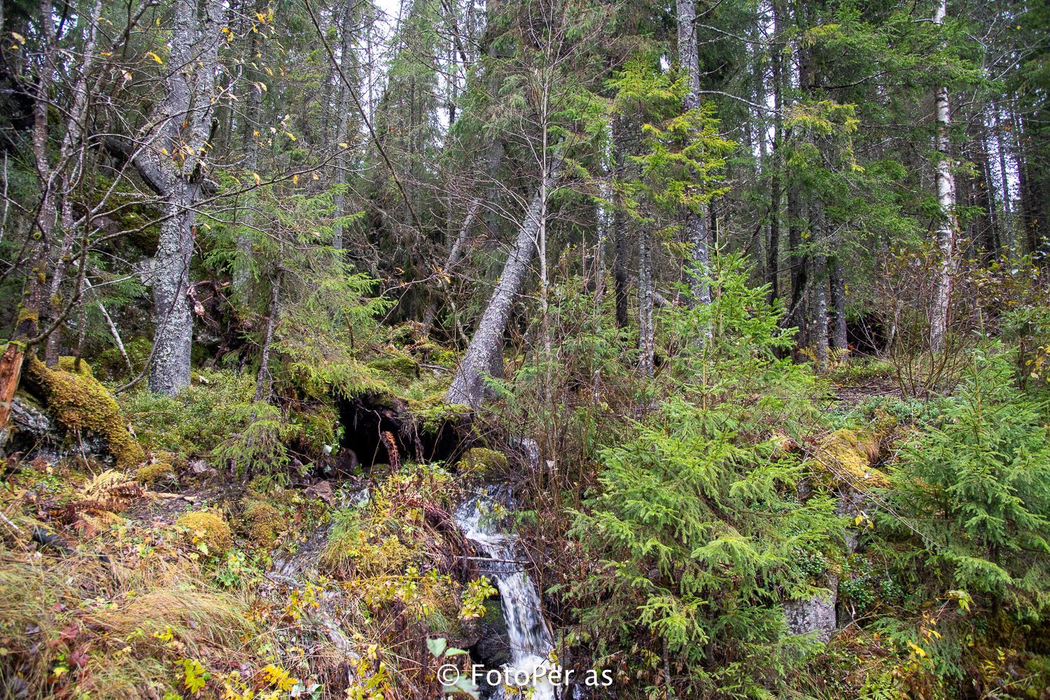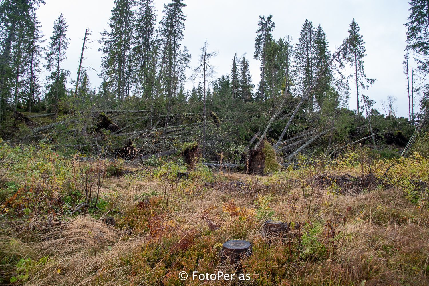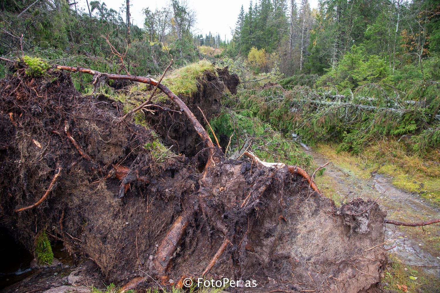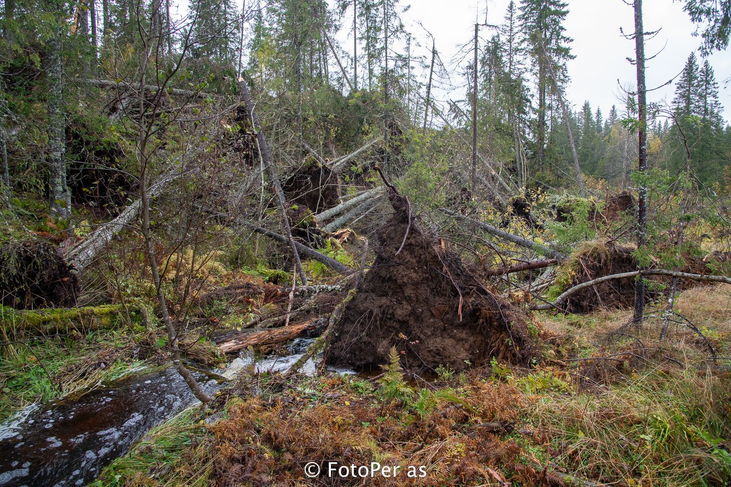 Det sto igjen noen trær ved bekken nedenfor hytta etter hogsten for noen år siden. Nå er det meste av trærne blåst ned. Bekken har funnet nye veier å renne, og det er nesten umulig å komme fram til fots.