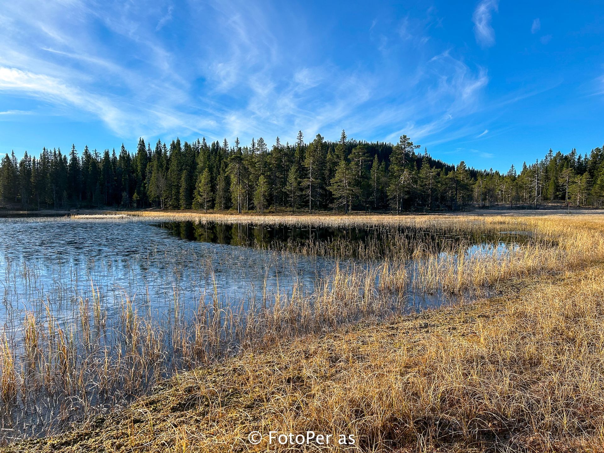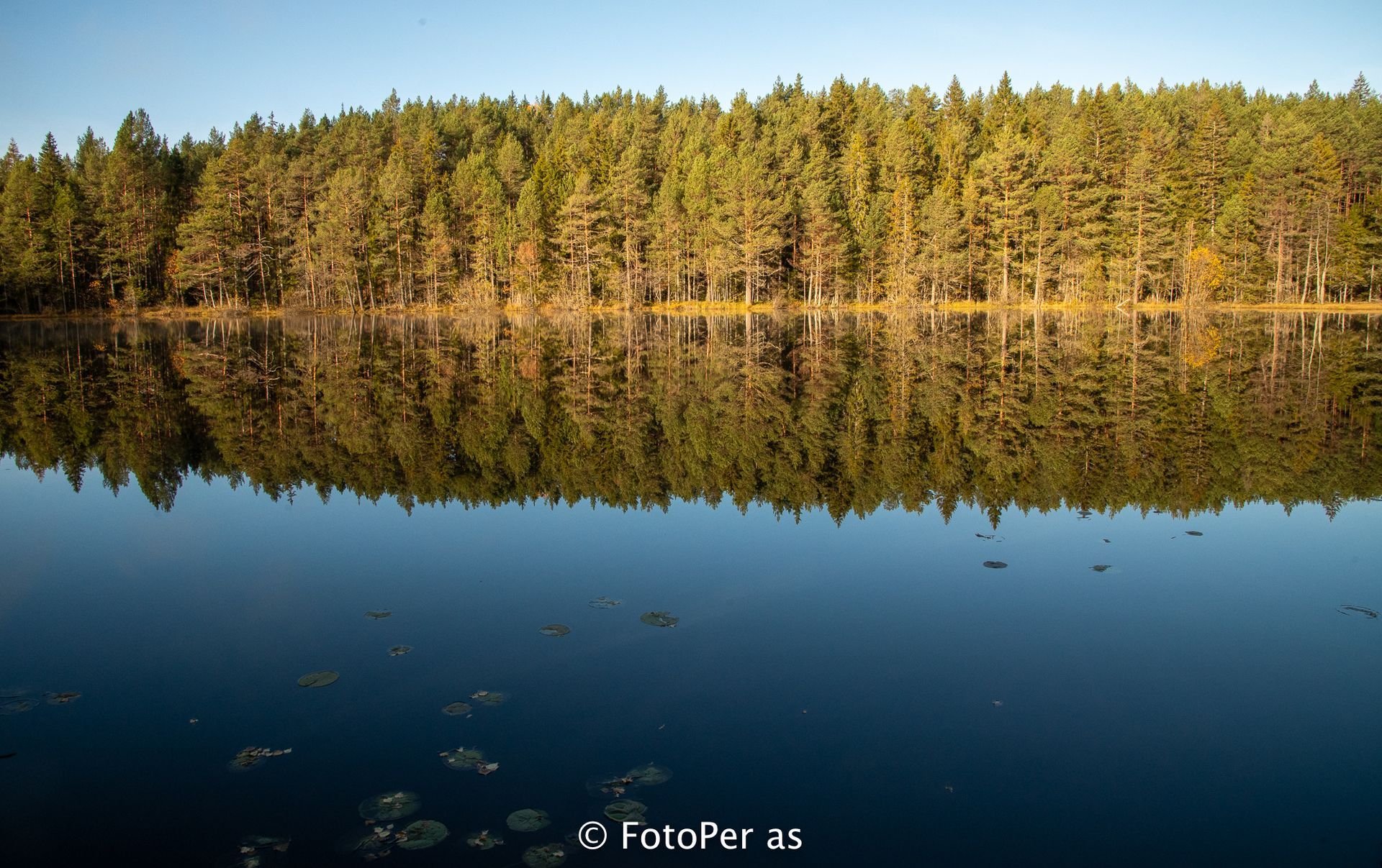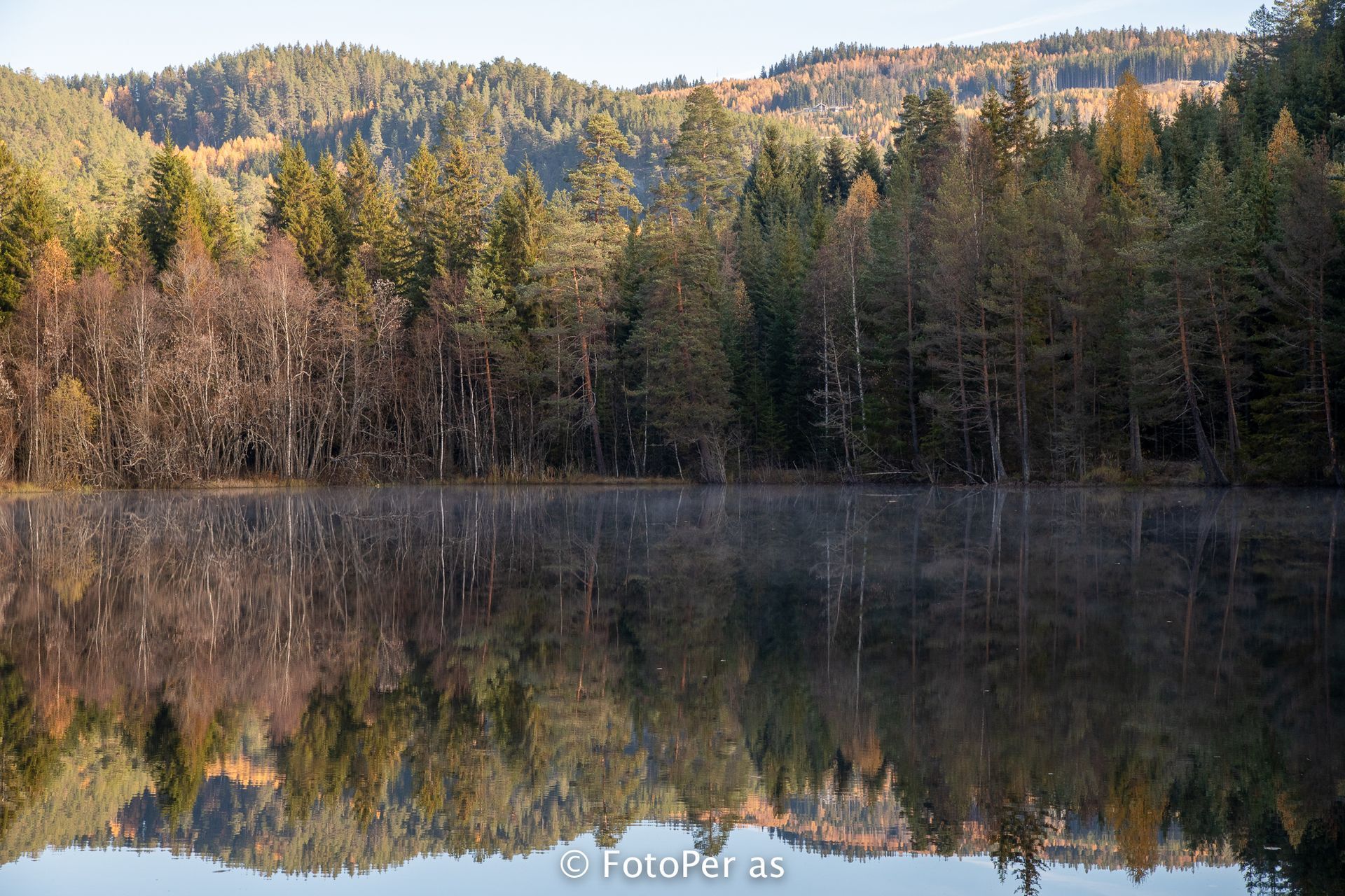 Parkerer der jeg pleier og går inn mot Grunntjern. Går ikke lenge før jeg møter trær på tvers av veien. Går ned til tjernet, stille og rolig på vannet som er omkranset av høstfarger.