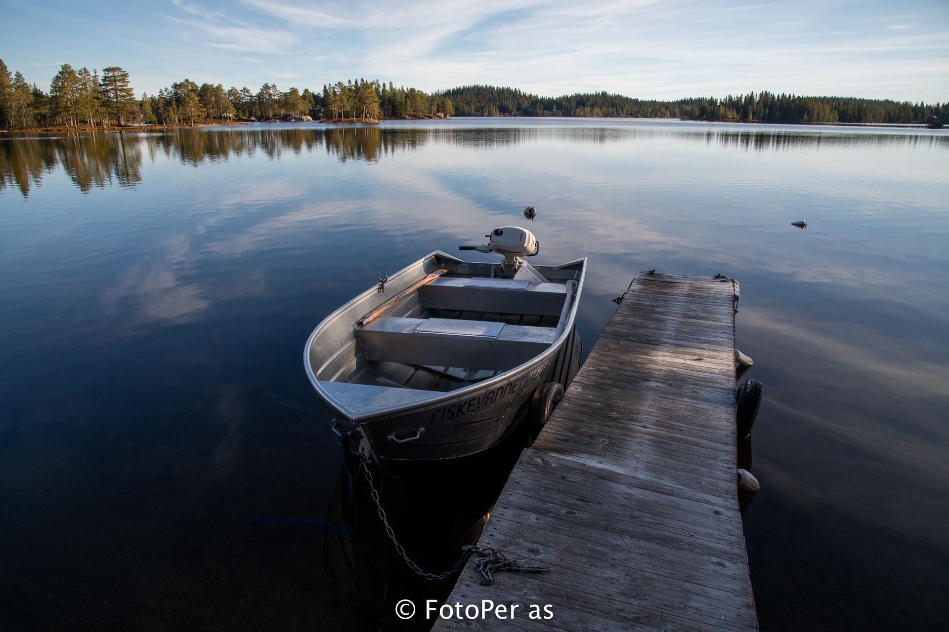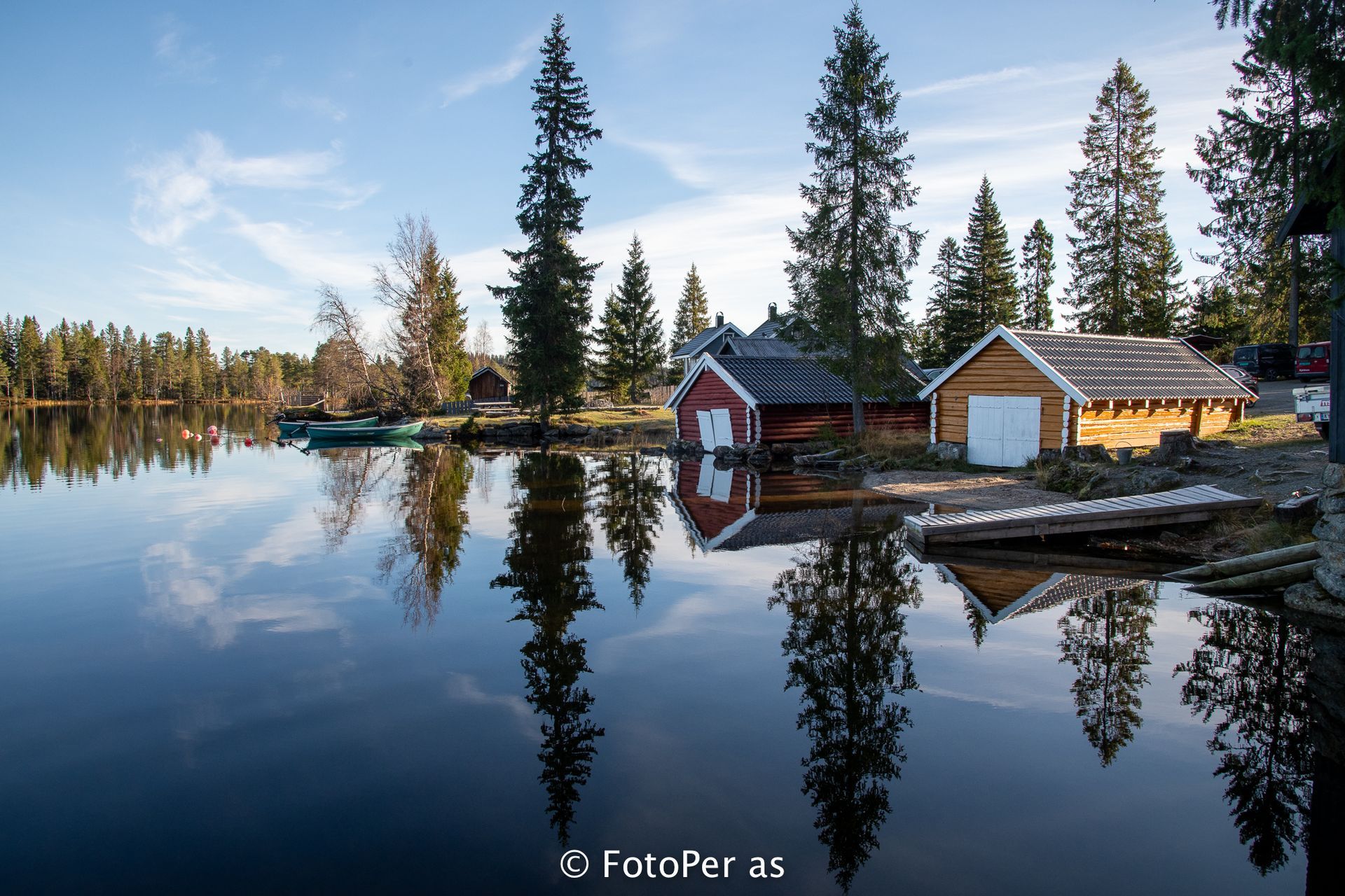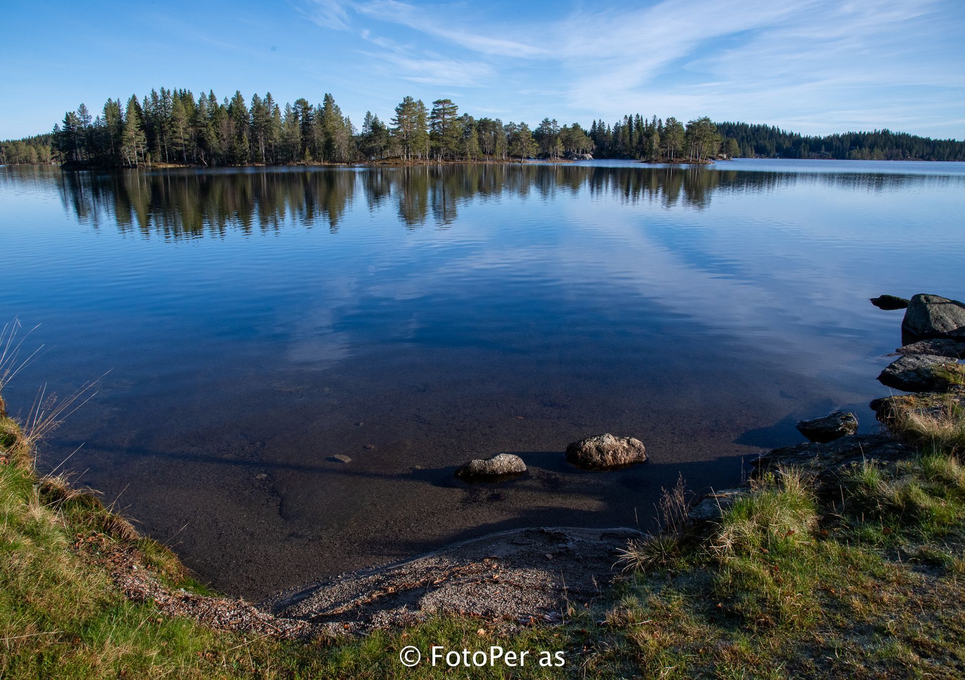 Parkerer der jeg pleier og går inn mot Grunntjern. Går ikke lenge før jeg møter trær på tvers av veien. Går ned til tjernet, stille og rolig på vannet som er omkranset av høstfarger.
