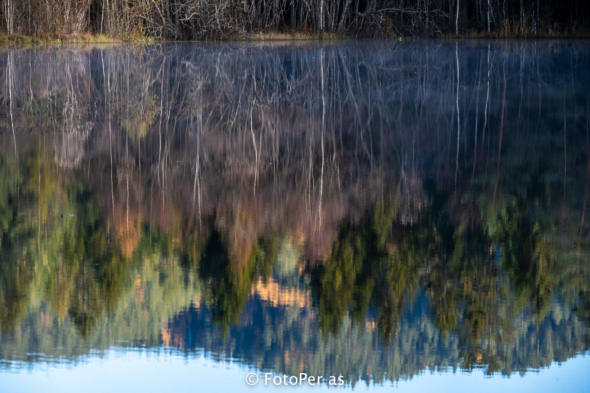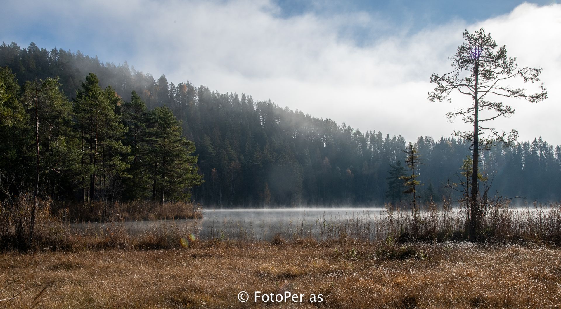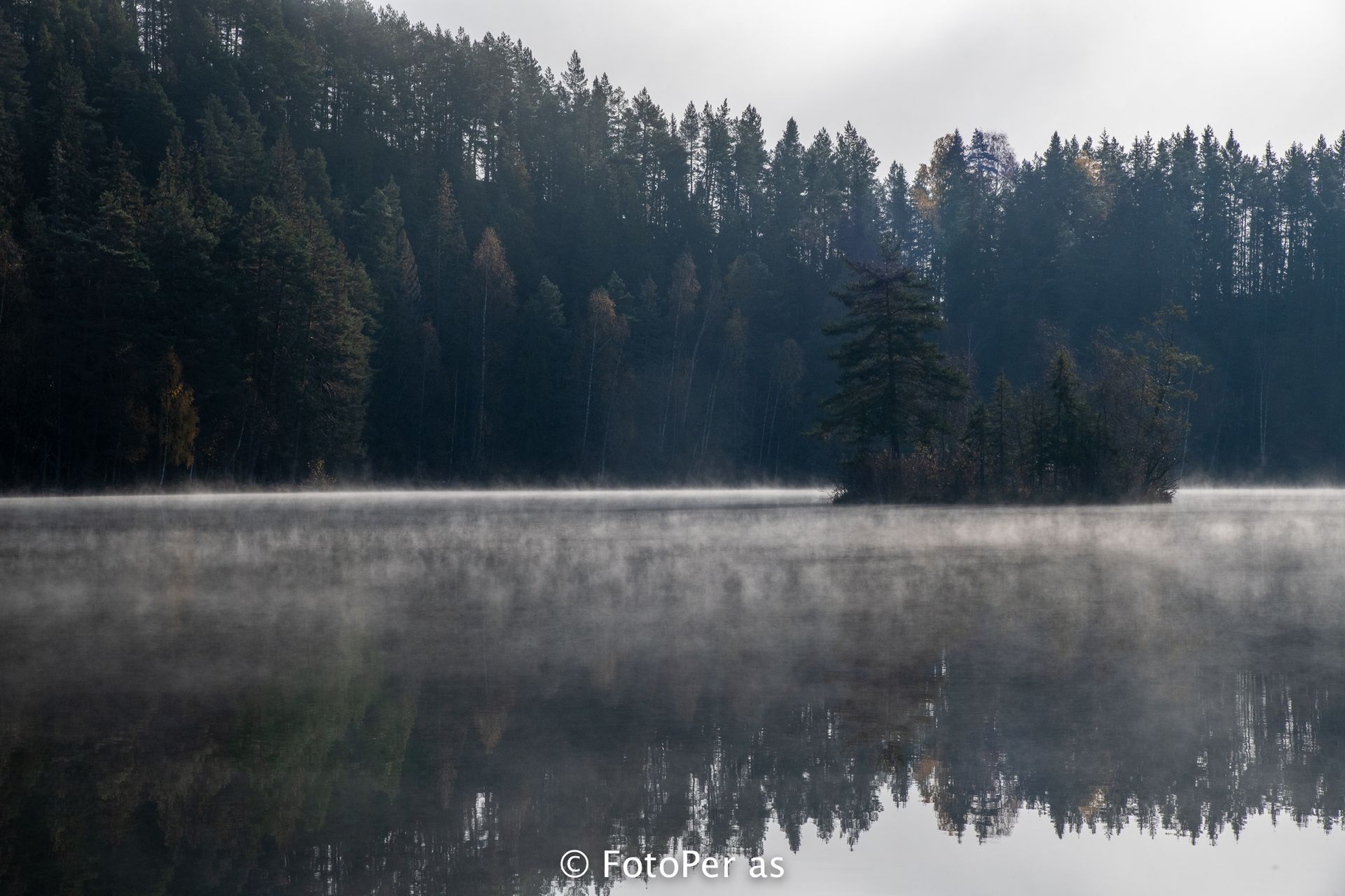 Og flere blir det på stien videre. Jeg kommer fram til tjernet, helt bort til kanten av det. Har bare sko på meg, men det er litt frost i bakken, så jeg kommer greit fram. Ser et fuglepar som svømmer ved øya, delvis omgitt av tåke. Lyset og tåka gjør at det blir litt mystisk stemning.