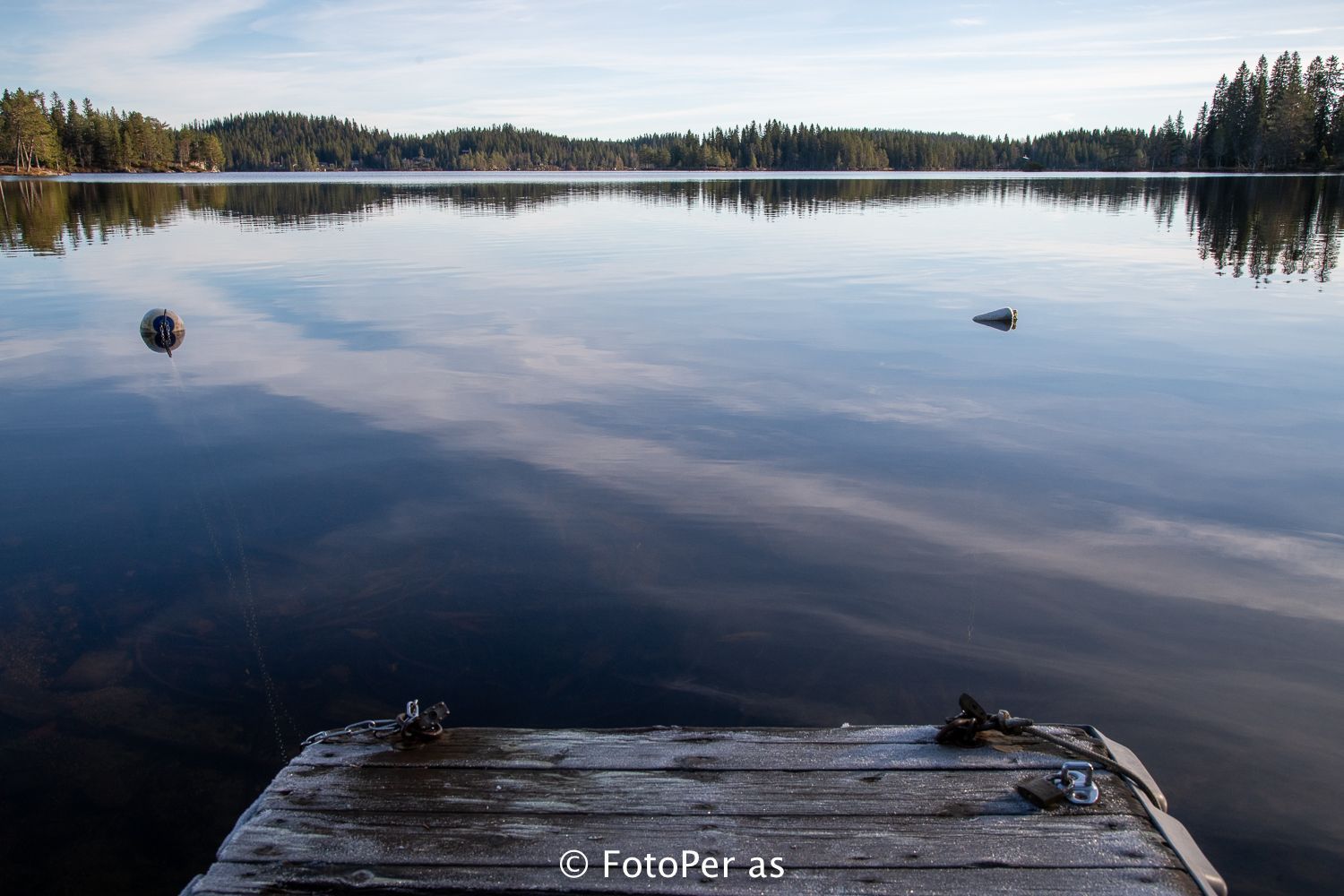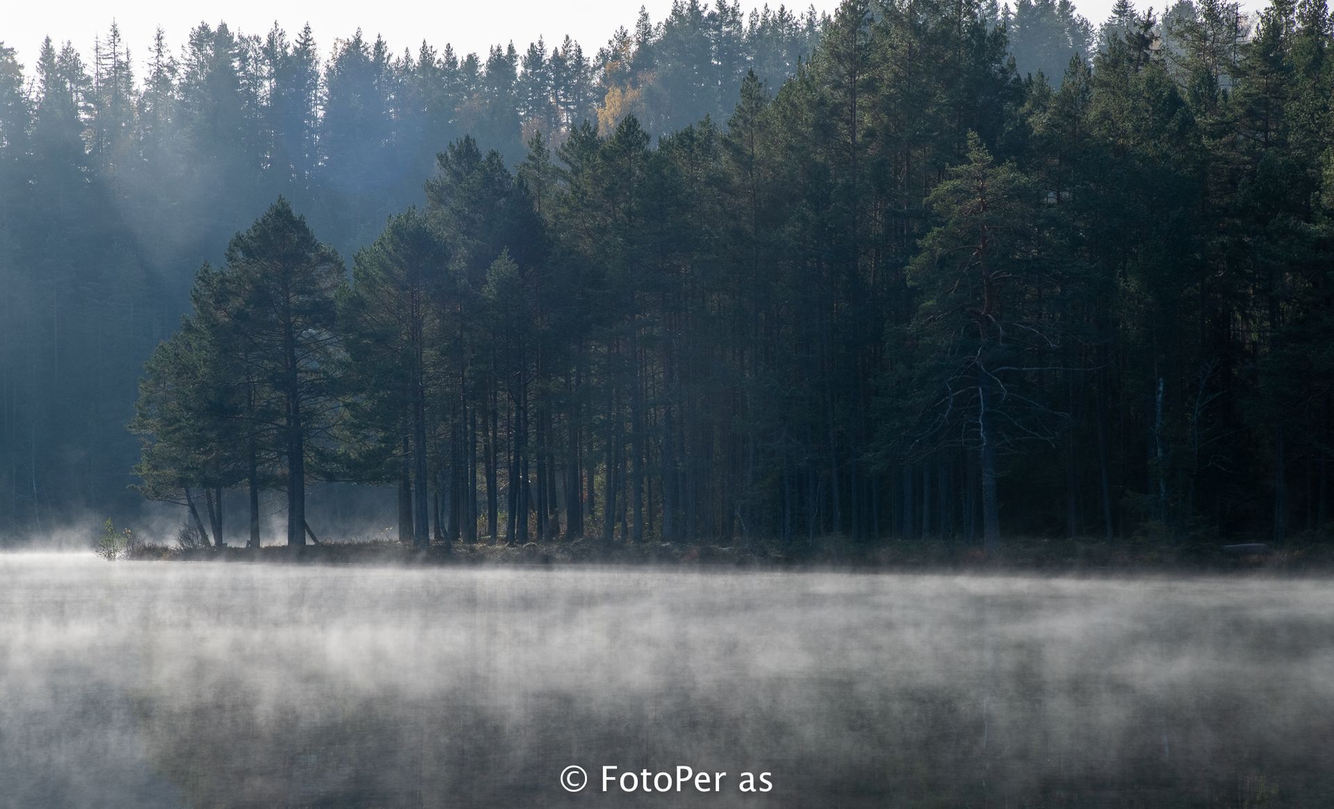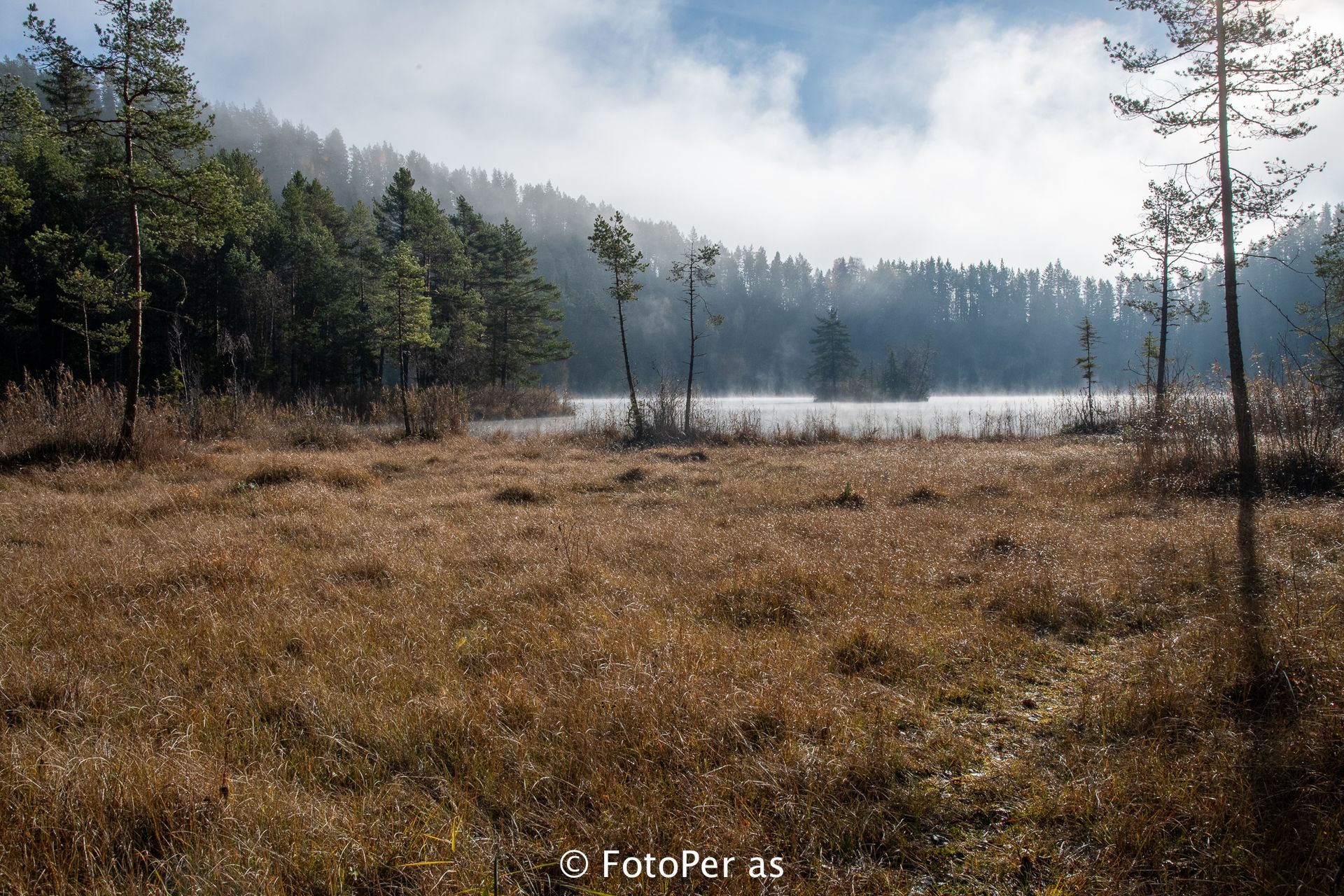 Og flere blir det på stien videre. Jeg kommer fram til tjernet, helt bort til kanten av det. Har bare sko på meg, men det er litt frost i bakken, så jeg kommer greit fram. Ser et fuglepar som svømmer ved øya, delvis omgitt av tåke. Lyset og tåka gjør at det blir litt mystisk stemning.