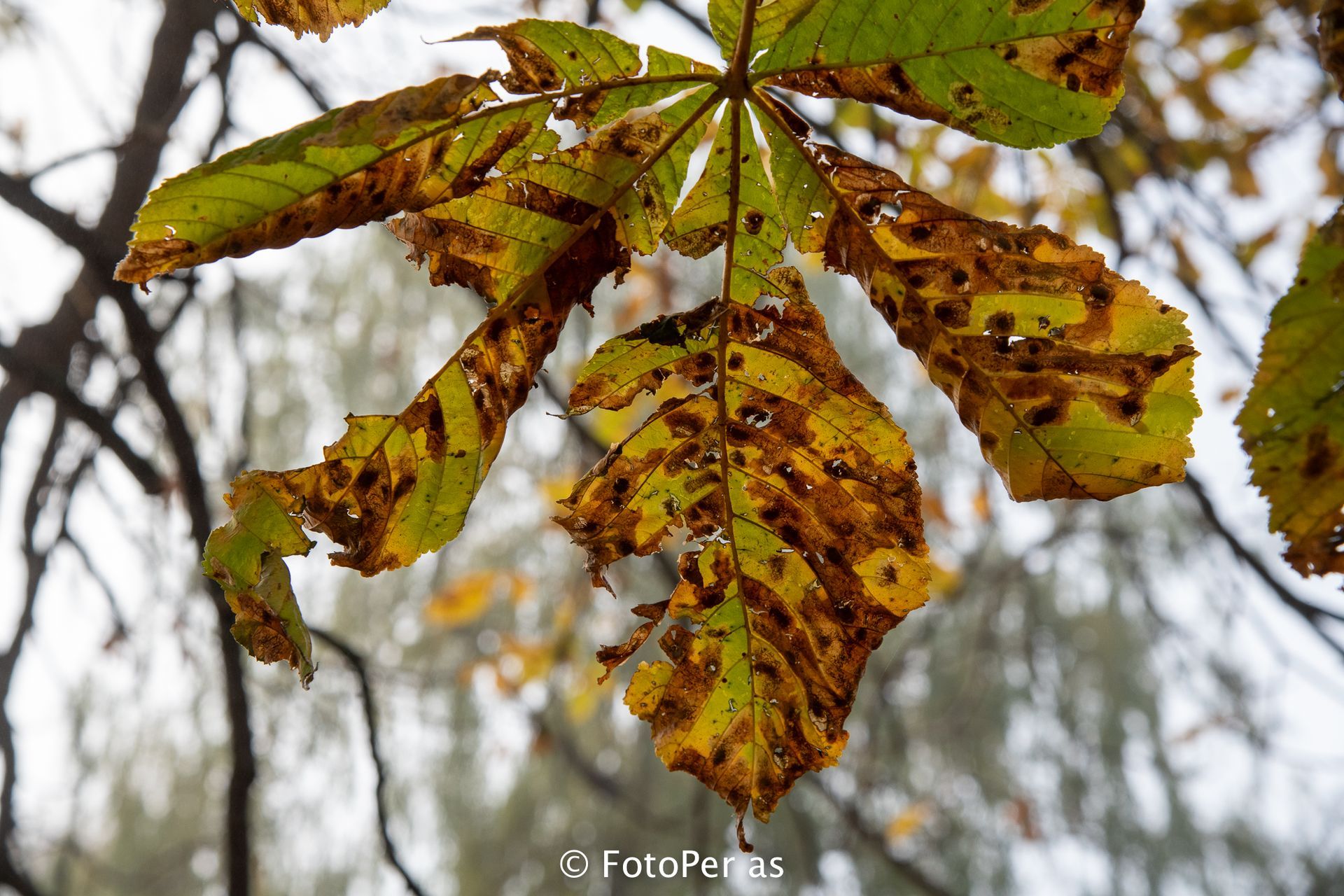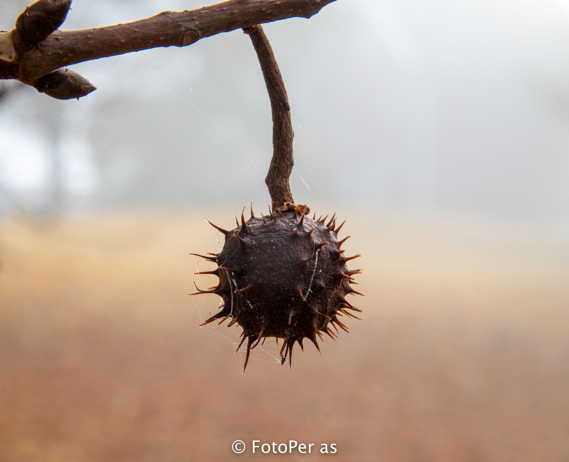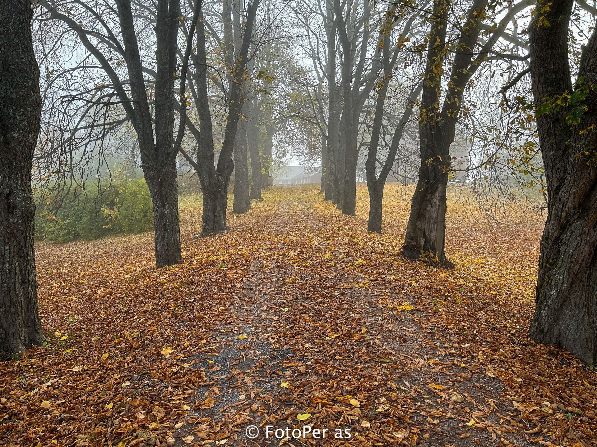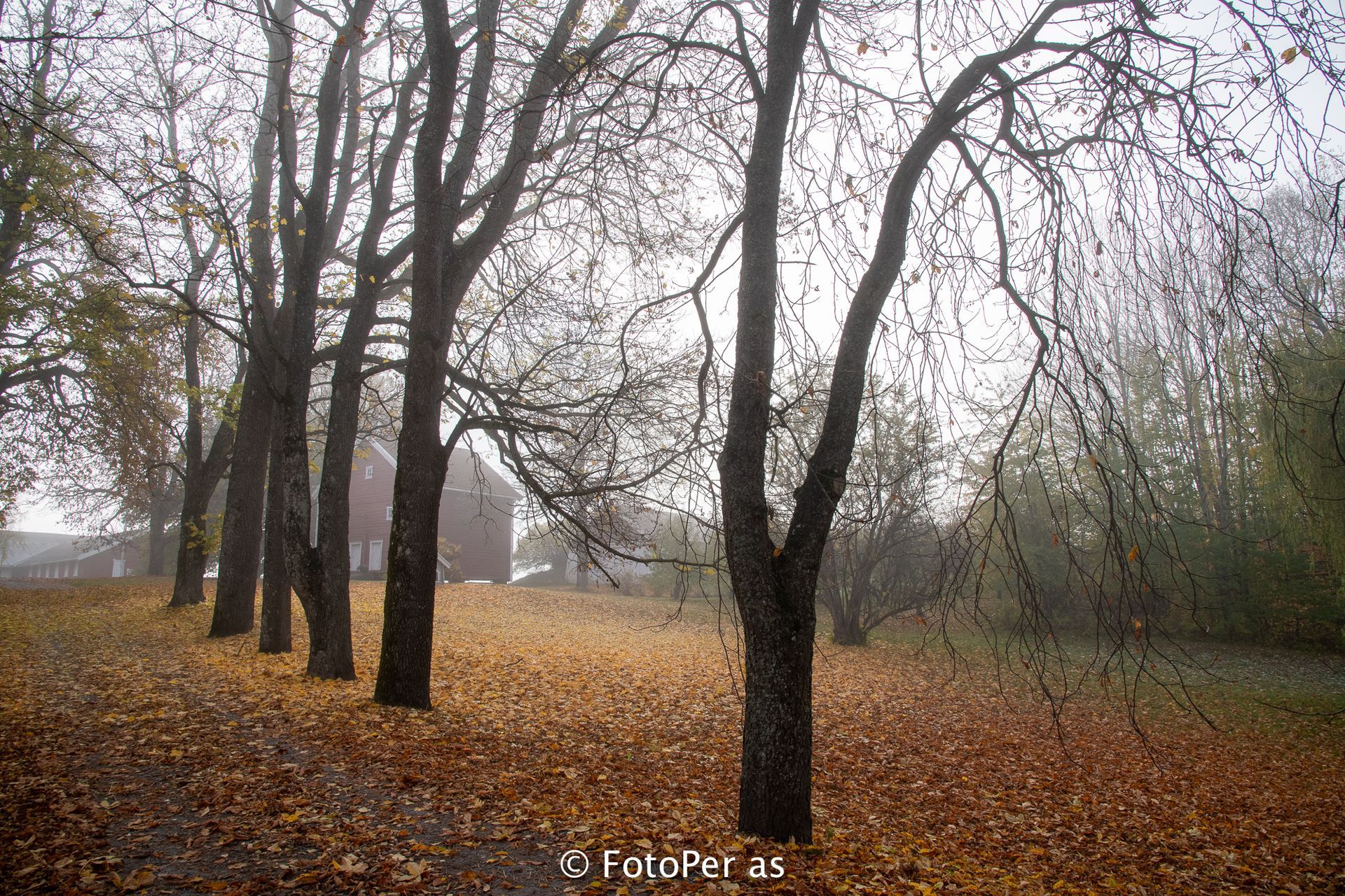 På turen ned fra Ringkollen ser jeg at tåka har lettet noe, det er hull i den. Spennende lys og motiver når det er sånn også. Ved Hesselberg kommer sola nesten gjennom tåka. De flotte trærne i alléen har heldigvis ikke blitt skadet av stormen. Løvet ligger som et teppe på bakken. Mens jeg står der, faller det hele tiden ned blader. Store mengder nøtter ligger også på bakken.