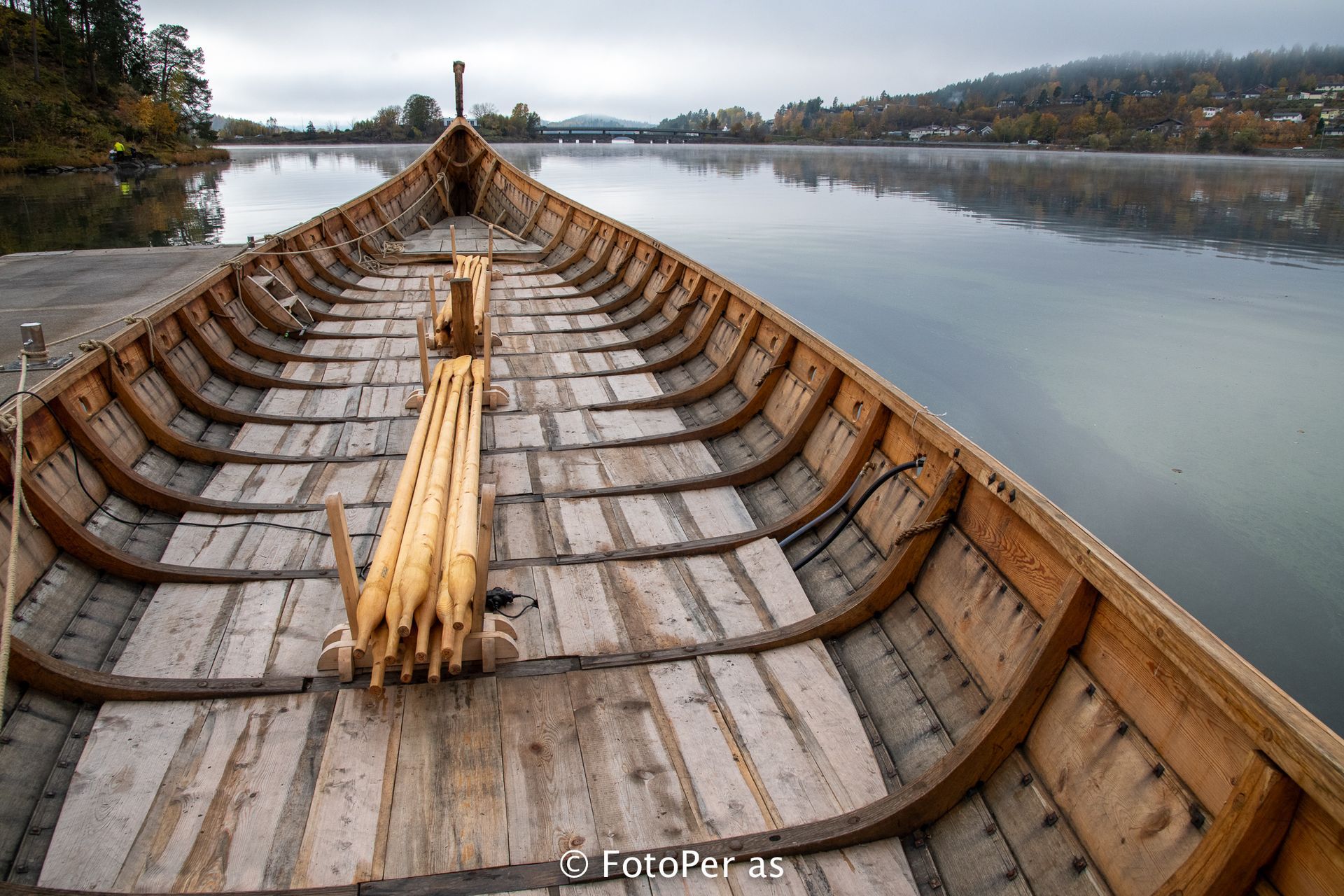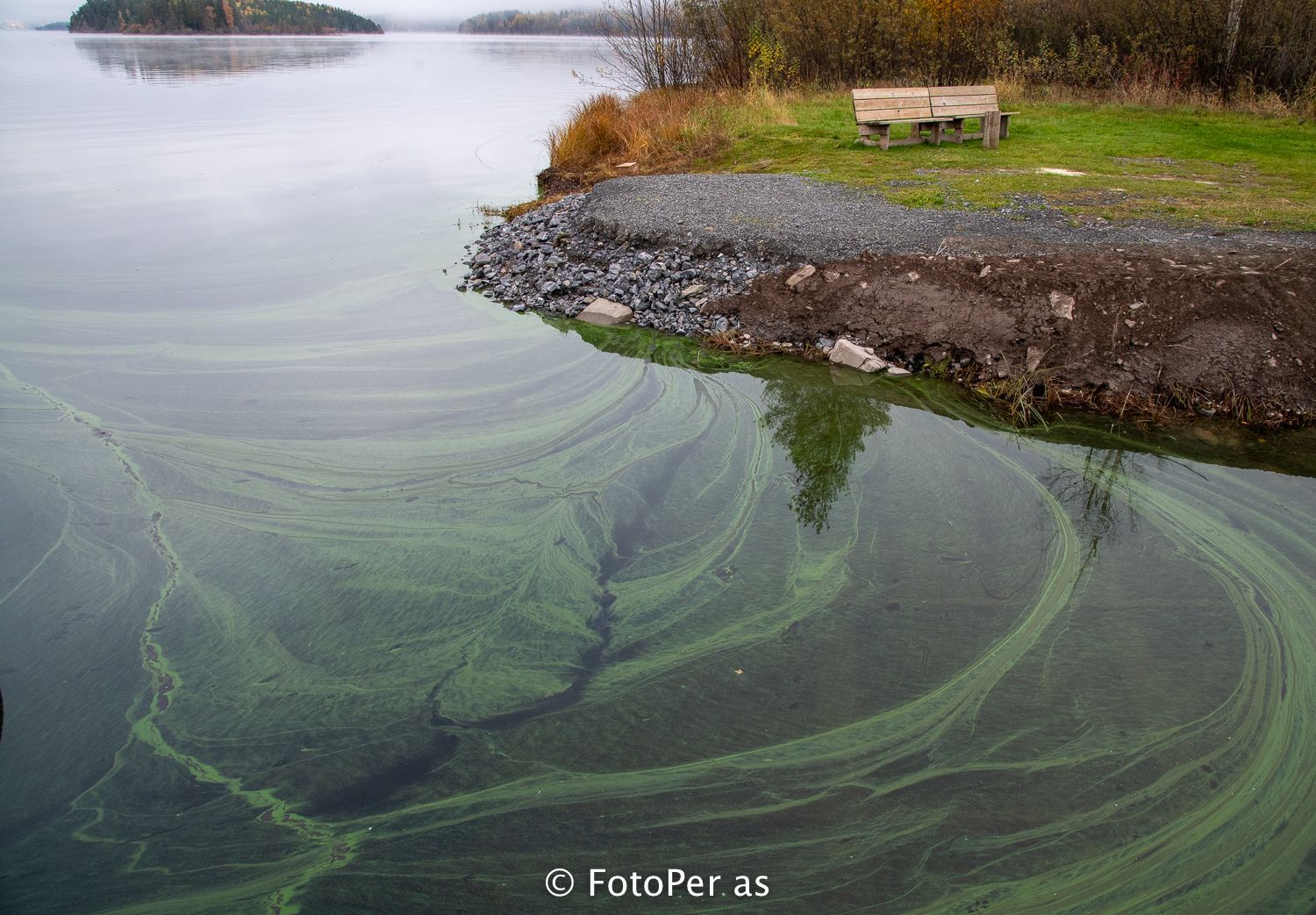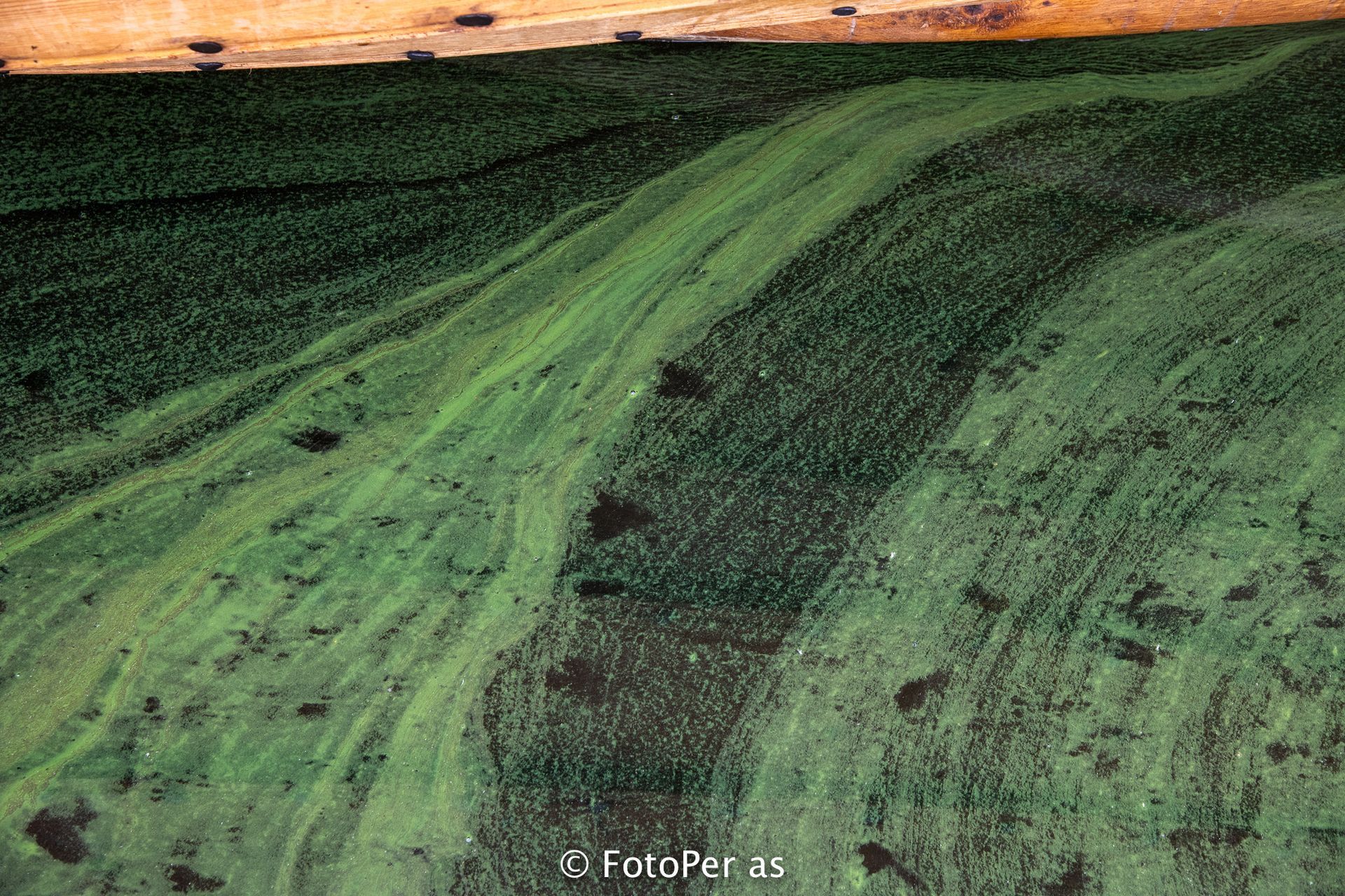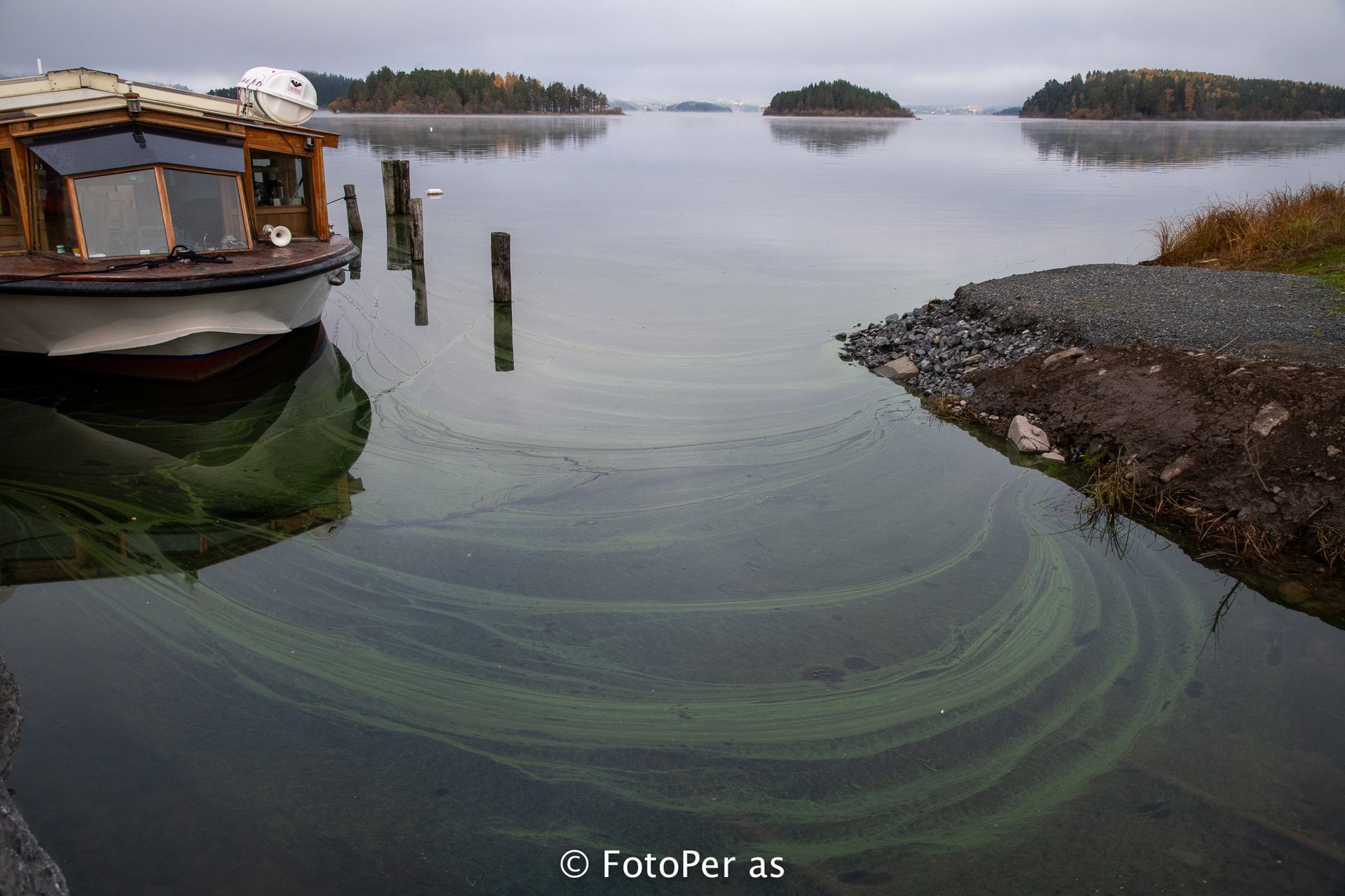 Nei, jeg må videre på dagens høsttur. Jeg har fotografert vikingskipet Dronning Åsta i sol, nå har jeg muligheten i tåka. Når jeg kommer ned dit, ser jeg at vannet er ganske grønt. Det er alger, og er over et stort område.