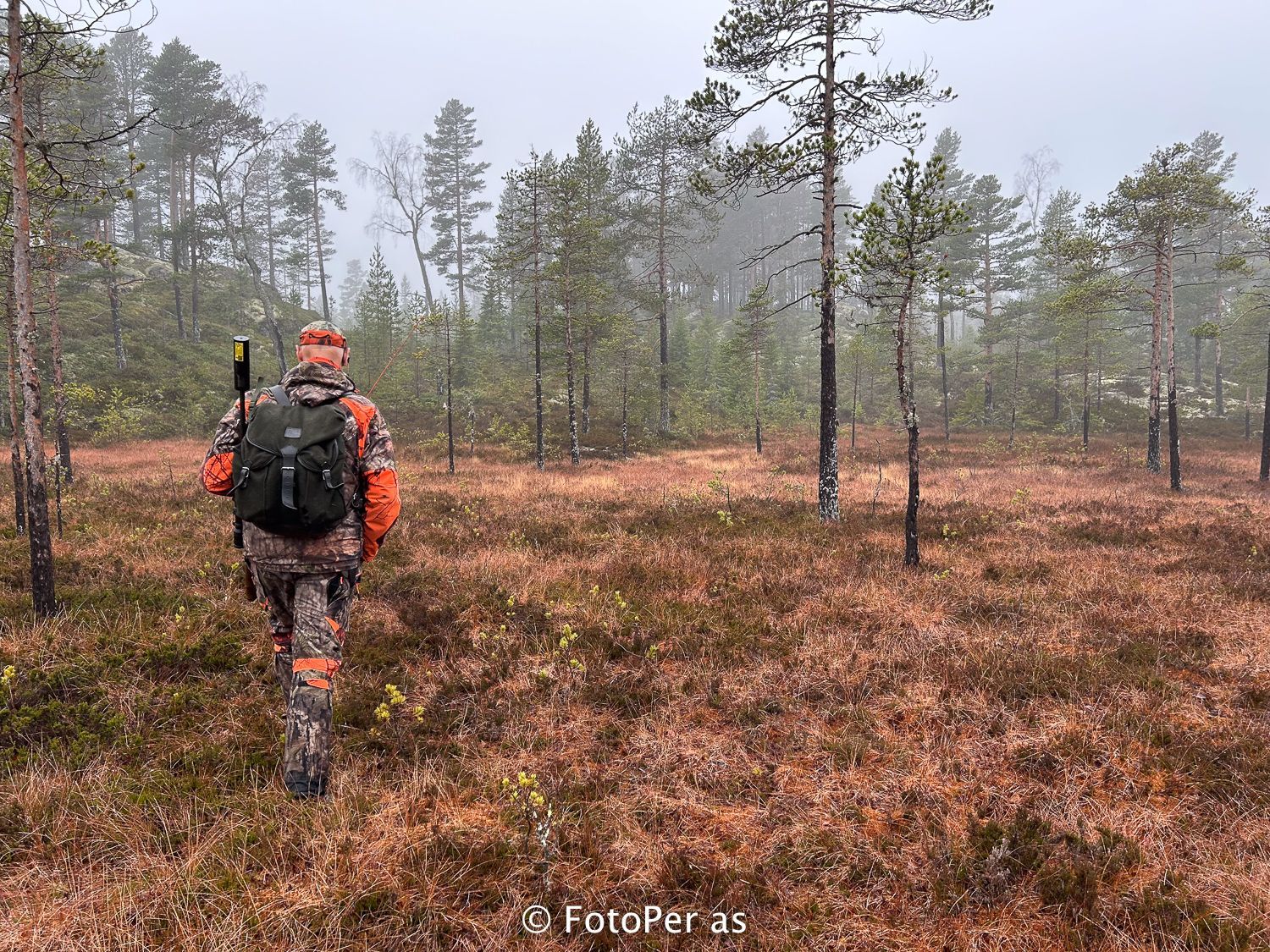 Det er veldige myrete her, og vi plasker oss videre. Gunhild tar noen småturer, men får ikke teften av elg. Hun stopper opp med nesa i sky, men ingen luft treffer henne. Plutselig setter hun opp farten og drar av sted inn i skogen. Kort tid etter hører vi hun har los, og det blinker rødt på trackeren til Elling. Hva skjer nå? Vi står stille og venter. Det begynner å bli ettermiddag, tåka henger over oss, og det blir fort og tidlig mørkt i dag. Så stopper losen. Det er like greit, mener Elling. Når det blir mørkt kan det være ugreit med Gunhild på los.