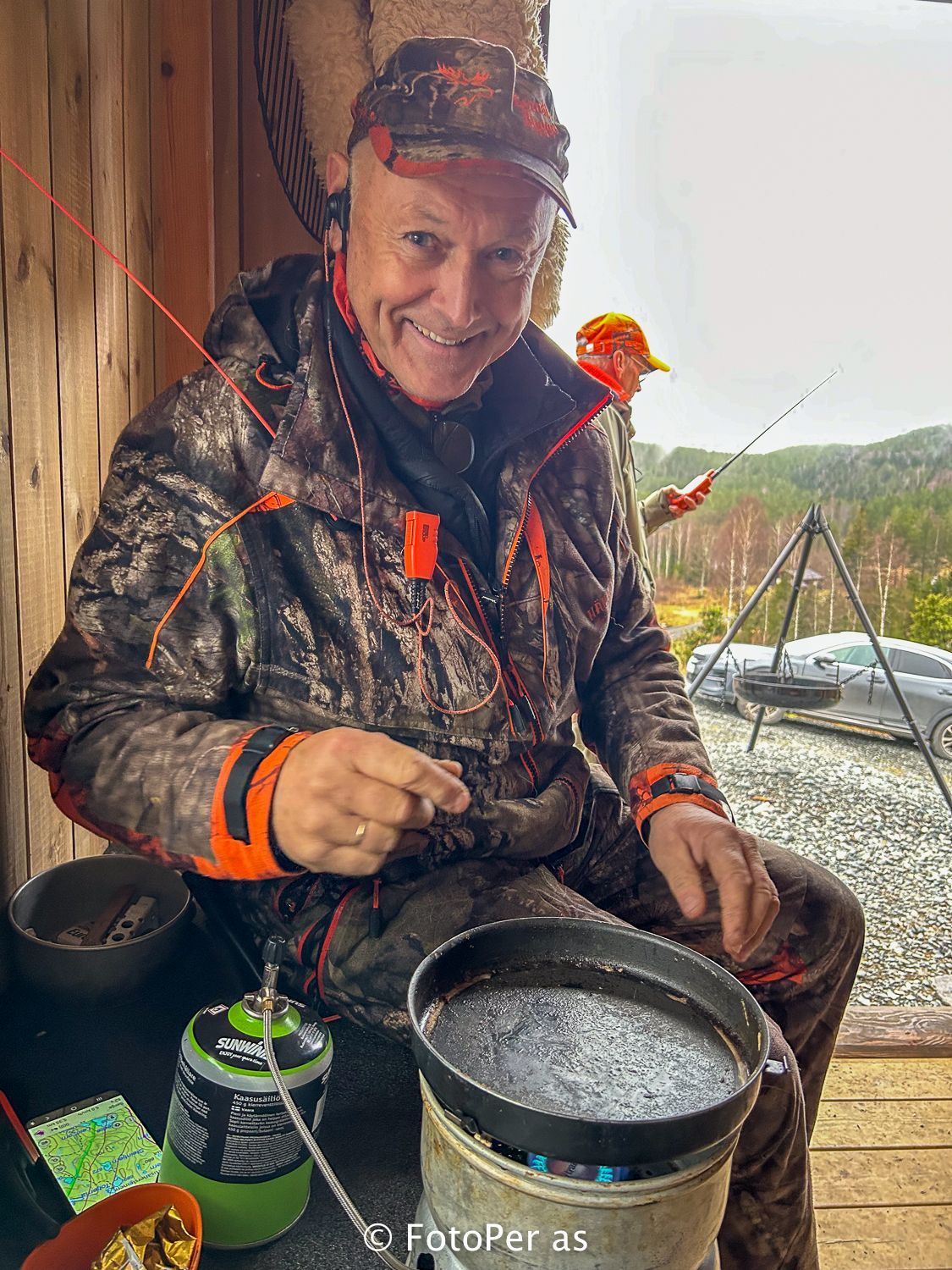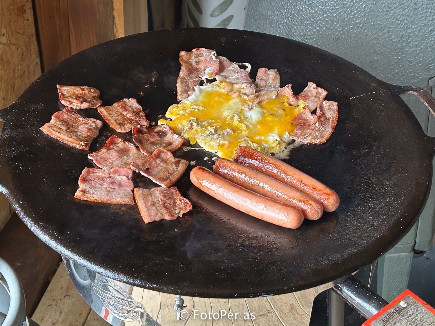 Olaf Elling har som alltid med sin egen primus og er snart klar med egg og bacon på brødskiva.