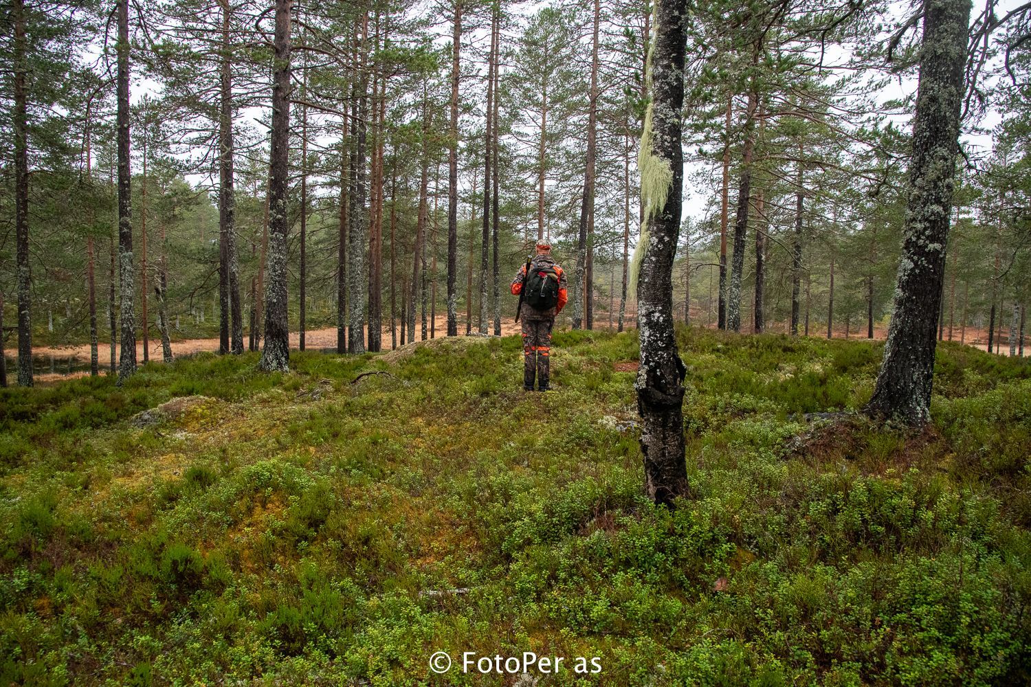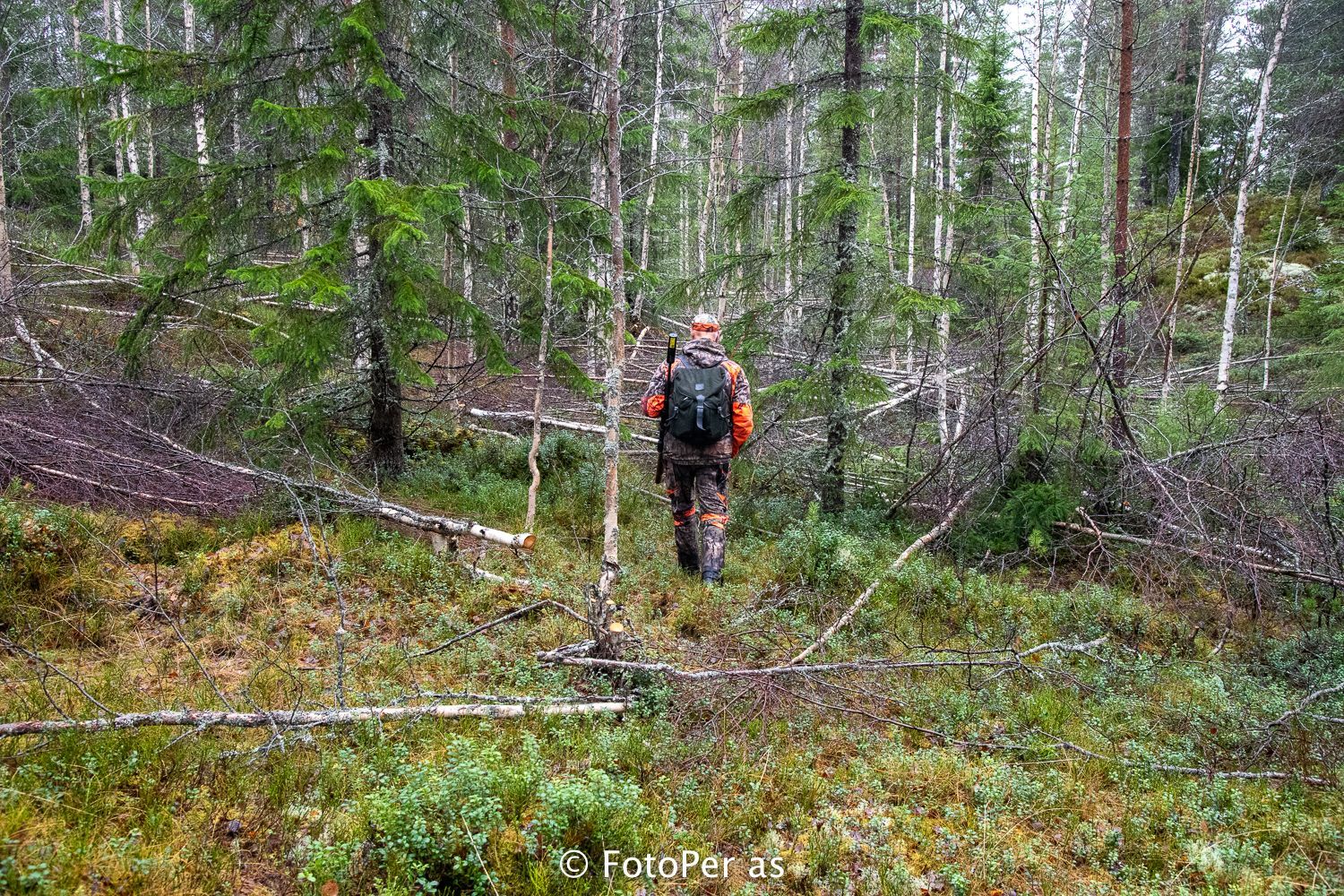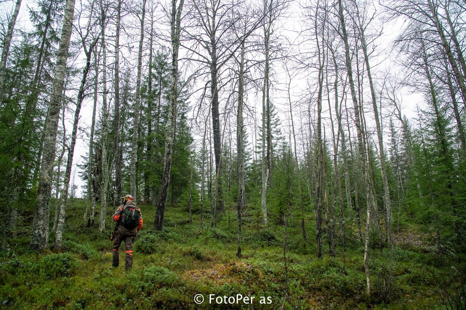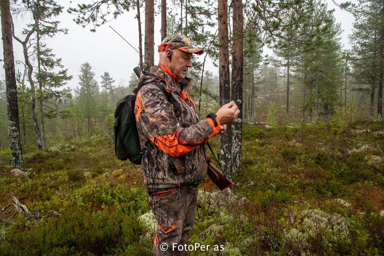 Olaf Elling (OE) og jeg kjører forbi Saksentjernsetra og videre innover før vi parkerer. Hero vet hva han skal på, han bjeffer bak i buret så vi nesten ikke kan snakke sammen. Før han slippes løs må han få på seg gps-båndet, og OE må få sjekket at han har kontakt med bikkja. OE finner fram rifla og gjør den klar. Nå kan Hero slippes løs, og han raser rundt oss i full fart. Snart roer det seg ned og han snuser på bakken etter lukt av elg.