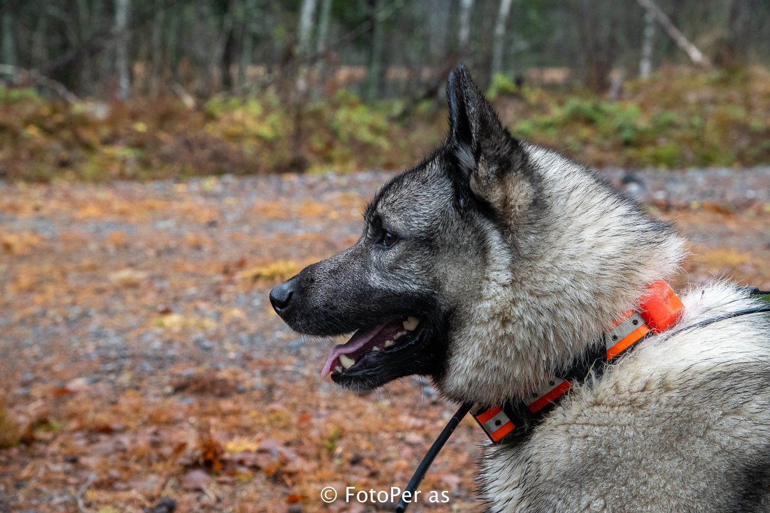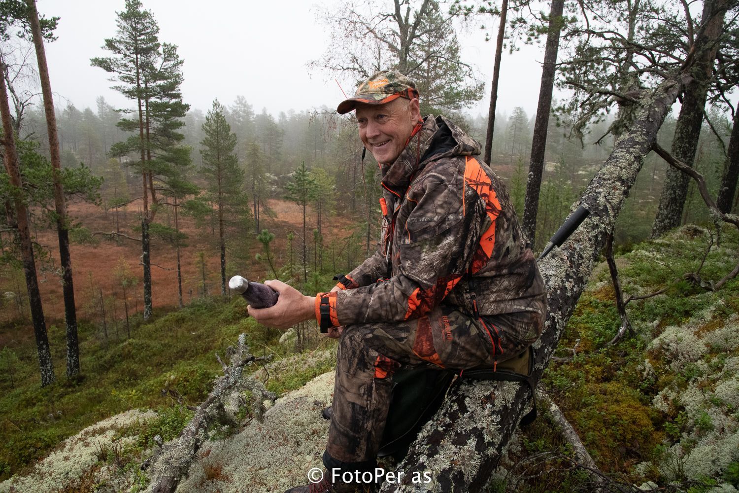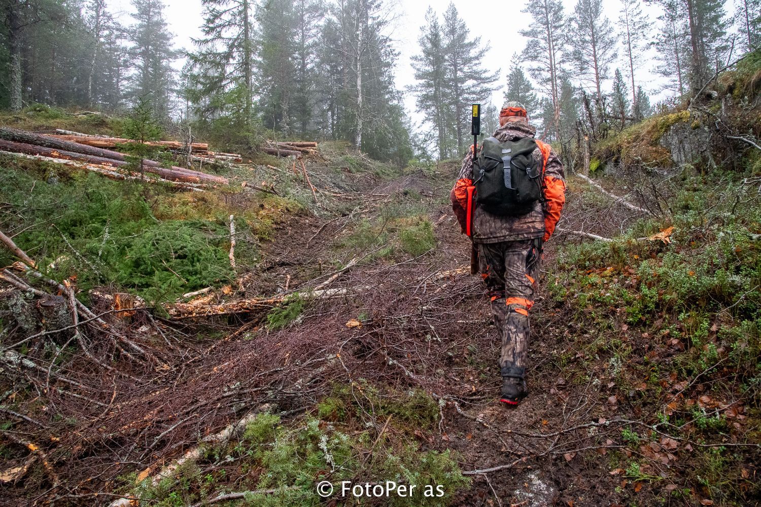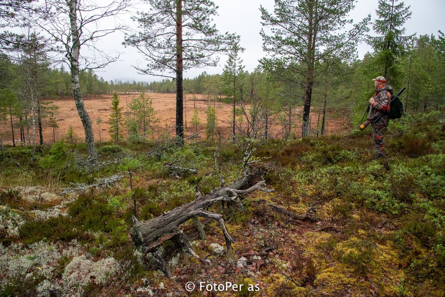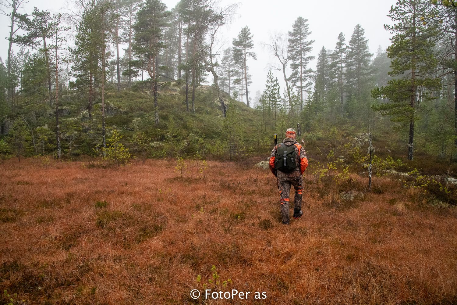 Olaf Elling (OE) og jeg kjører forbi Saksentjernsetra og videre innover før vi parkerer. Hero vet hva han skal på, han bjeffer bak i buret så vi nesten ikke kan snakke sammen. Før han slippes løs må han få på seg gps-båndet, og OE må få sjekket at han har kontakt med bikkja. OE finner fram rifla og gjør den klar. Nå kan Hero slippes løs, og han raser rundt oss i full fart. Snart roer det seg ned og han snuser på bakken etter lukt av elg.