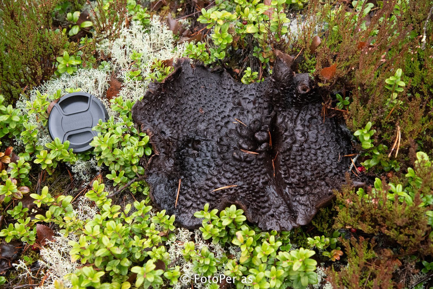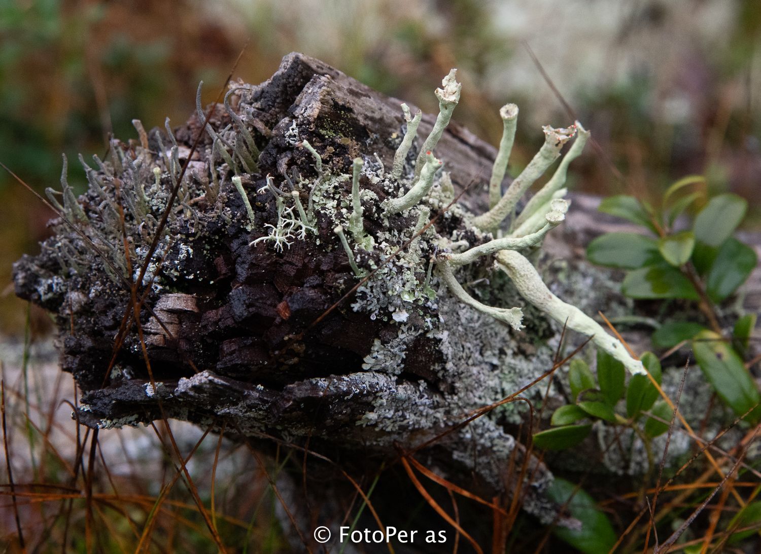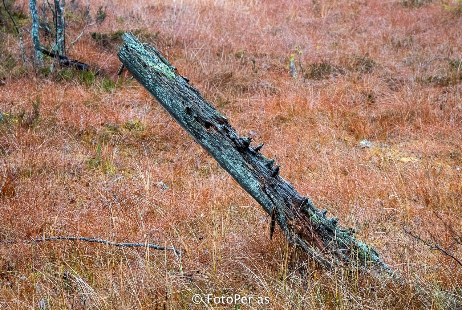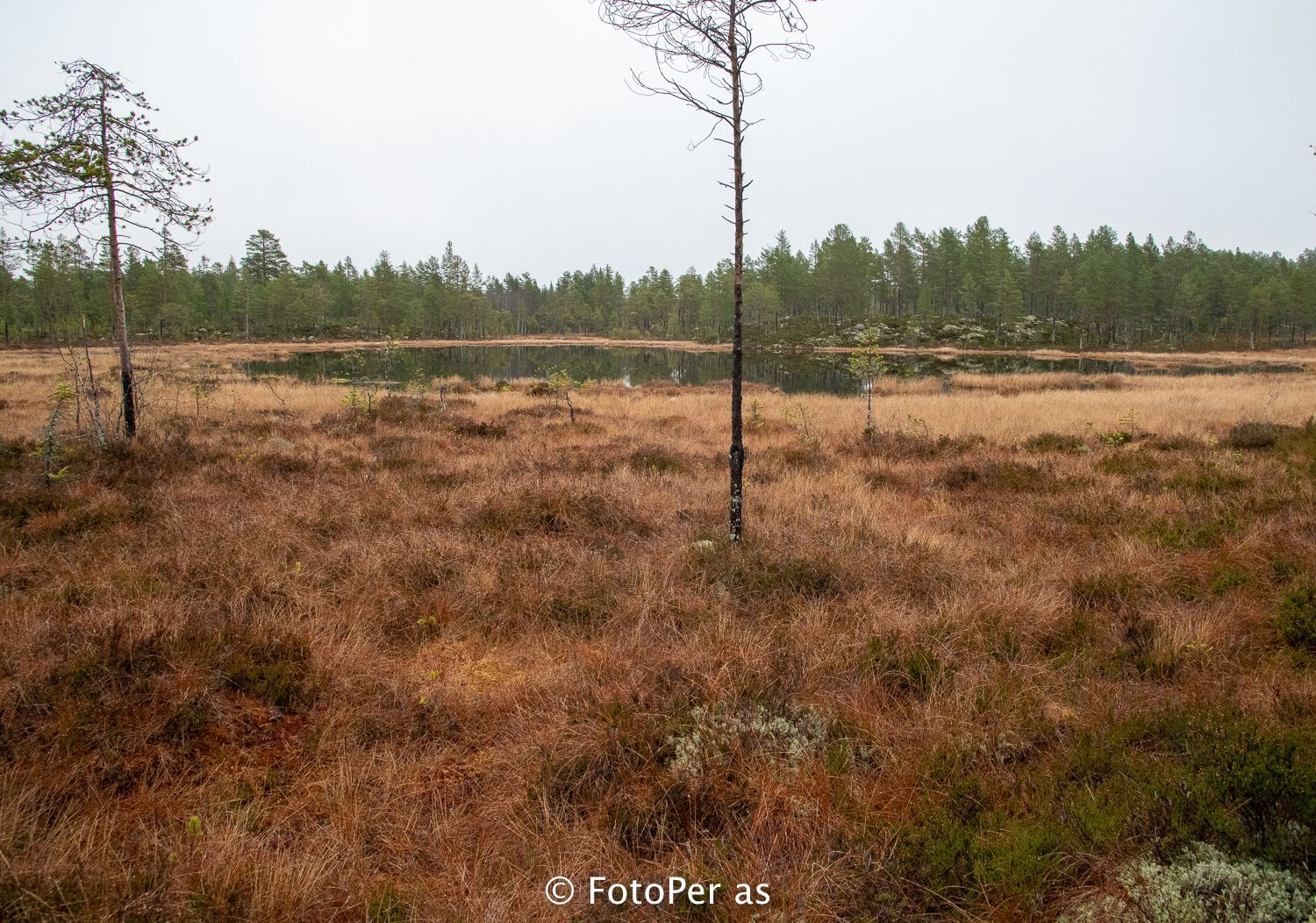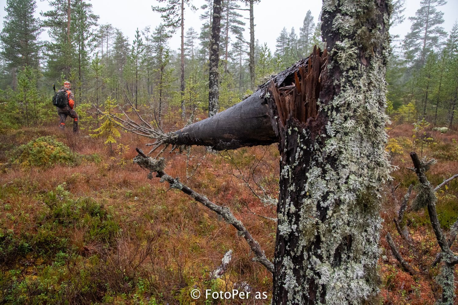 Kommer ut på en tange i furuskauen, med et tjern og myr rundt. -Her var det en elgjeger som hadde post for noen år siden, sier OE. -Han tente opp bål mens han ventet, og slukket det da han gikk. Trodde han. Da han kom tilbake dagen etter viste det seg at bålet hadde blusset opp igjen, alle lyngen var brent opp og trærne var svidde til langt opp på stammen. Det er noen som har flaks, sier OE med et smil.